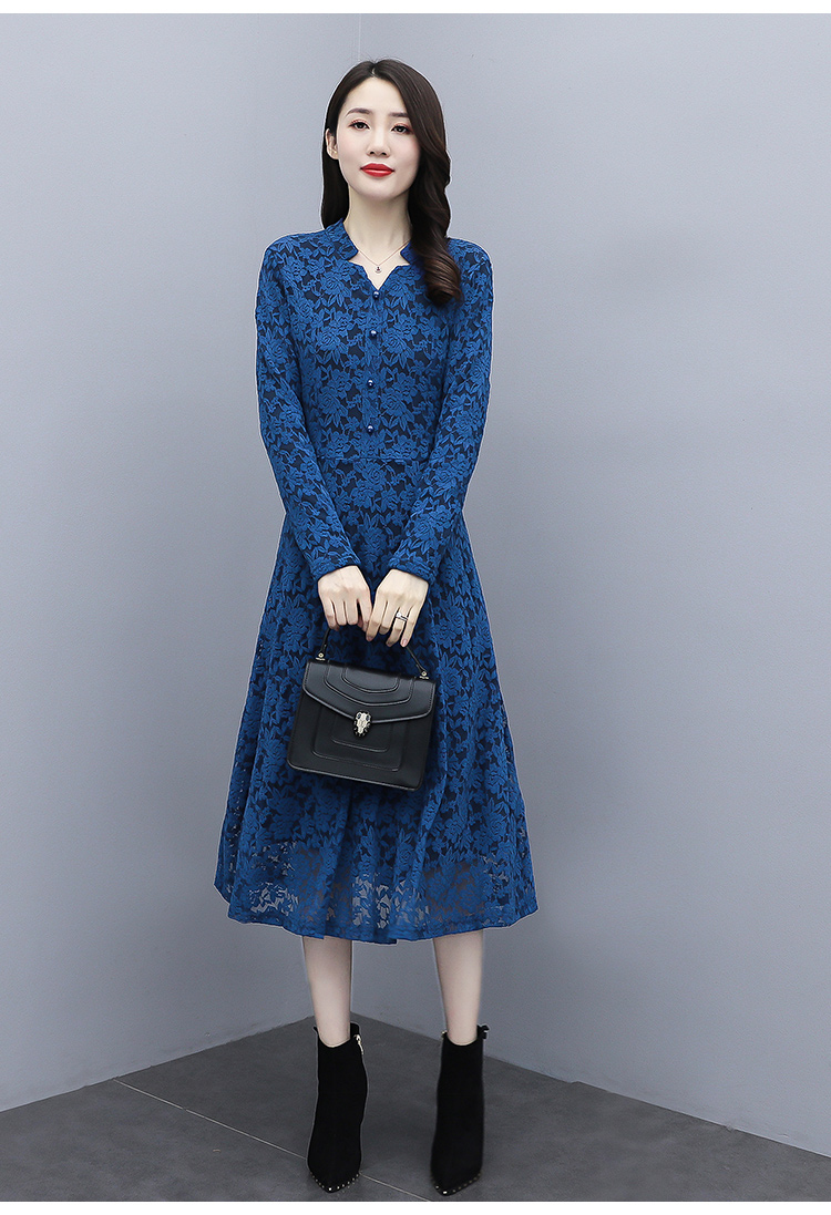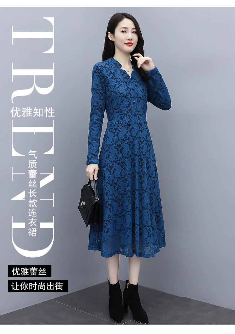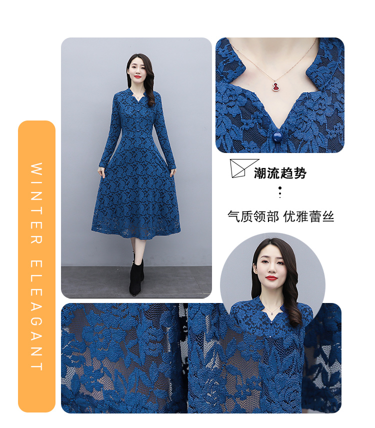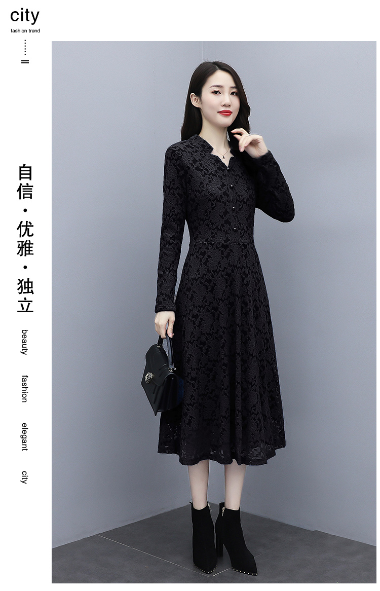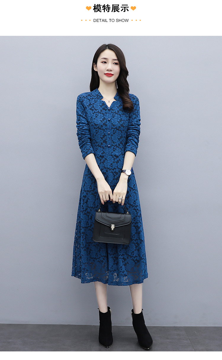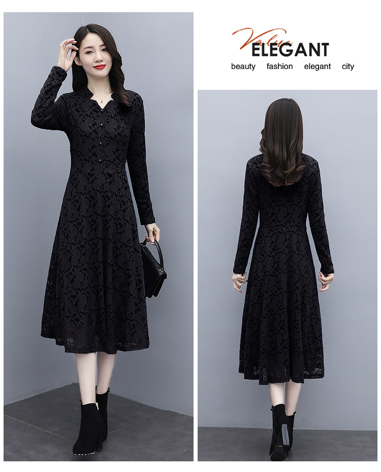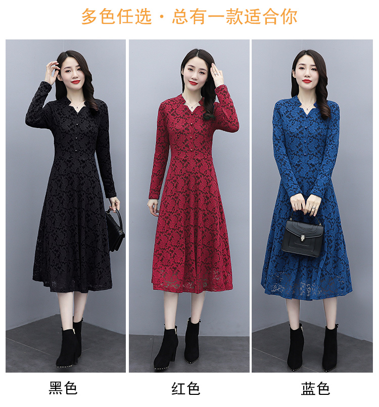 MY15446# 蕾丝连衣裙新款洋气v领显瘦过膝阔太太长裙子潮女裝貨源服裝批發
