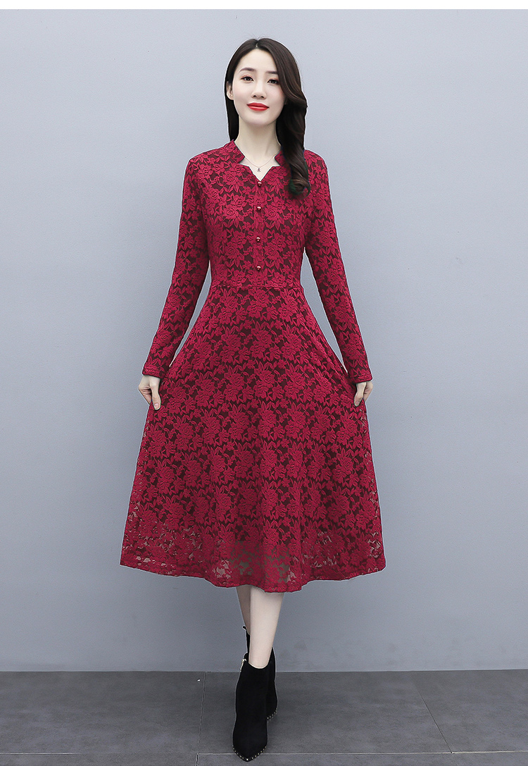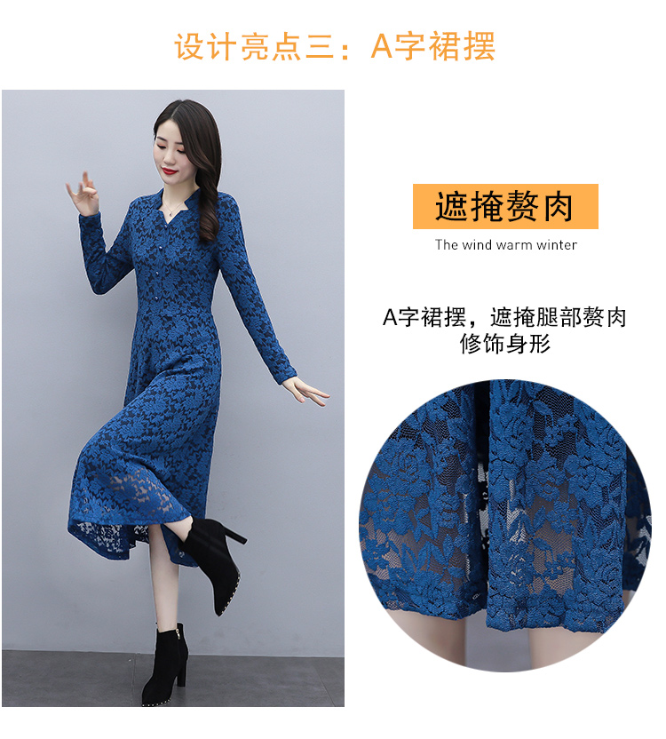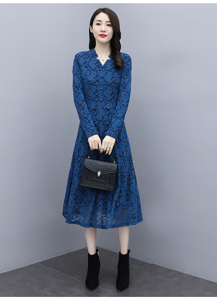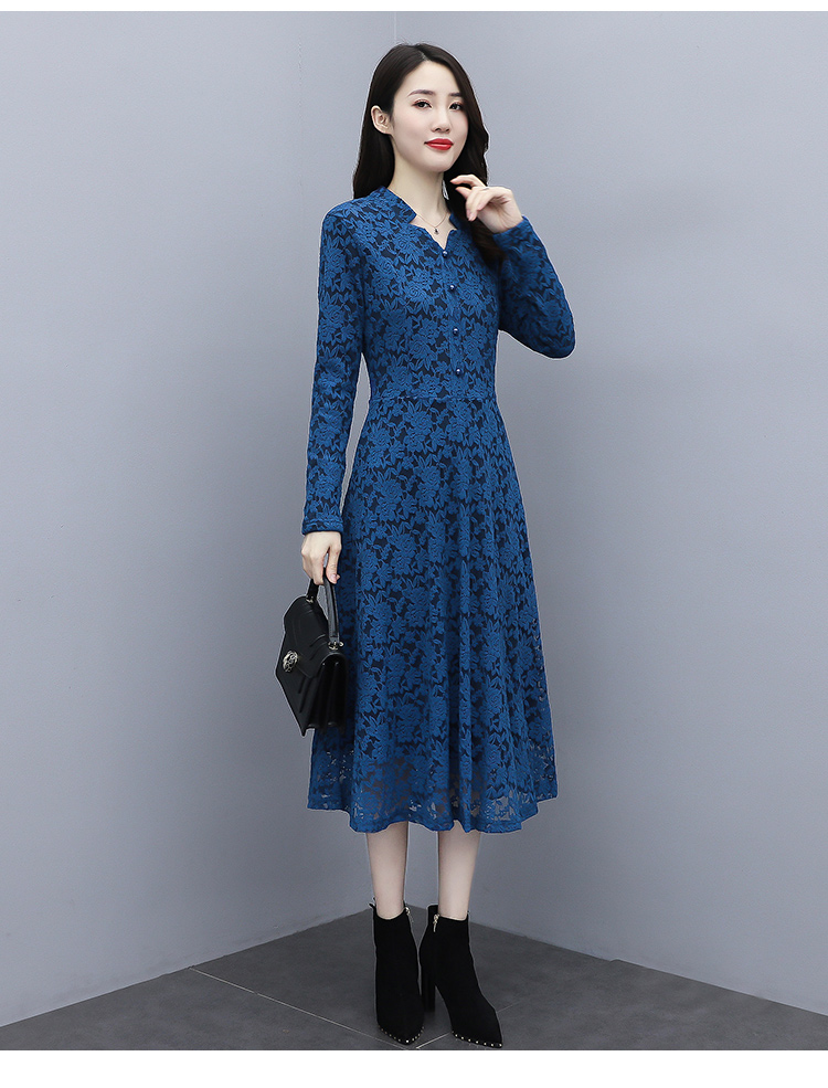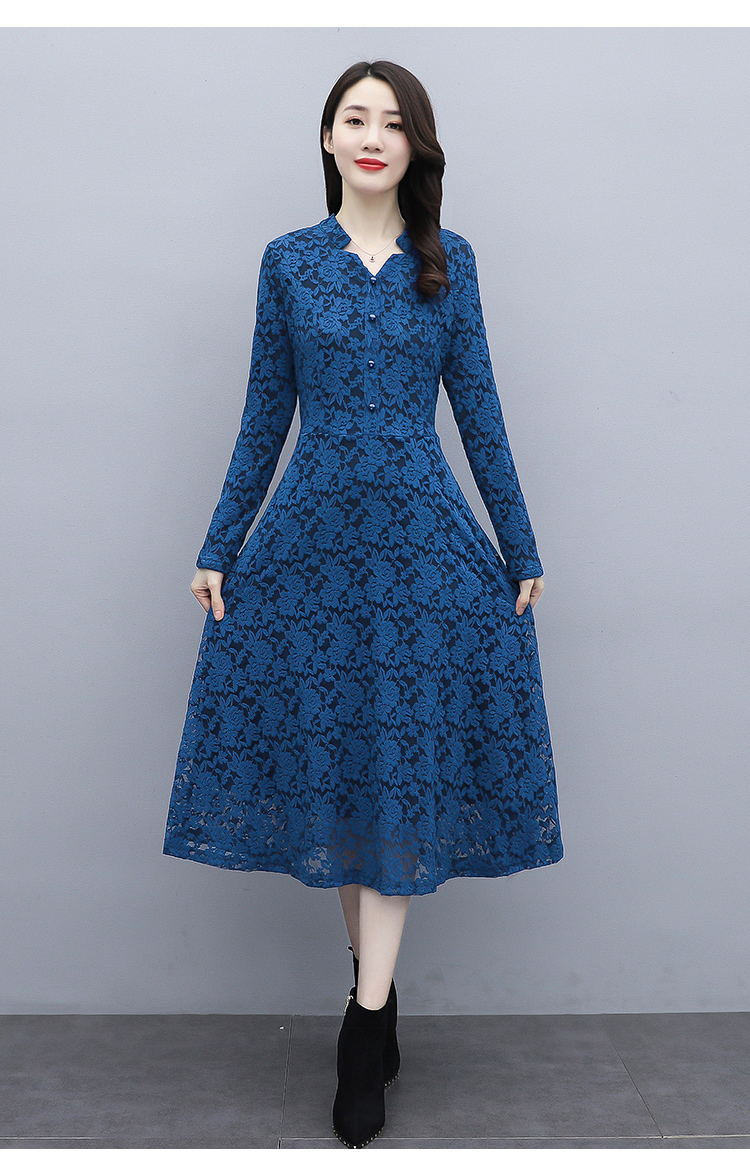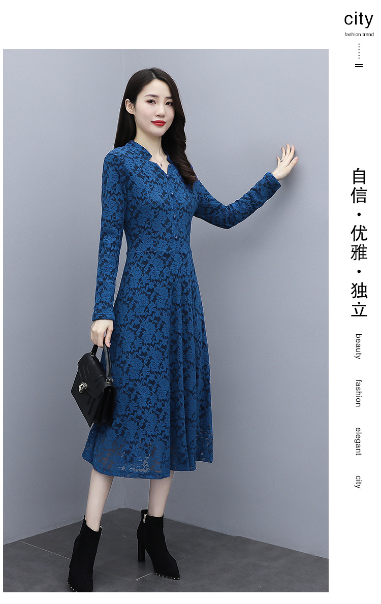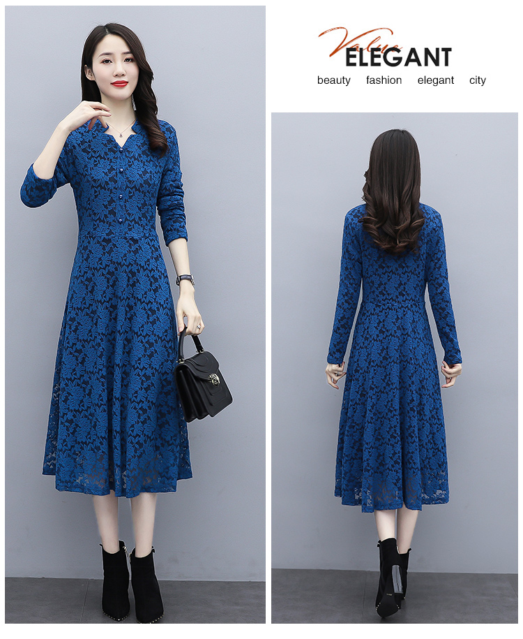 MY15446# 蕾丝连衣裙新款洋气v领显瘦过膝阔太太长裙子潮女裝貨源服裝批發
