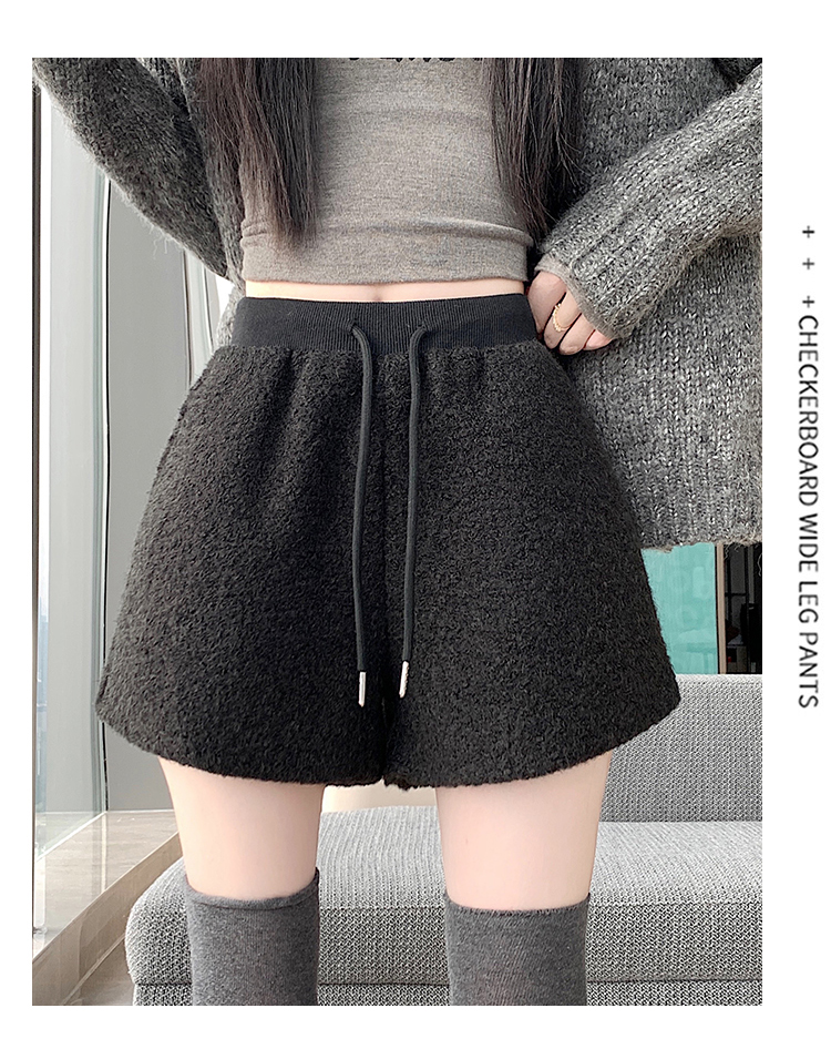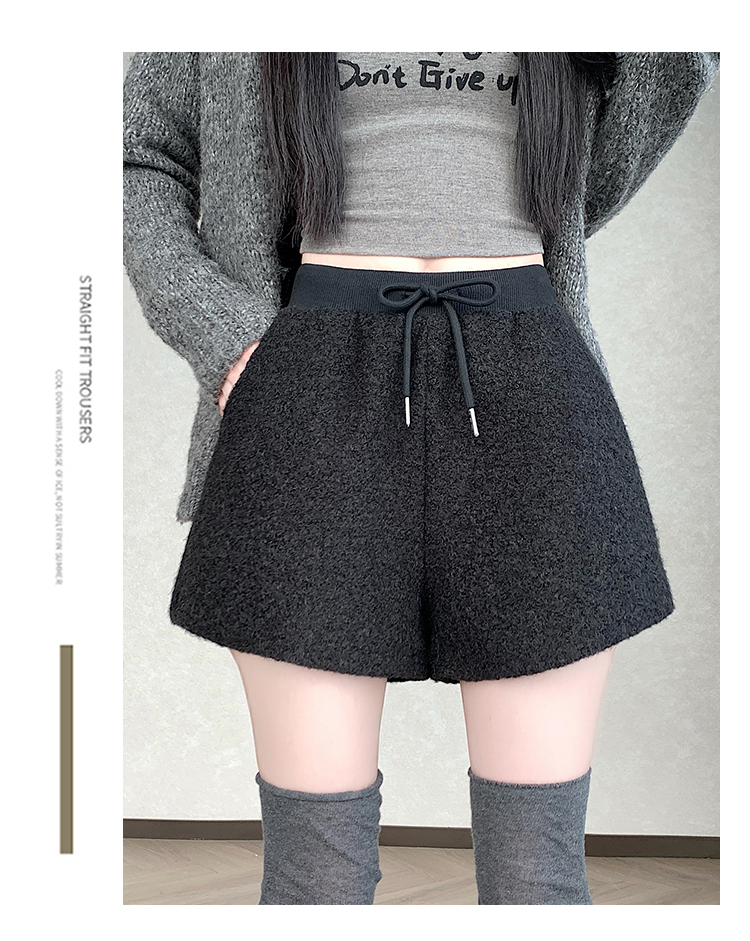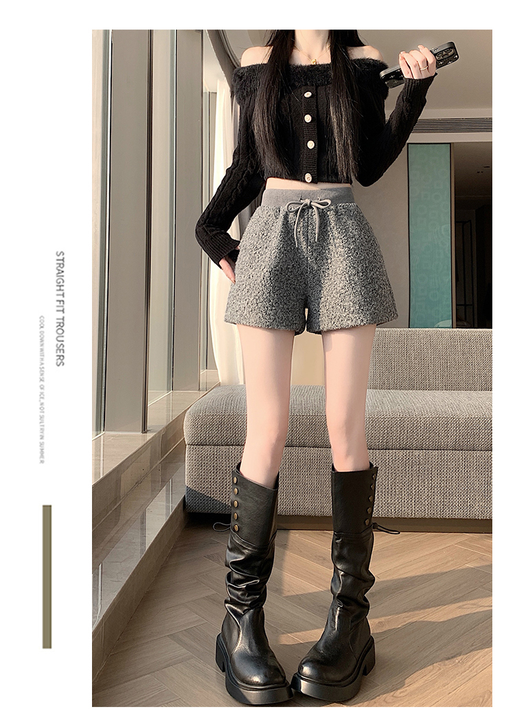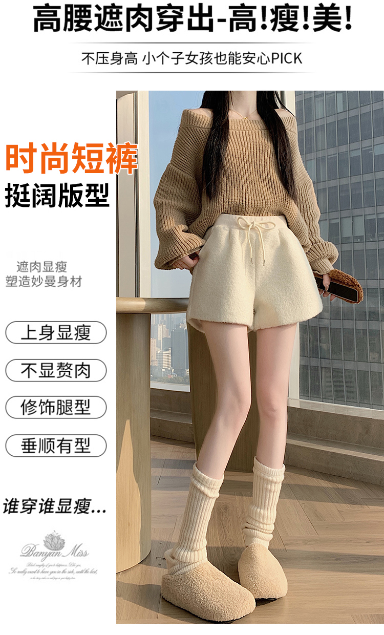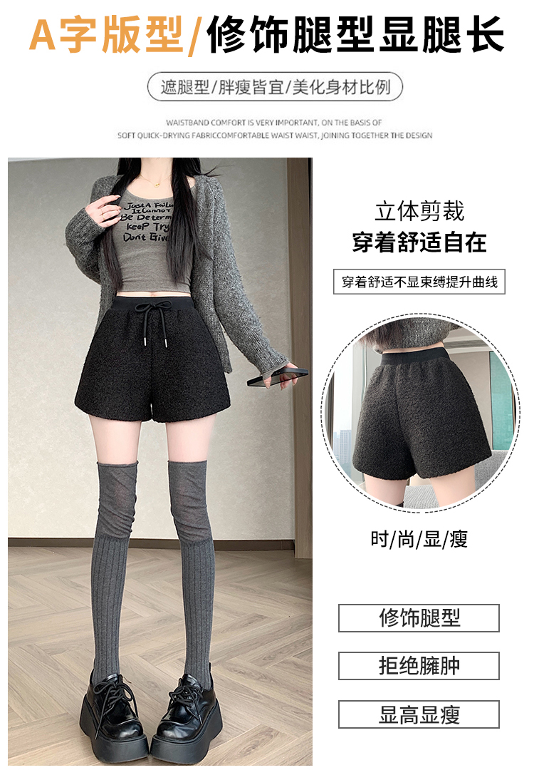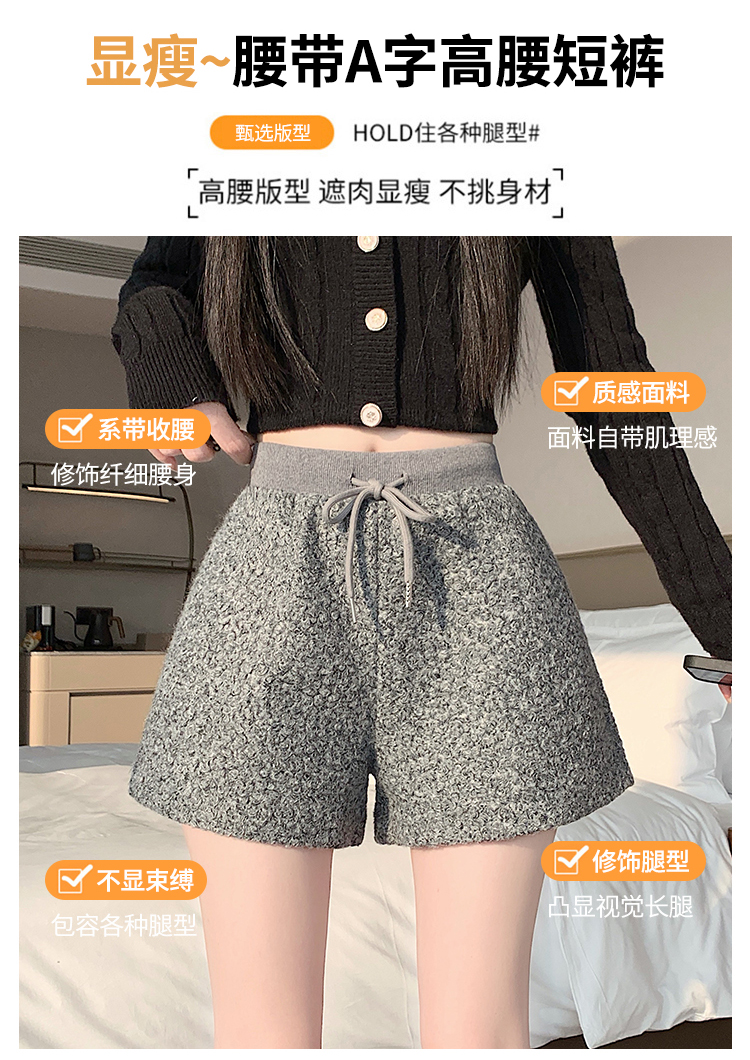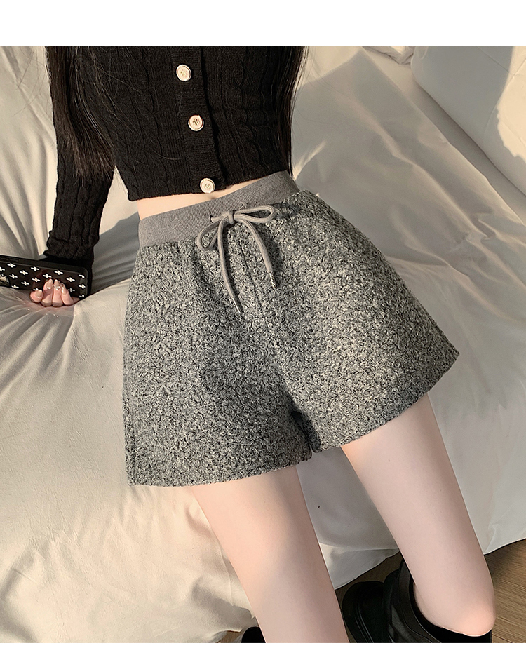 MY15448# 简约气质纯色毛呢抽绳高腰休闲裤小众加厚包臀短裤女裝貨源服裝批發