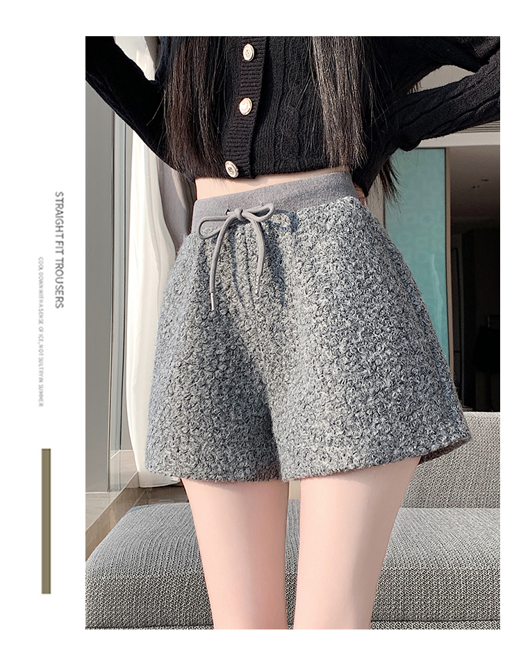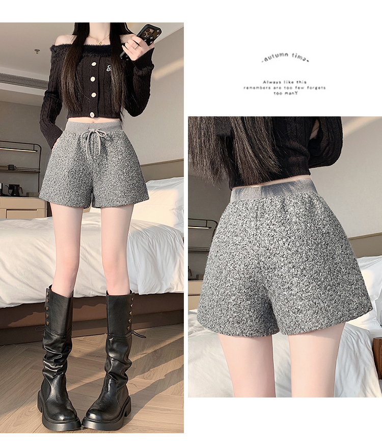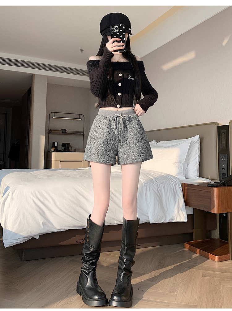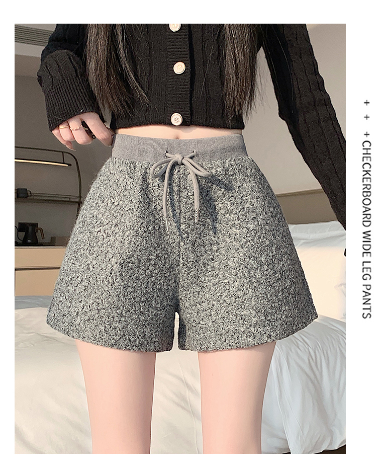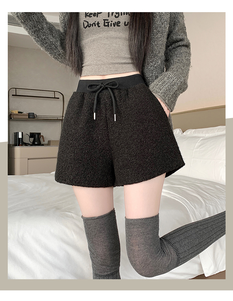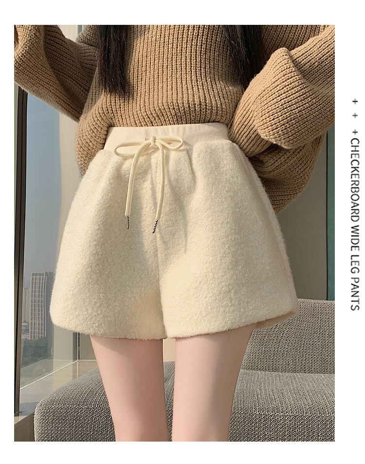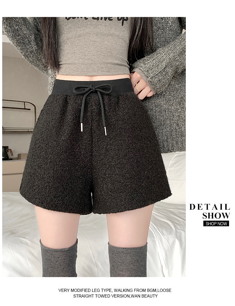 MY15448# 简约气质纯色毛呢抽绳高腰休闲裤小众加厚包臀短裤女裝貨源服裝批發