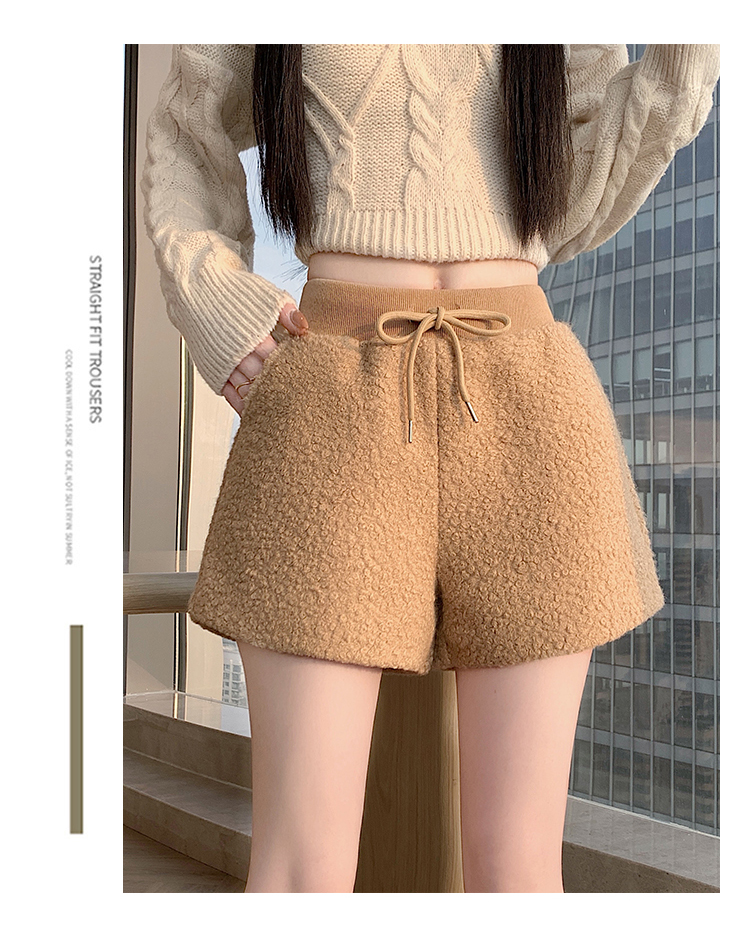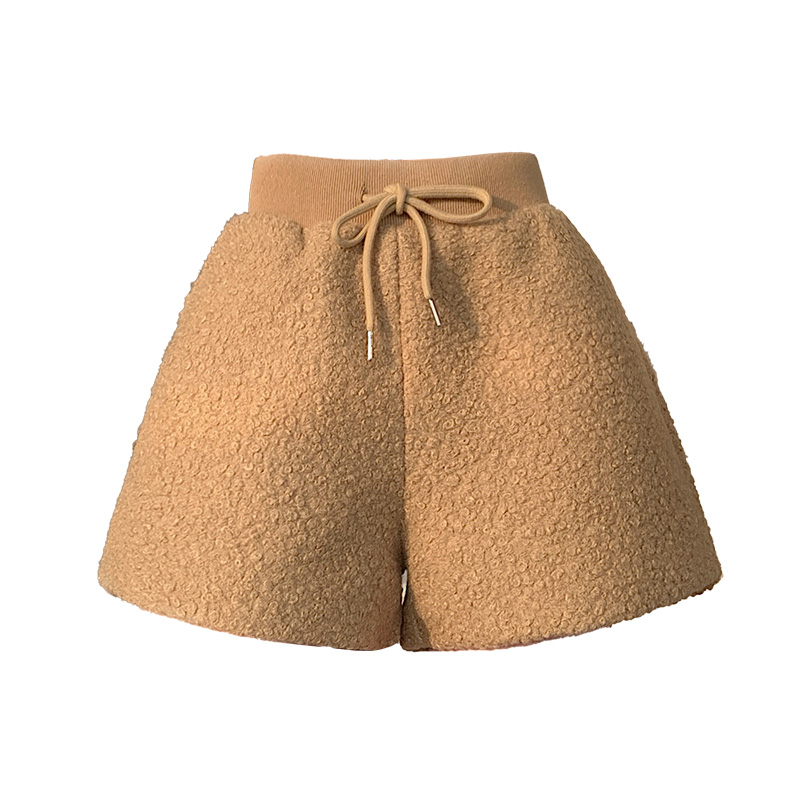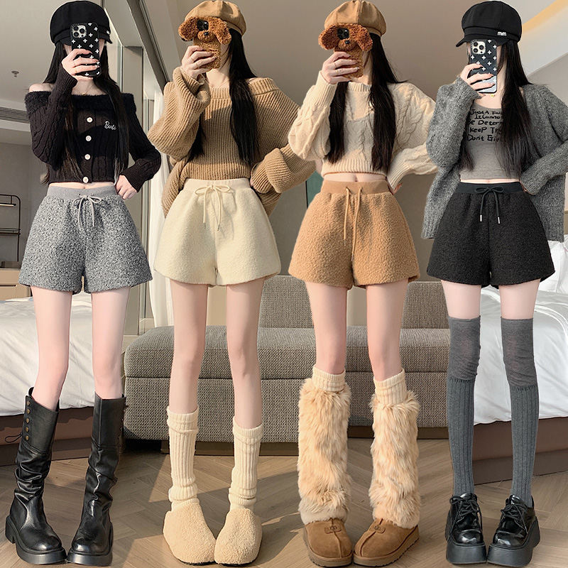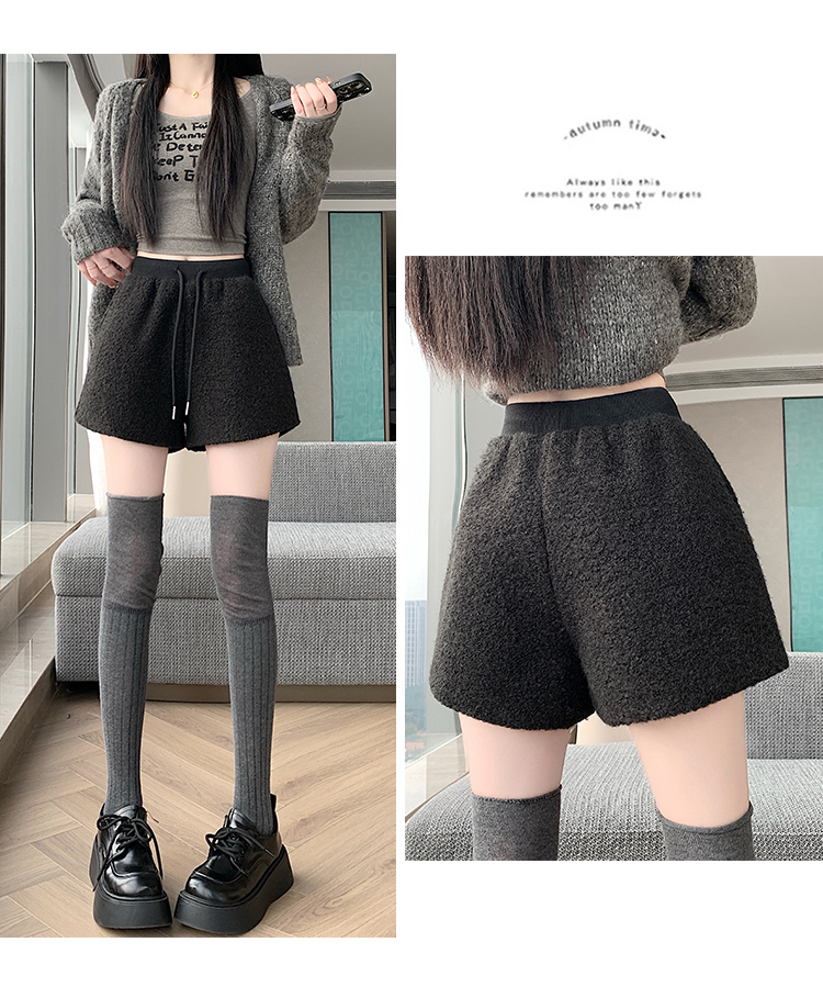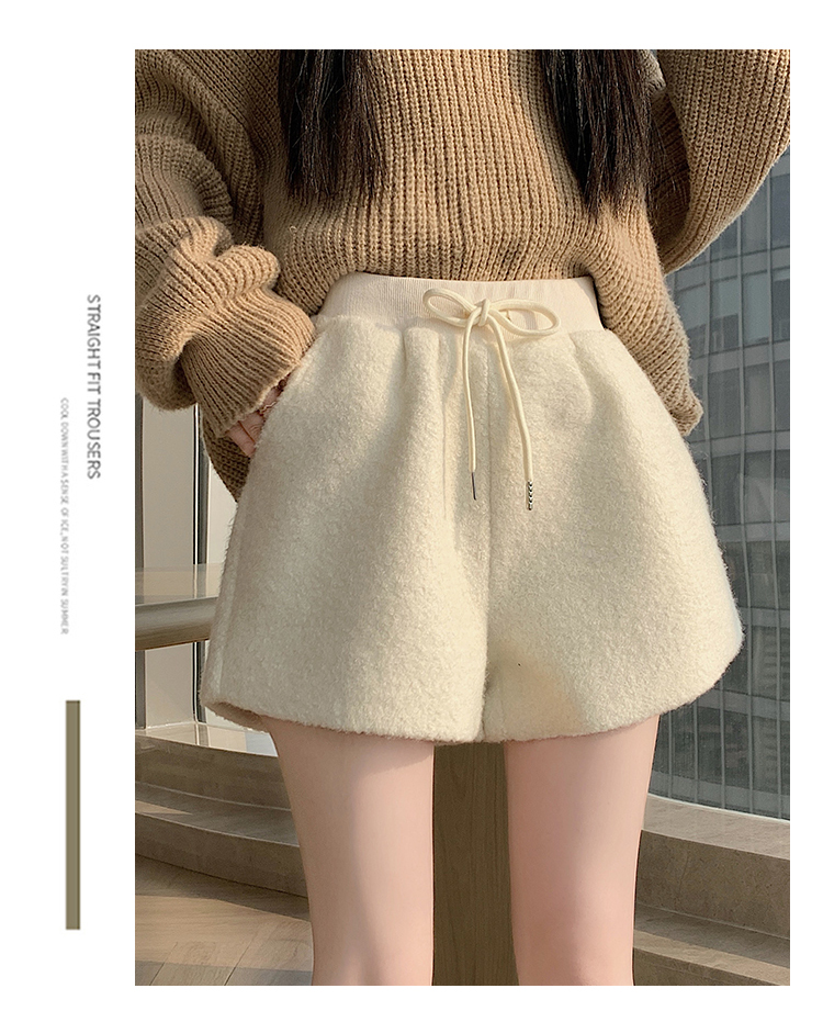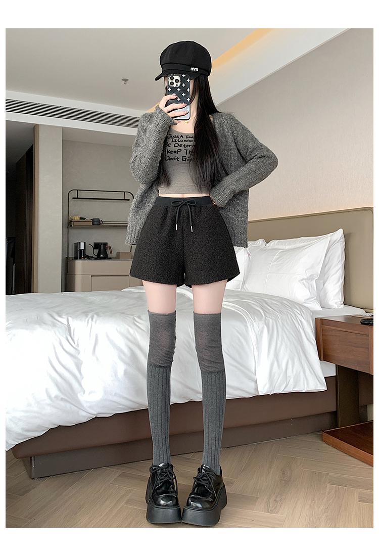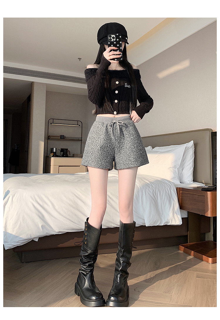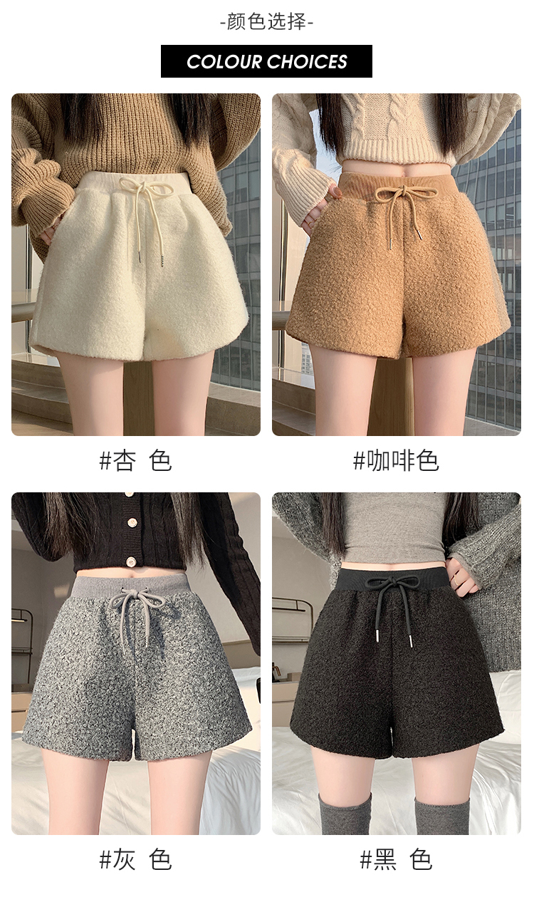 MY15448# 简约气质纯色毛呢抽绳高腰休闲裤小众加厚包臀短裤女裝貨源服裝批發