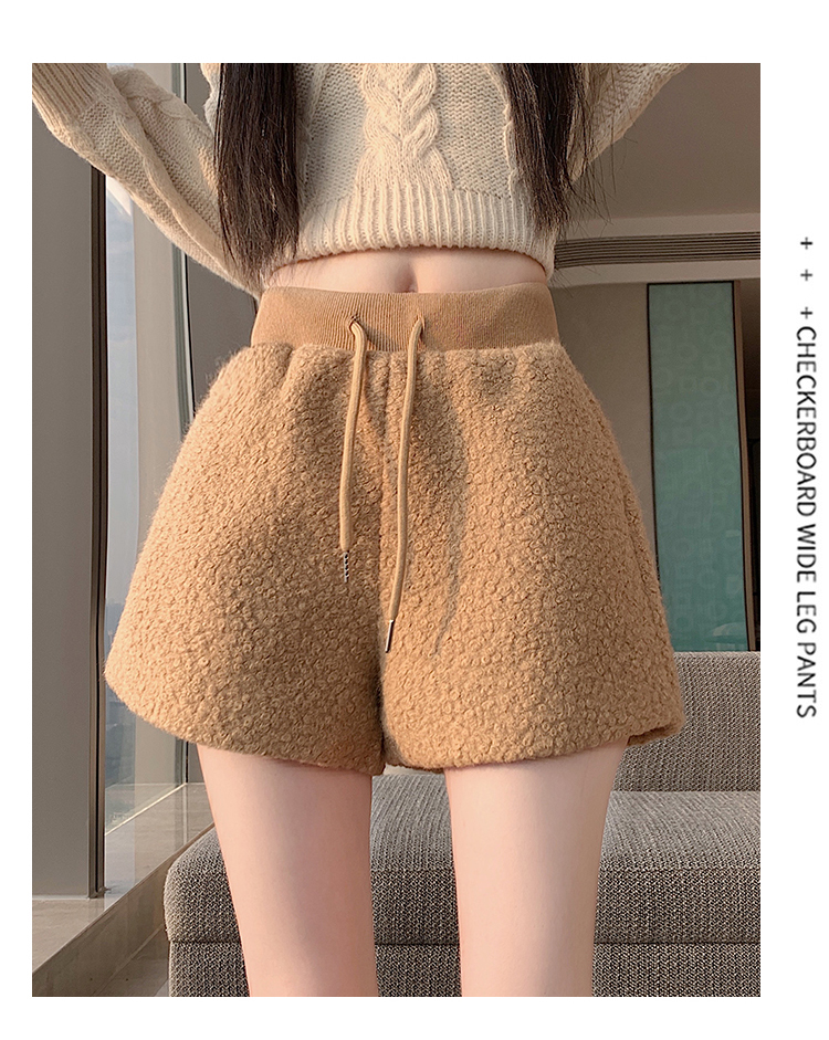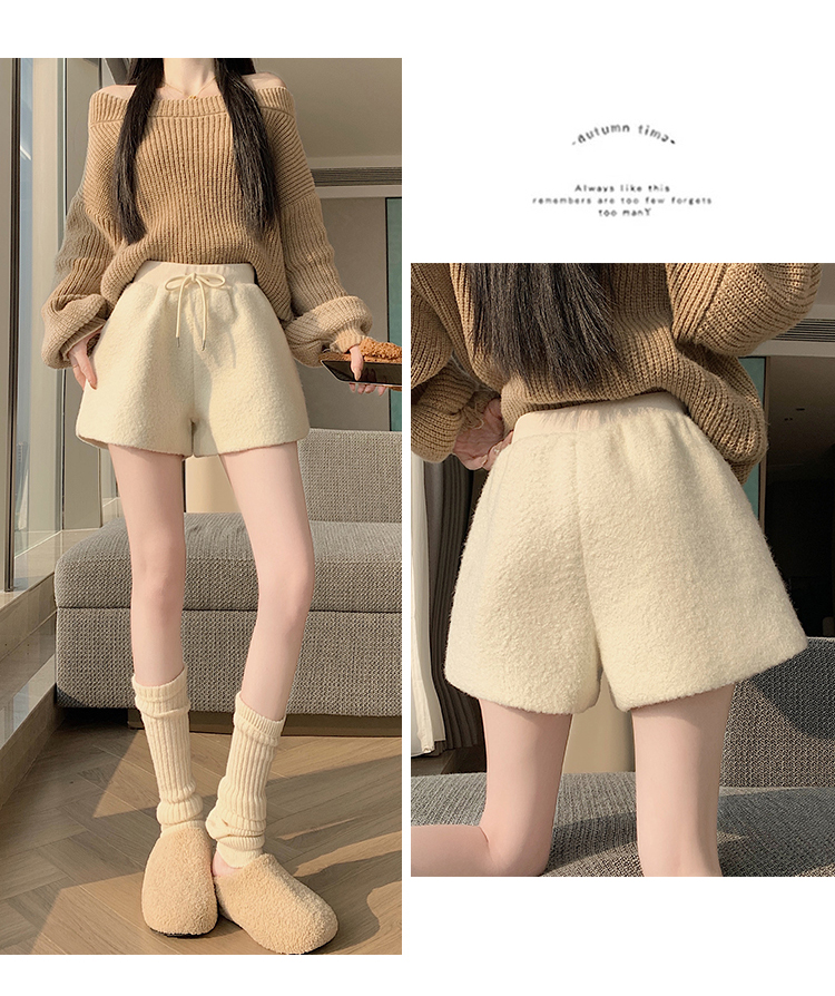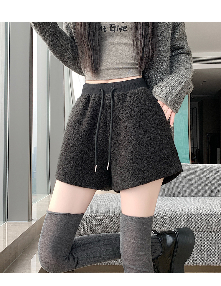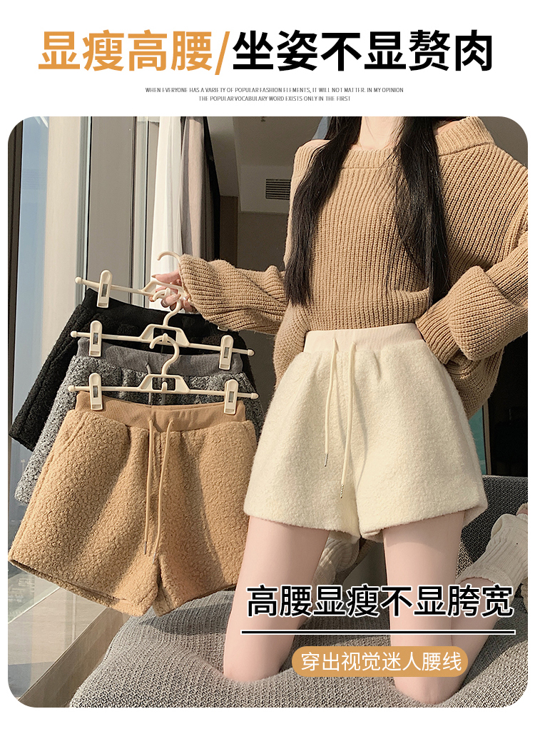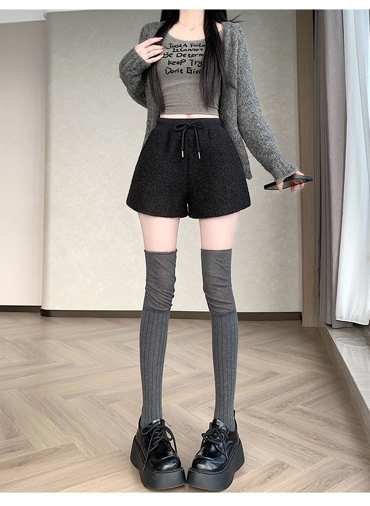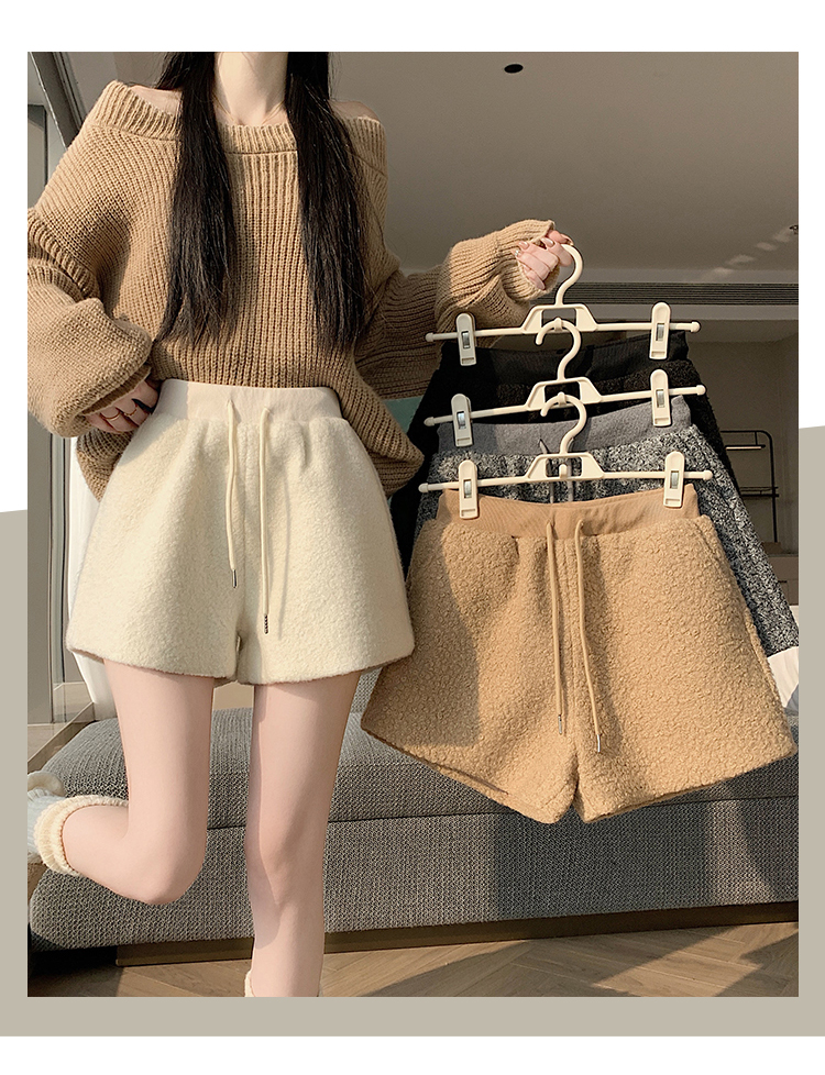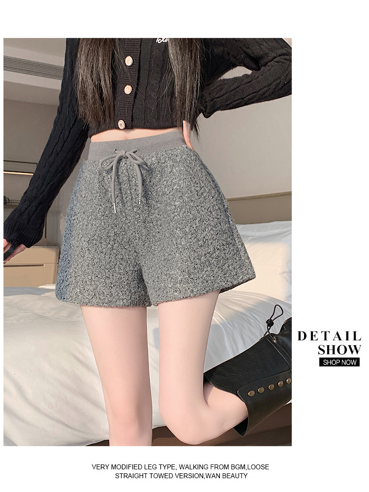 MY15448# 简约气质纯色毛呢抽绳高腰休闲裤小众加厚包臀短裤女裝貨源服裝批發
