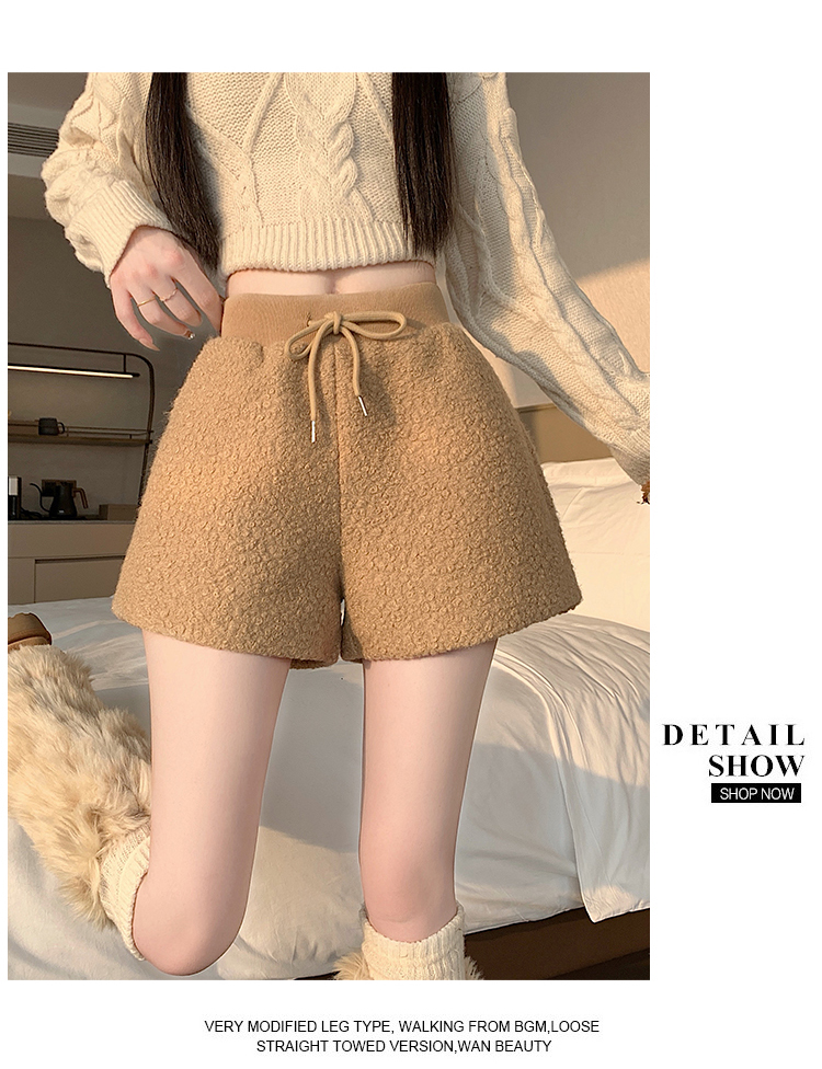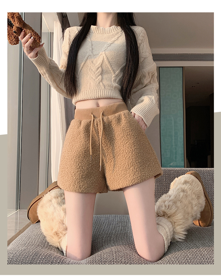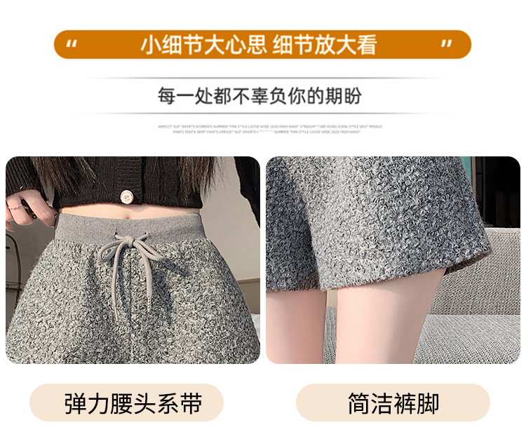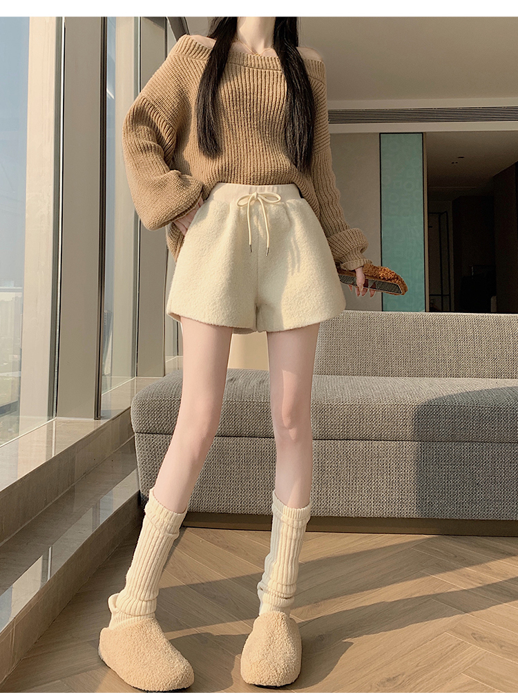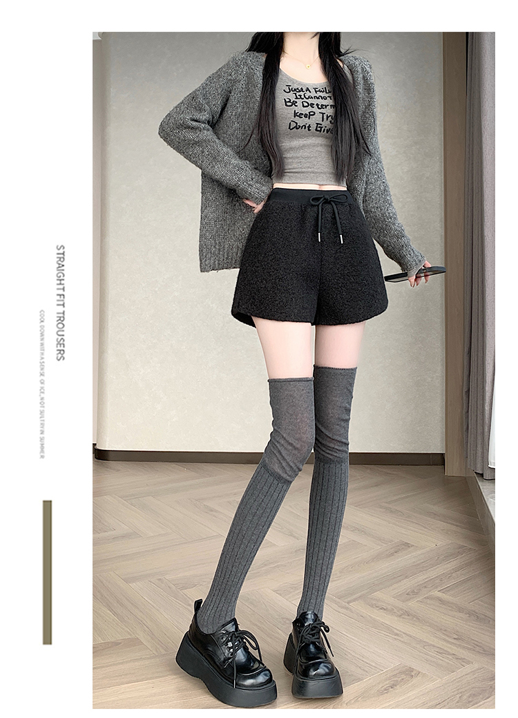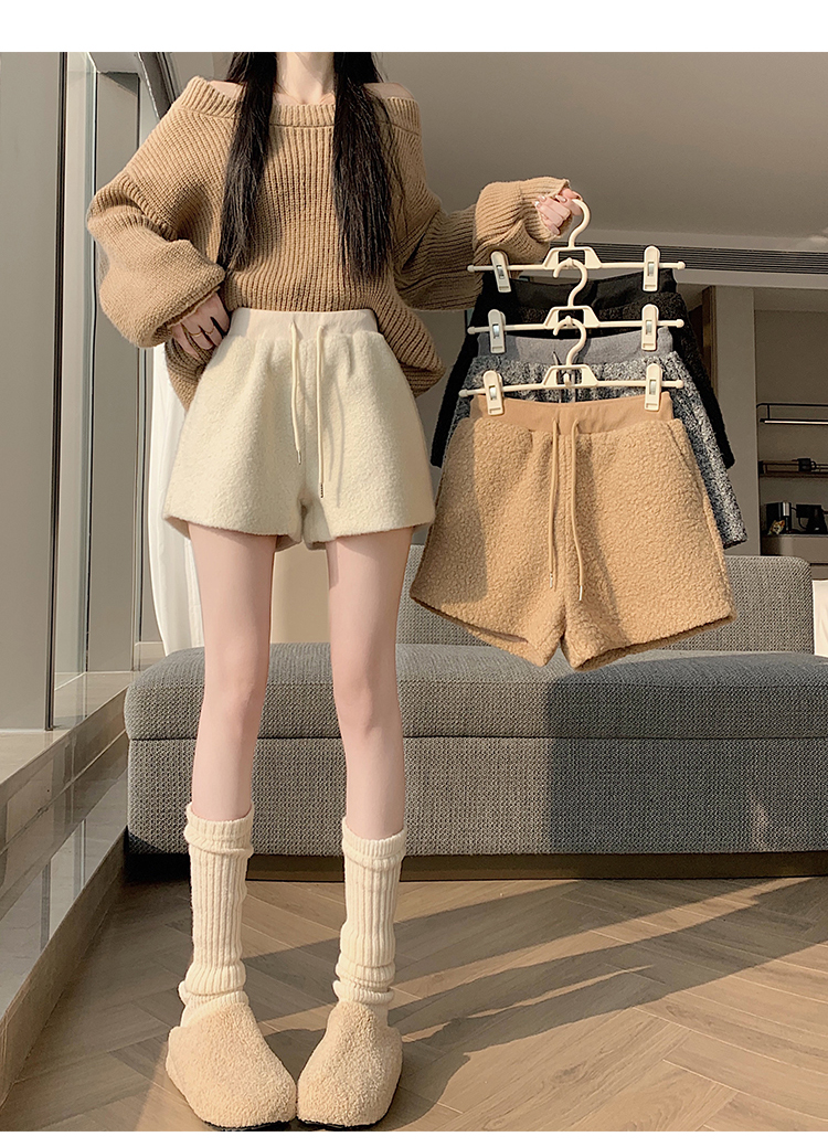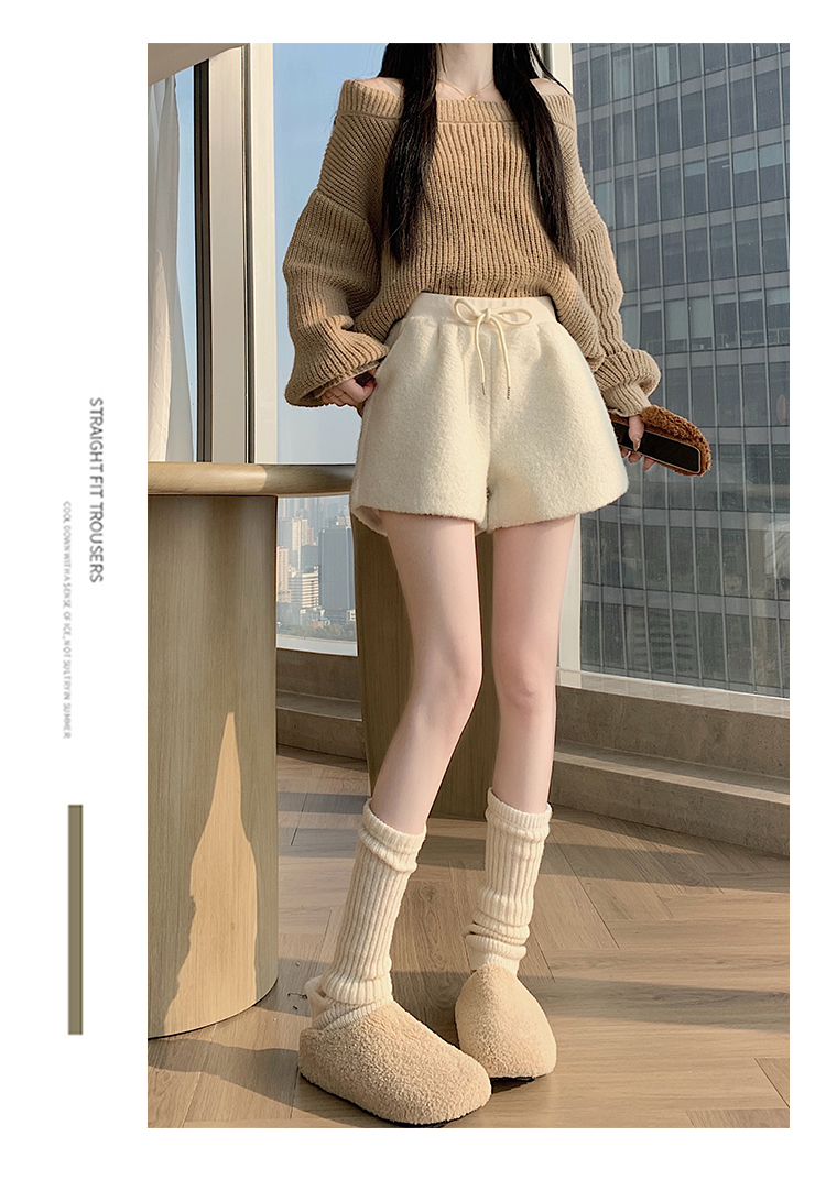 MY15448# 简约气质纯色毛呢抽绳高腰休闲裤小众加厚包臀短裤女裝貨源服裝批發