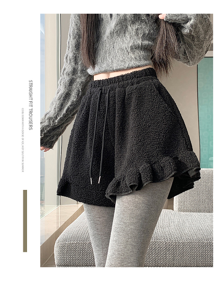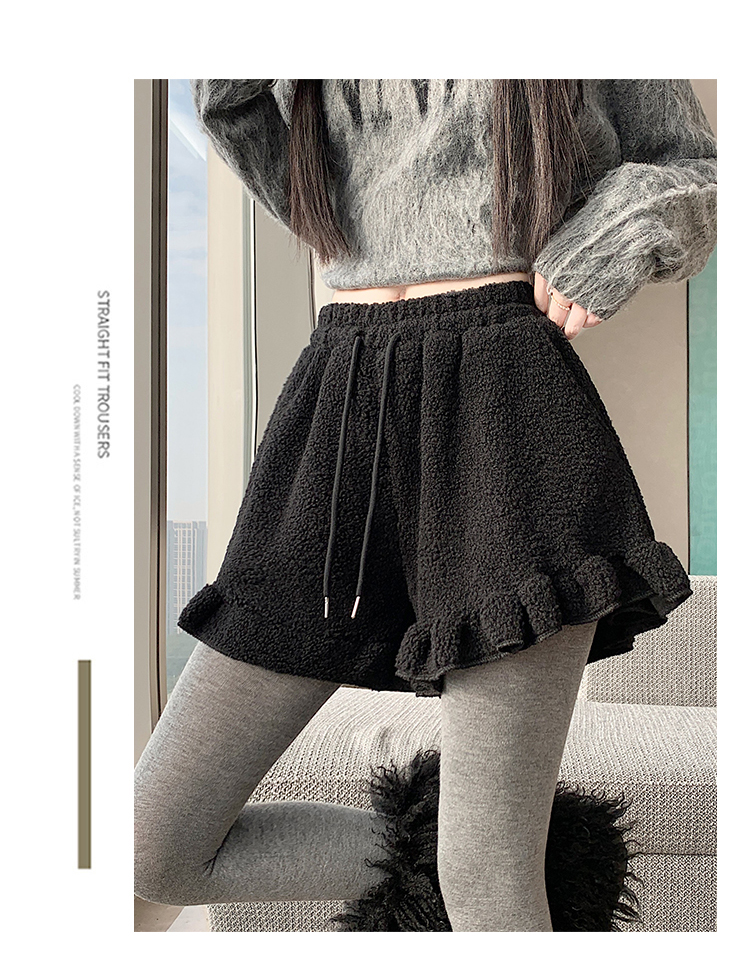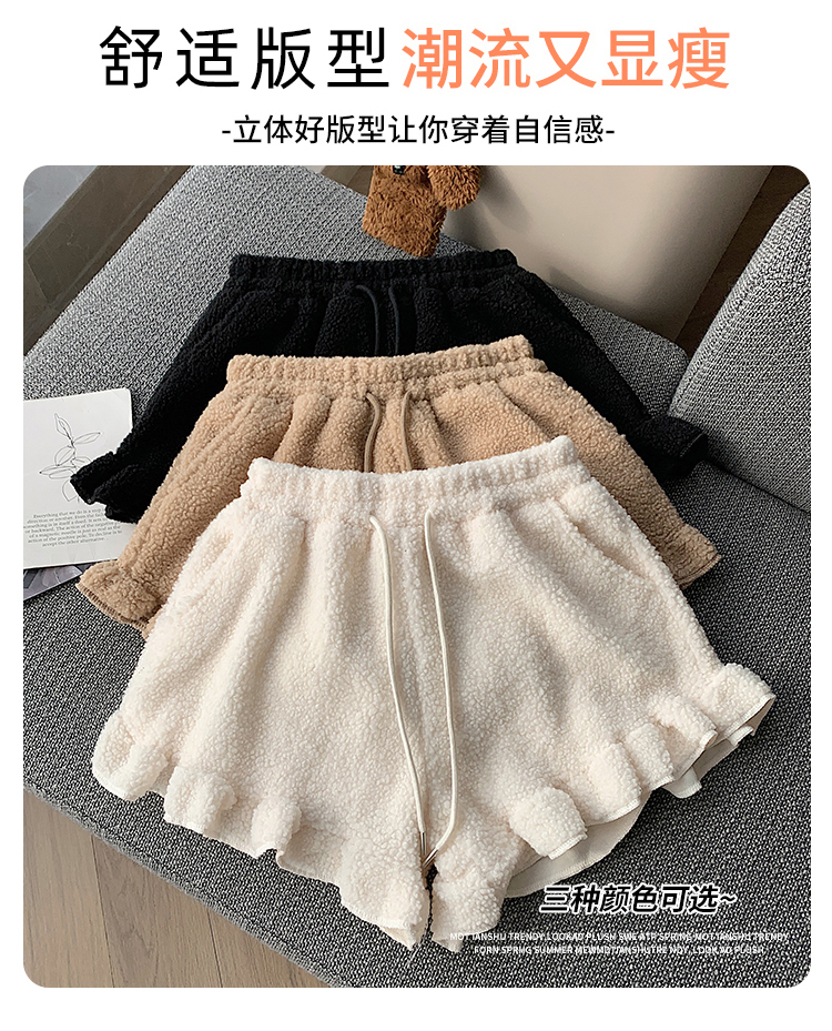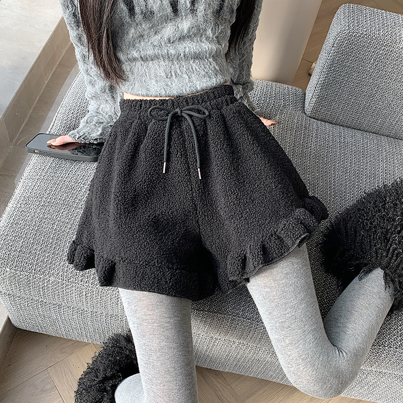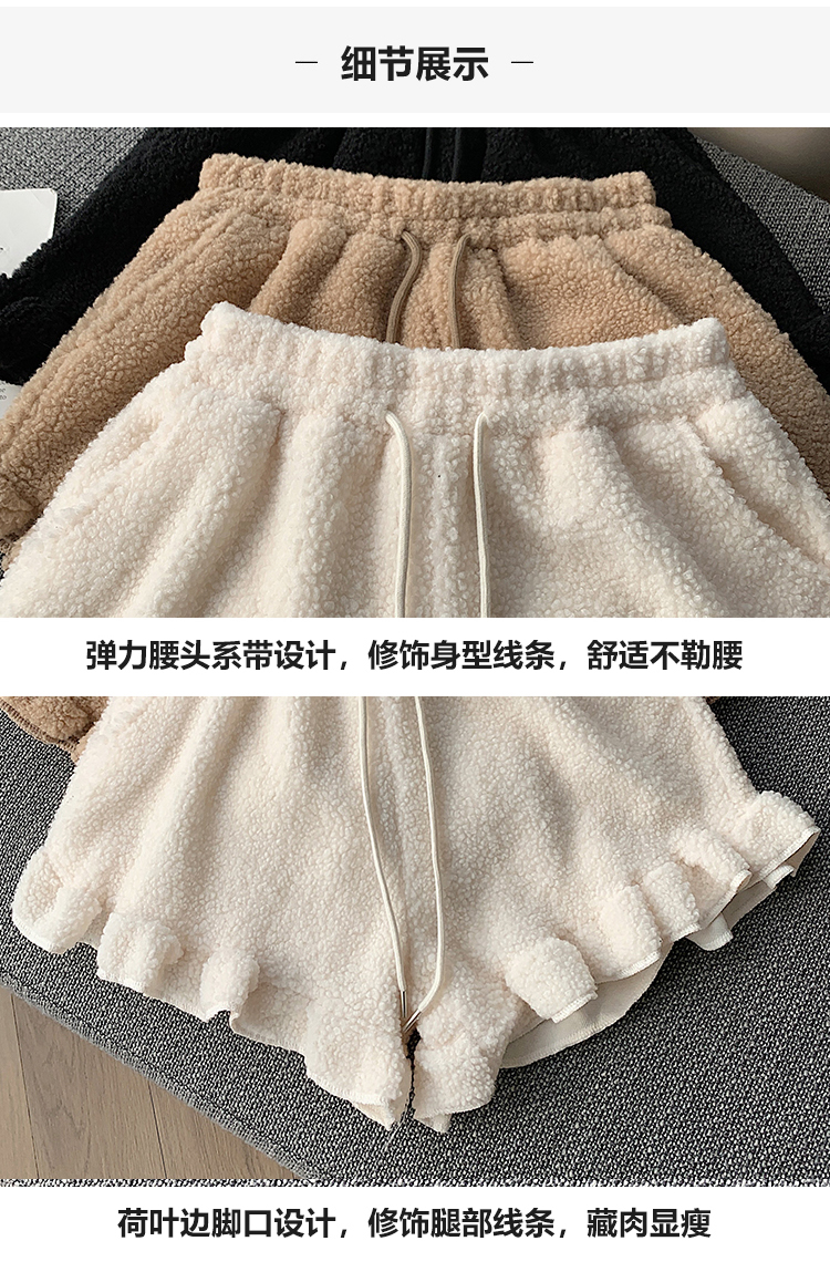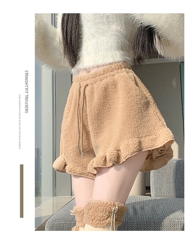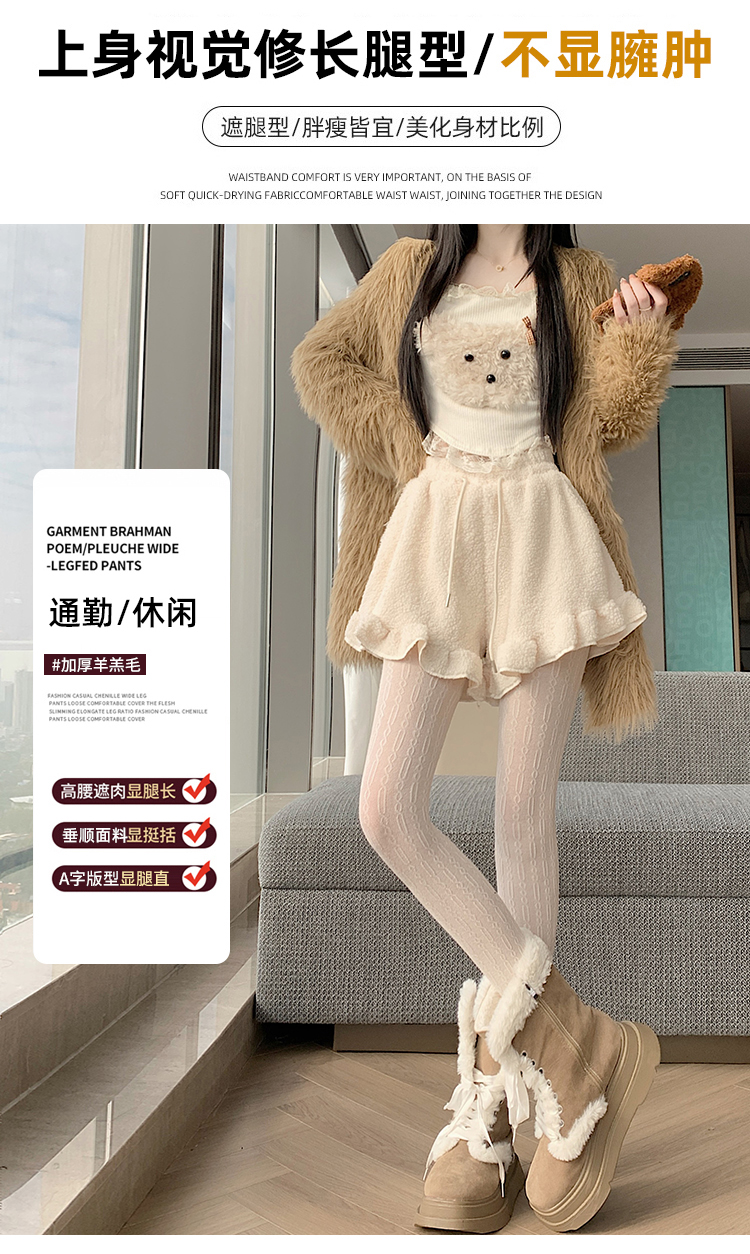 MY15453# 新款毛毛下摆波浪边休闲短裤女装显瘦靴裤羊羔毛阔腿裤女裝貨源服裝批發