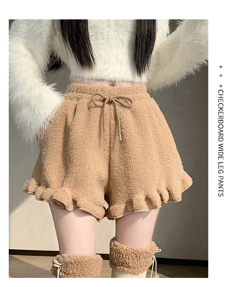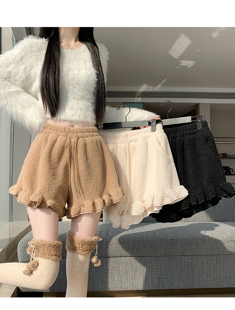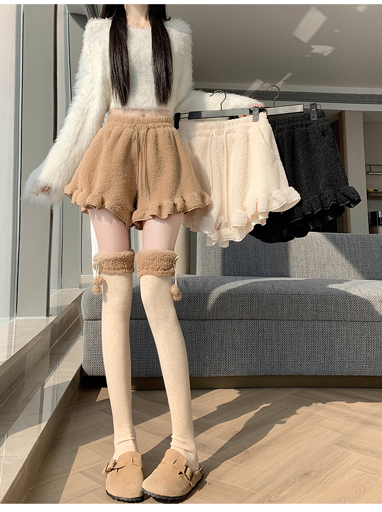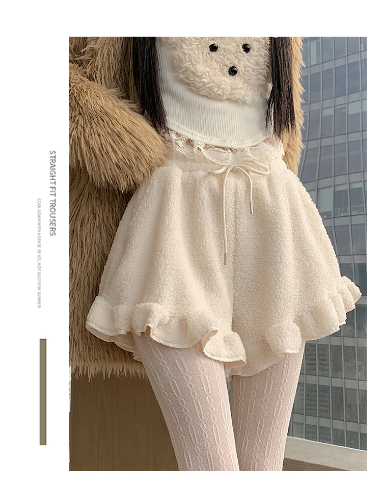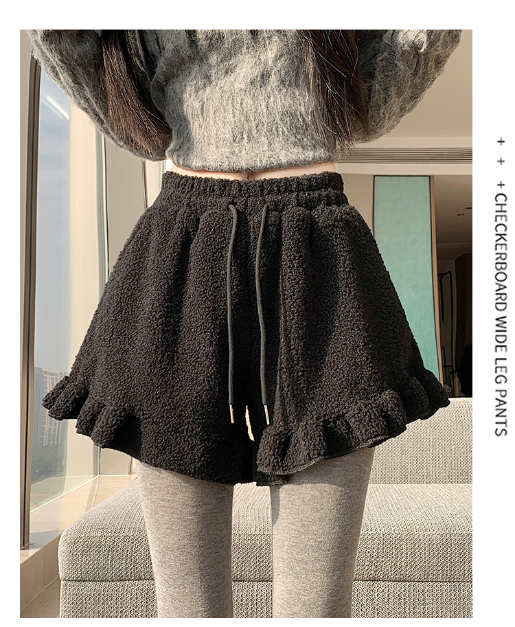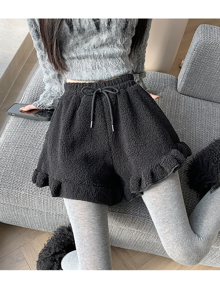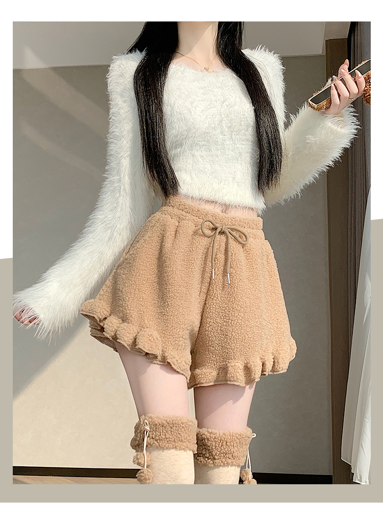 MY15453# 新款毛毛下摆波浪边休闲短裤女装显瘦靴裤羊羔毛阔腿裤女裝貨源服裝批發