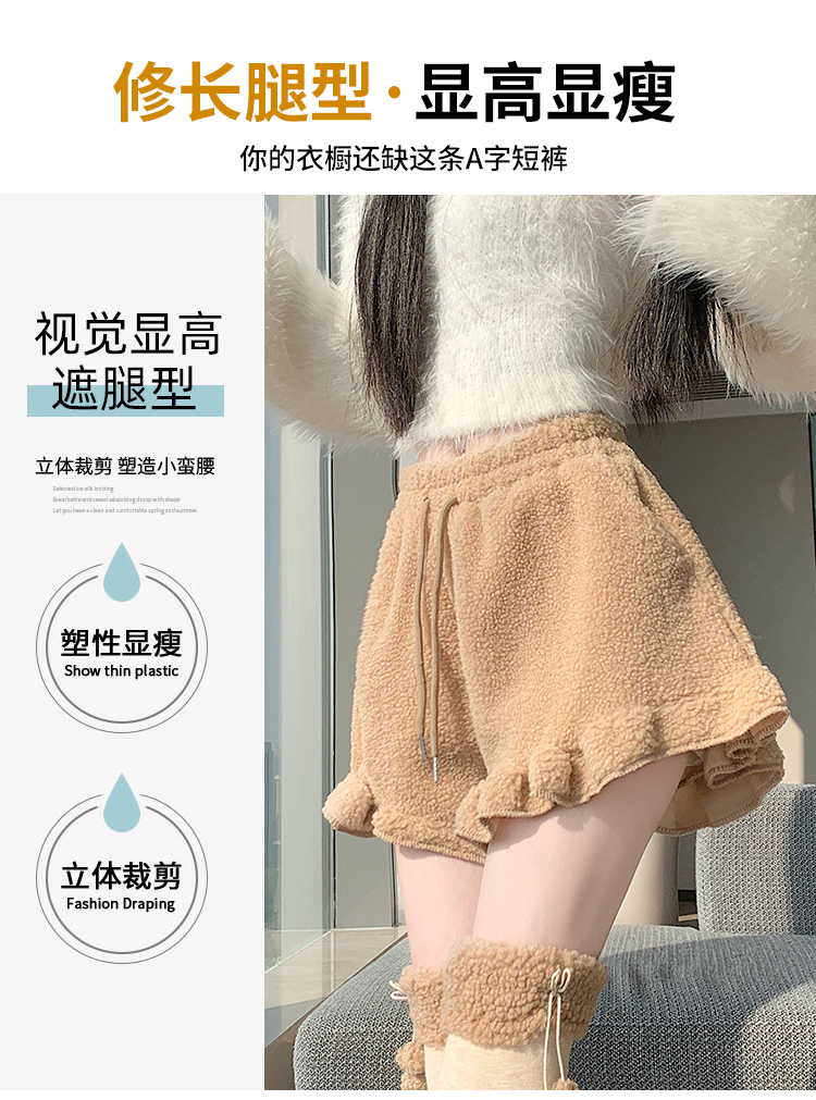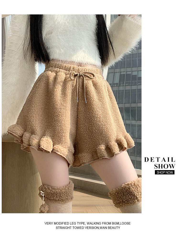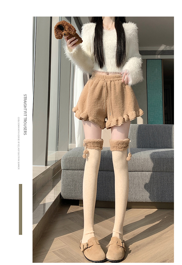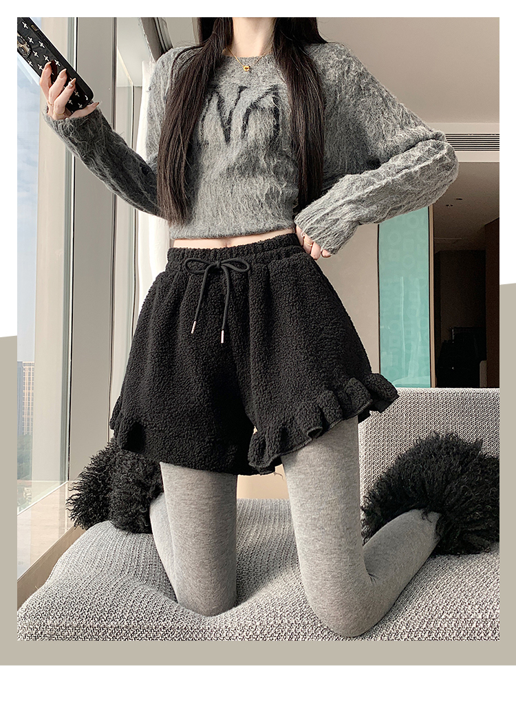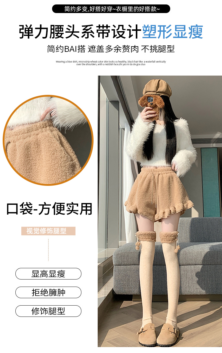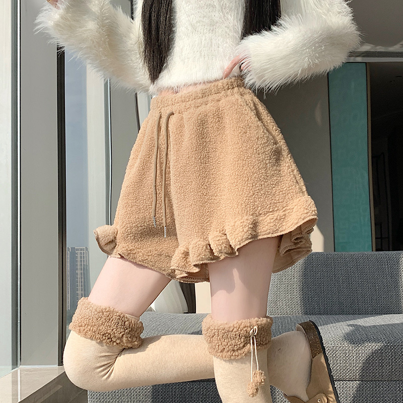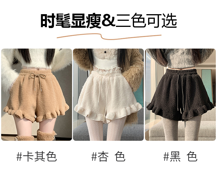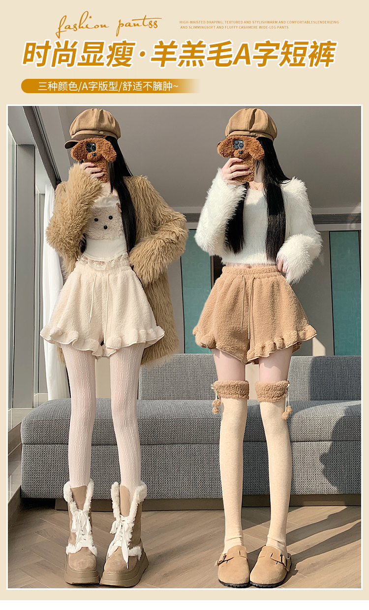MY15453# 新款毛毛下摆波浪边休闲短裤女装显瘦靴裤羊羔毛阔腿裤女裝貨源服裝批發