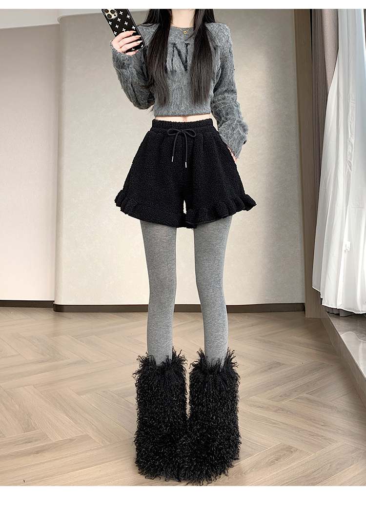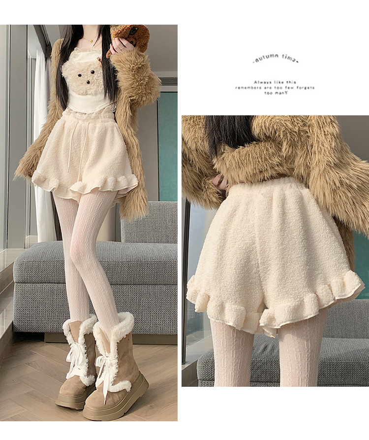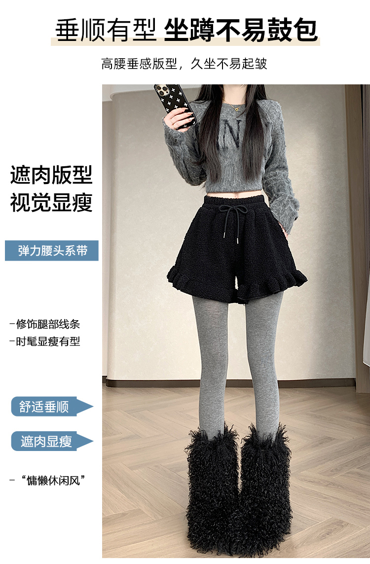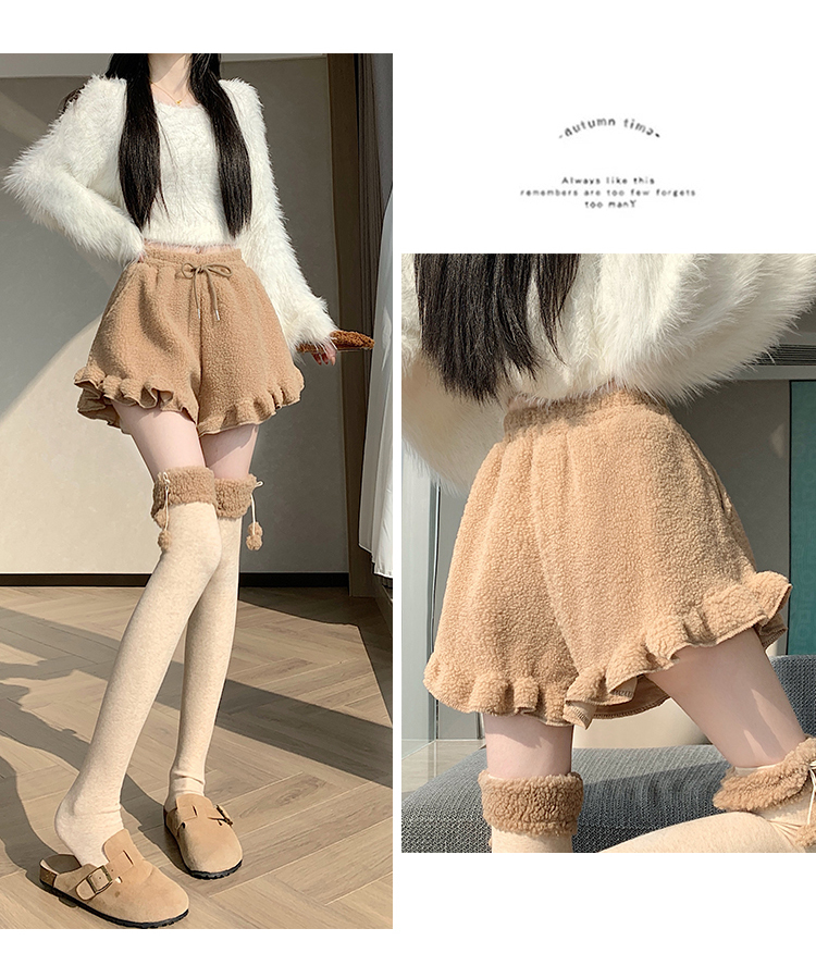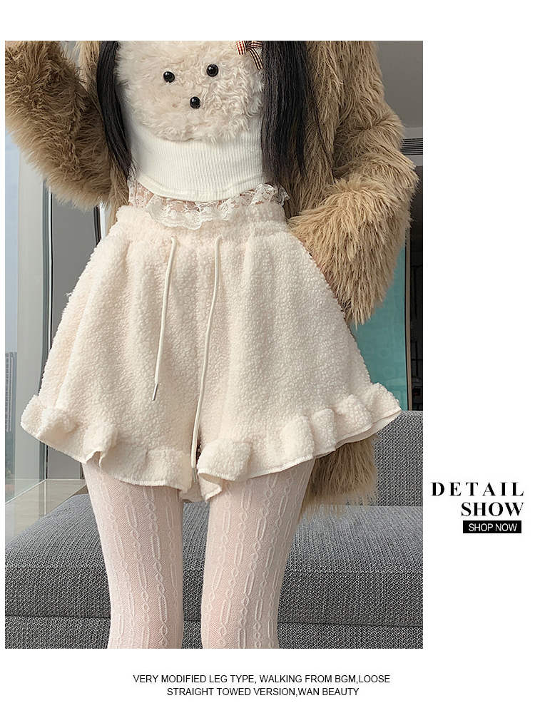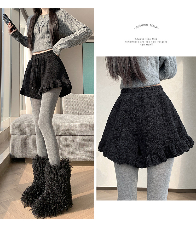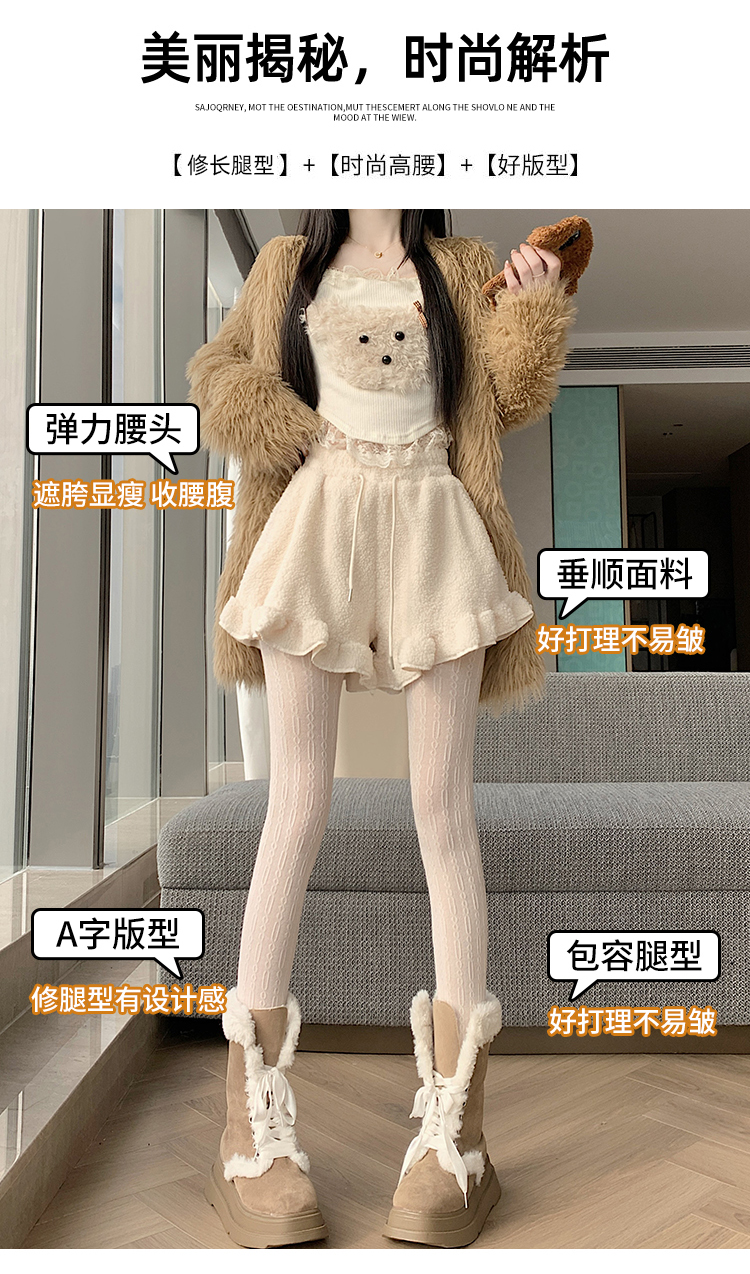 MY15453# 新款毛毛下摆波浪边休闲短裤女装显瘦靴裤羊羔毛阔腿裤女裝貨源服裝批發