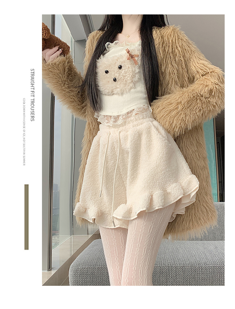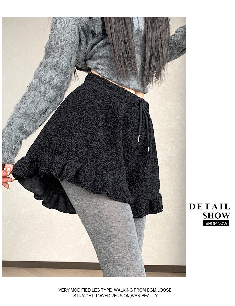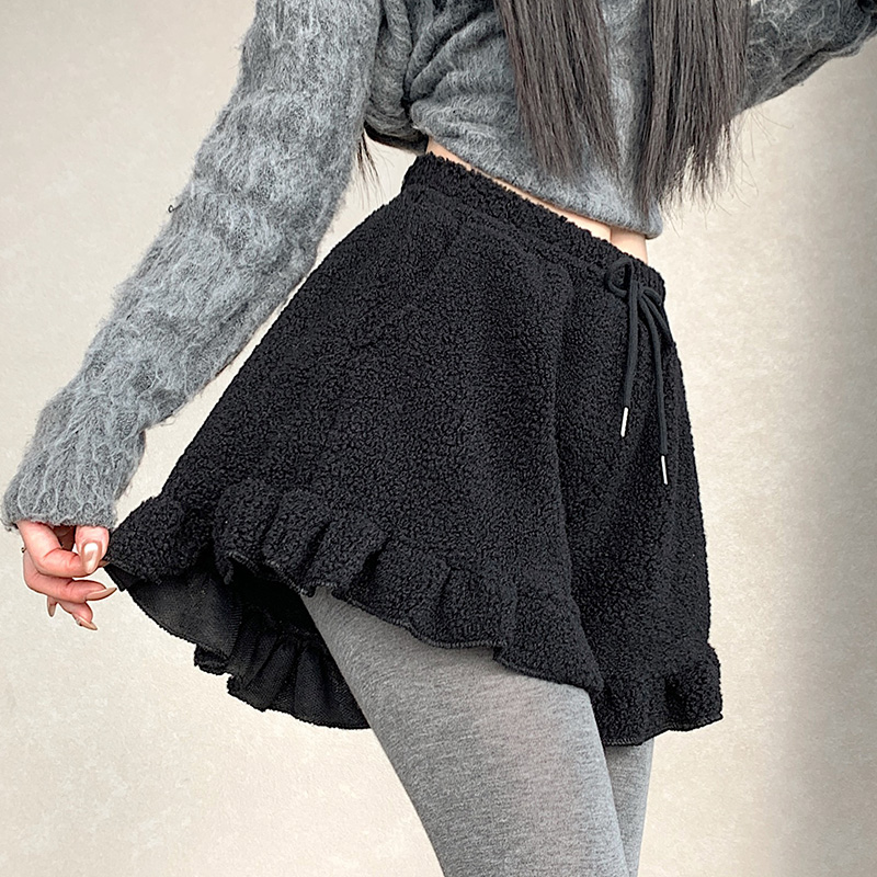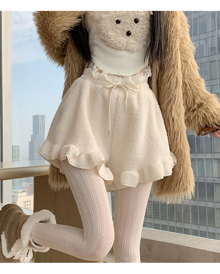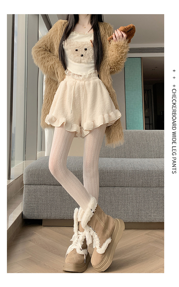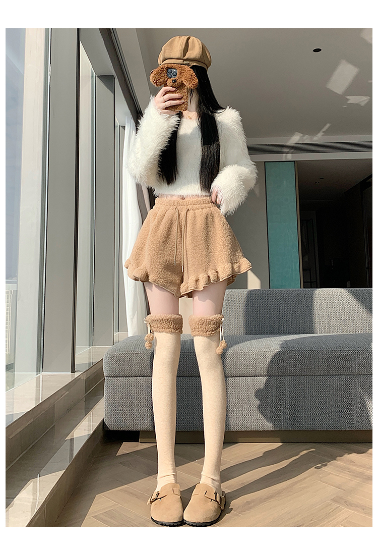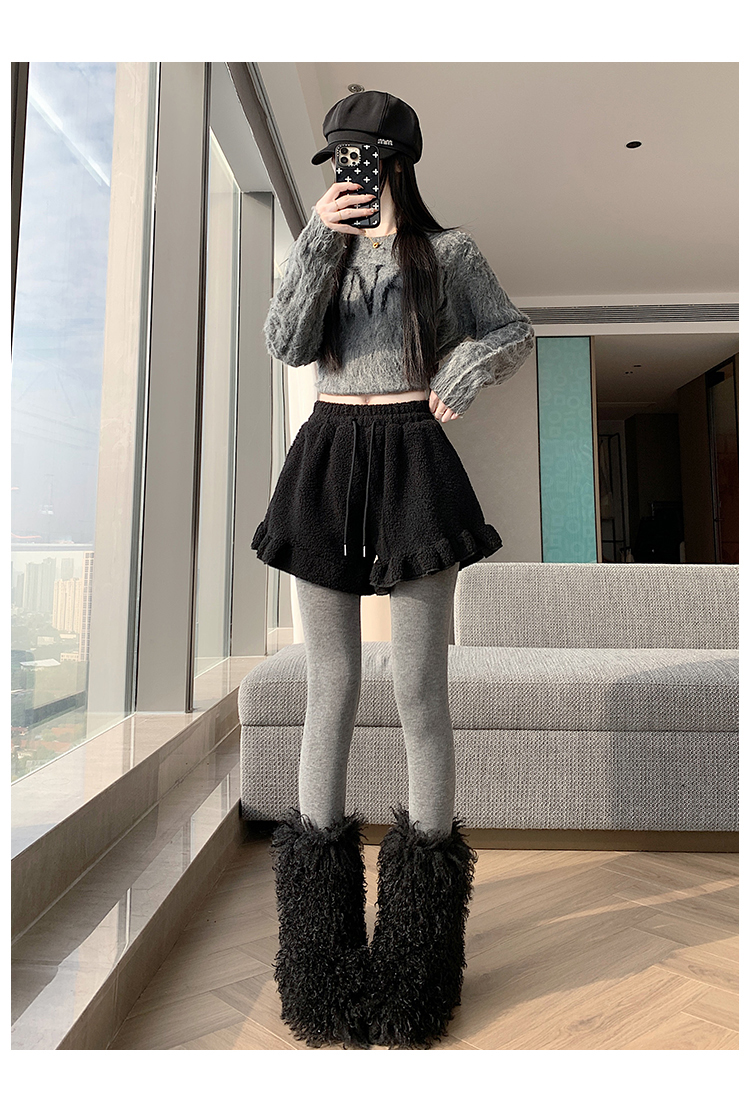 MY15453# 新款毛毛下摆波浪边休闲短裤女装显瘦靴裤羊羔毛阔腿裤女裝貨源服裝批發