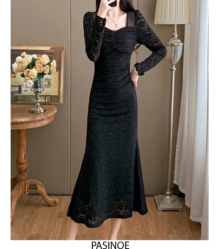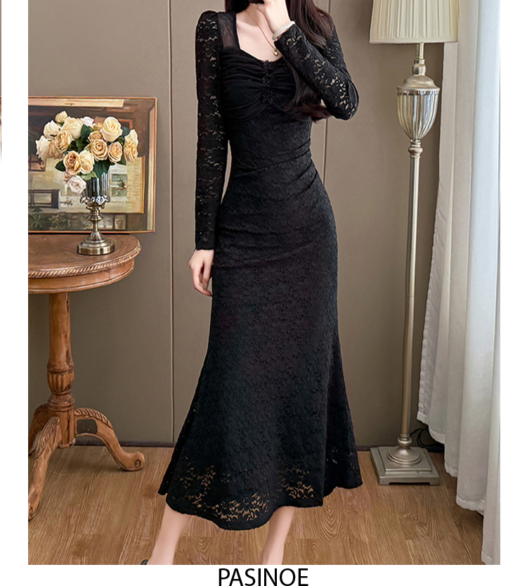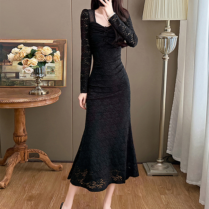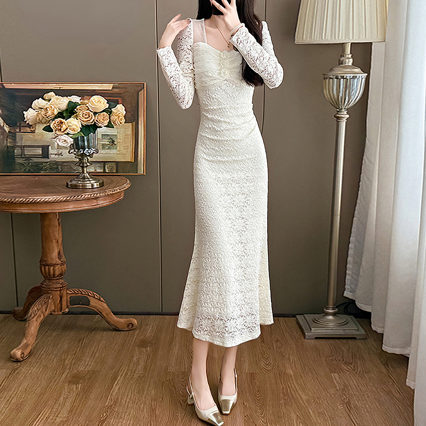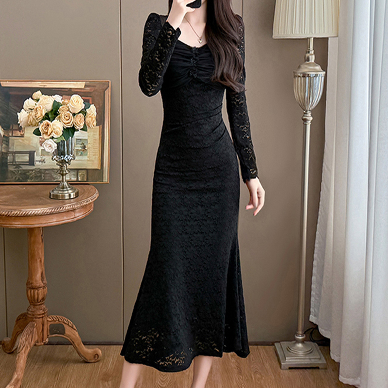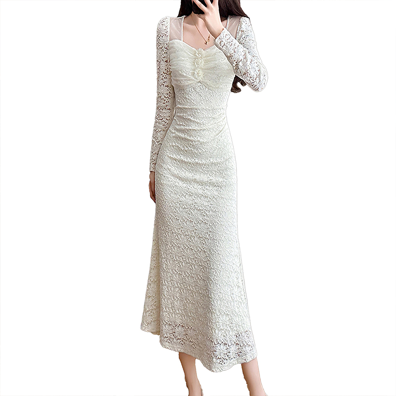MY15474# 新款法式小香风气质V领网纱拼接鱼尾显瘦蕾丝长袖连衣裙女裝貨源服裝批發
