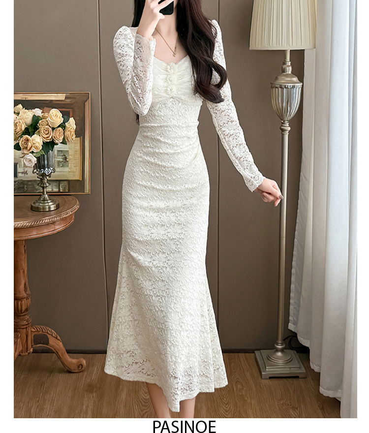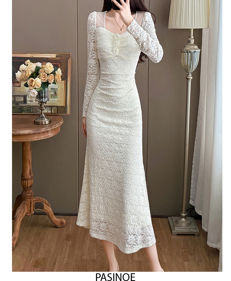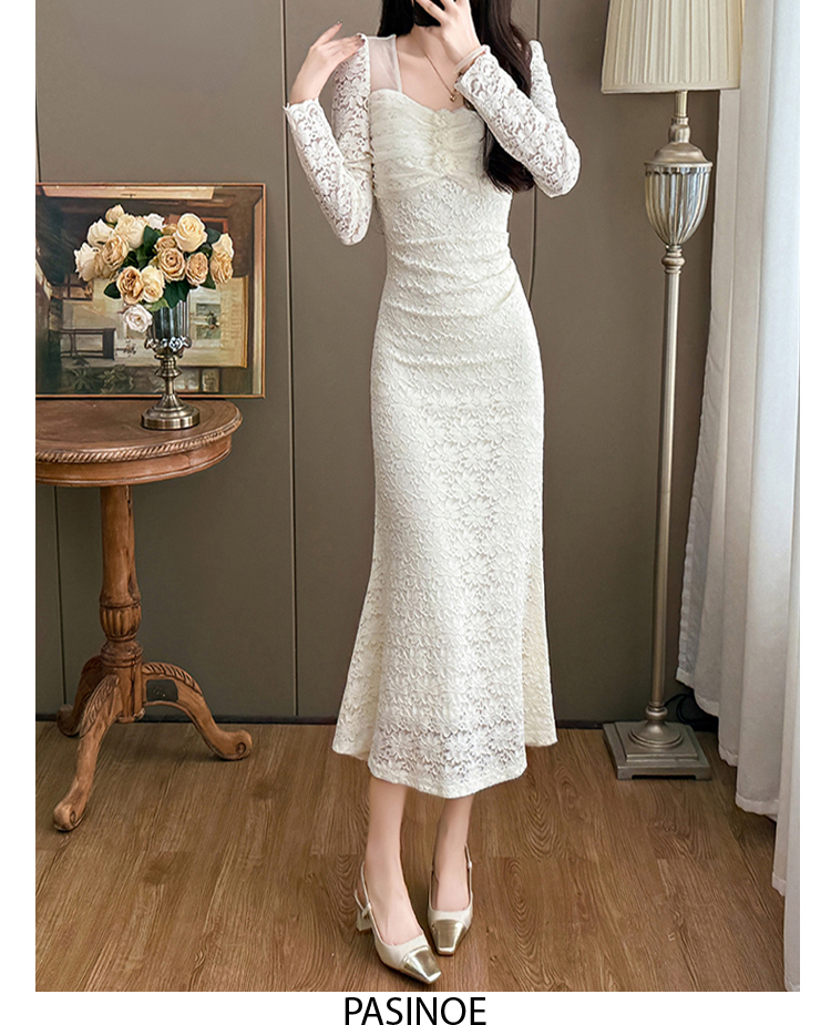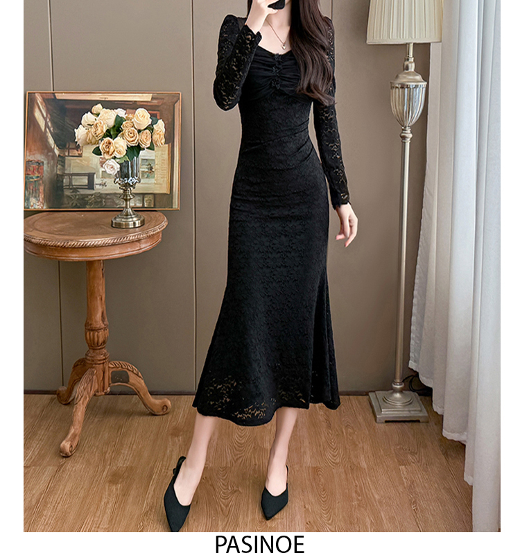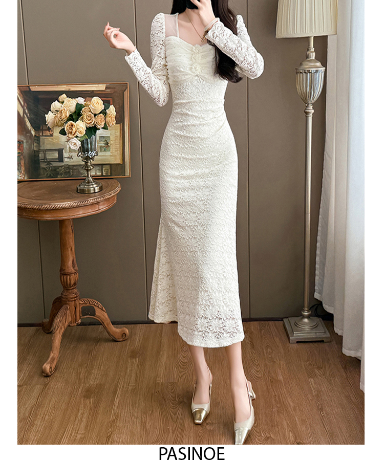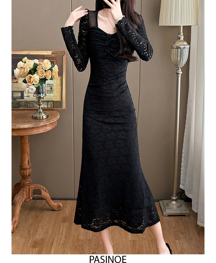 MY15474# 新款法式小香风气质V领网纱拼接鱼尾显瘦蕾丝长袖连衣裙女裝貨源服裝批發