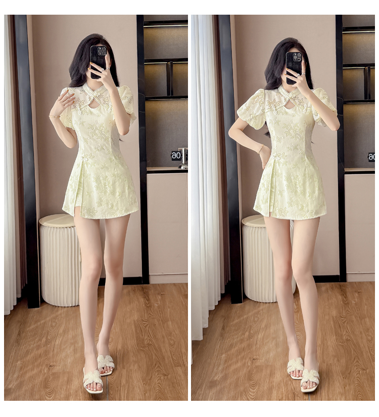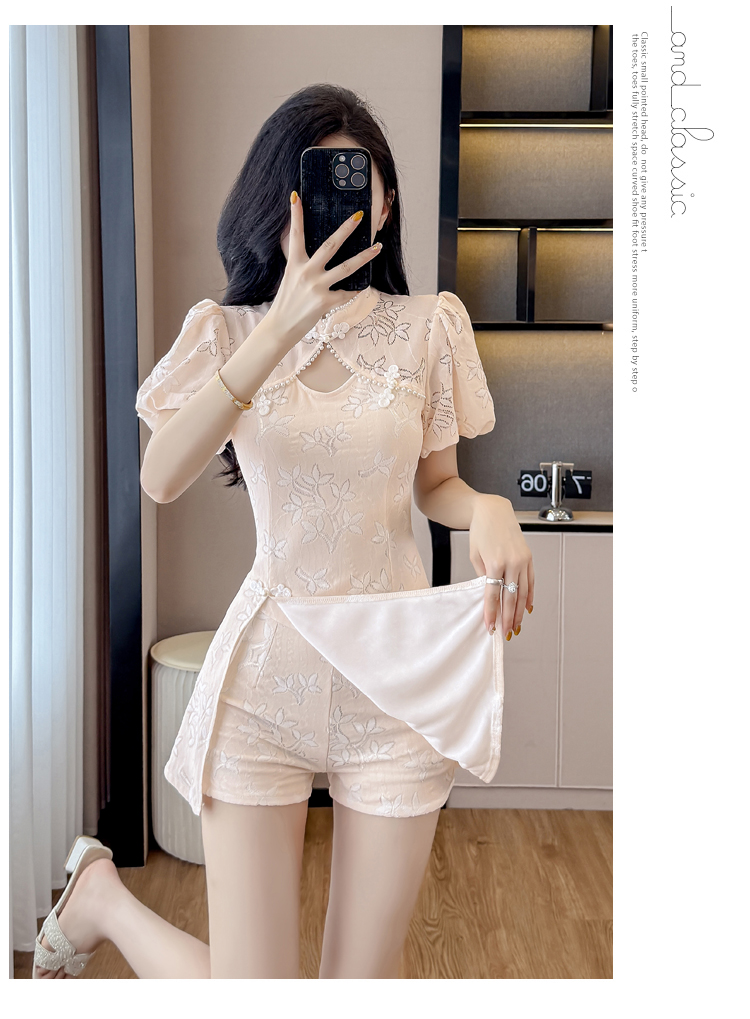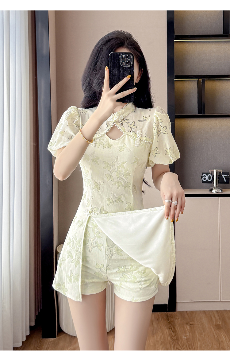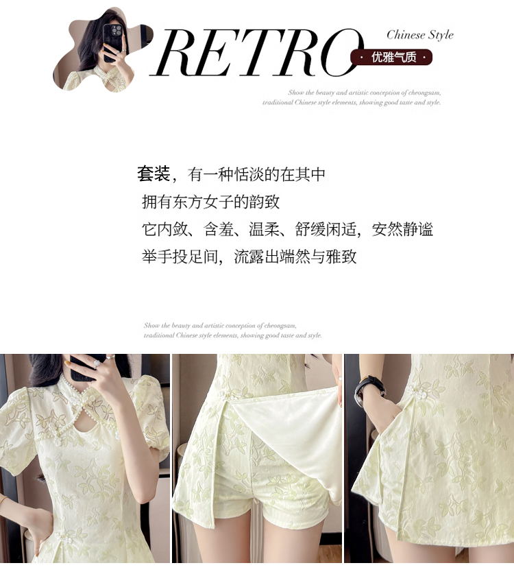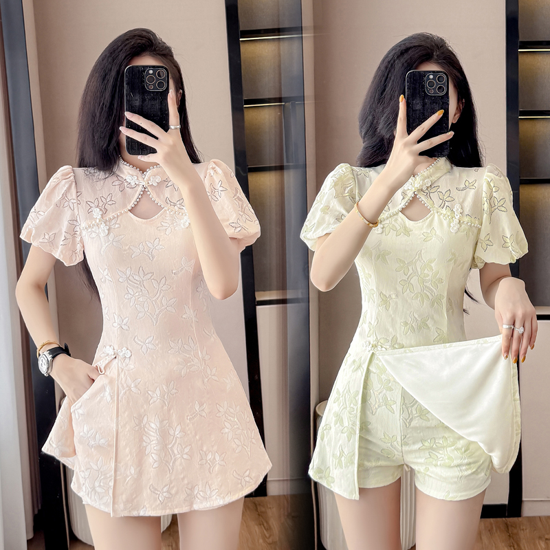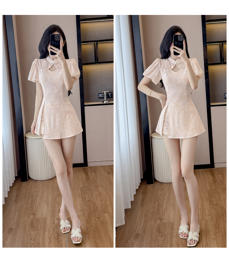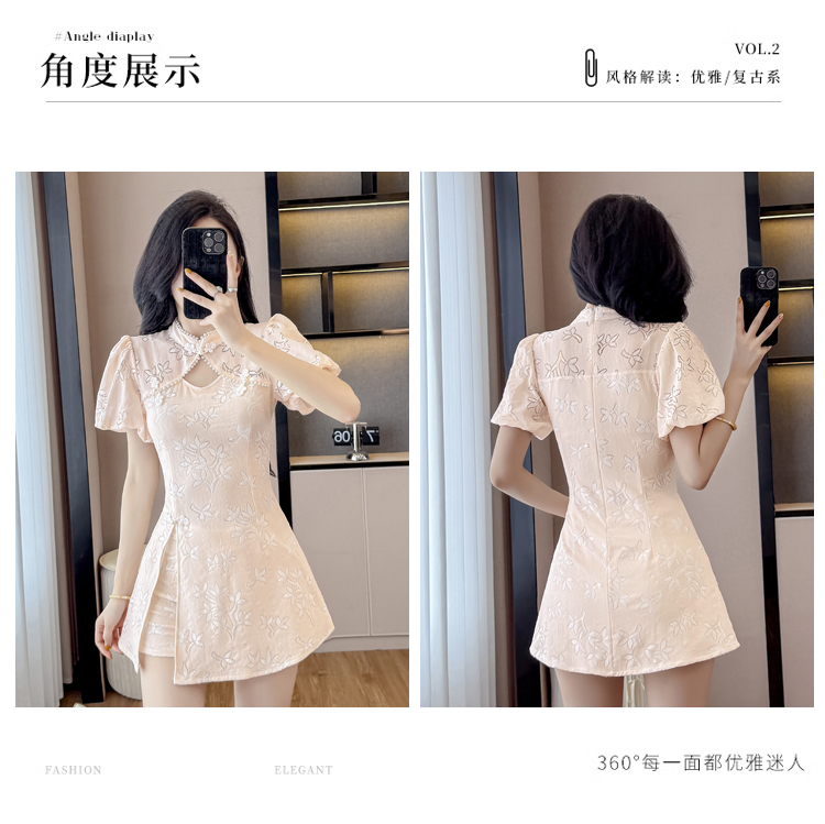 MY15485# 新中式复古改良旗袍裙盘扣蕾丝国风连衣裙短裤两件套女裝貨源服裝批發