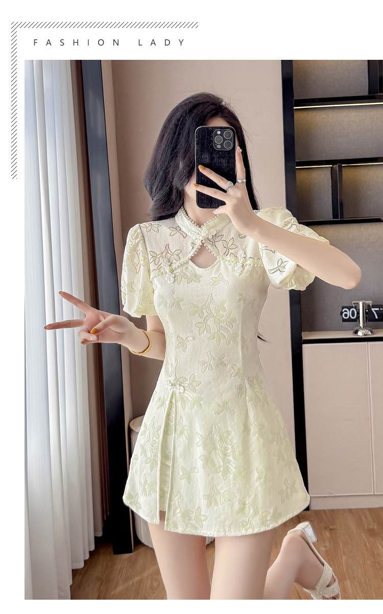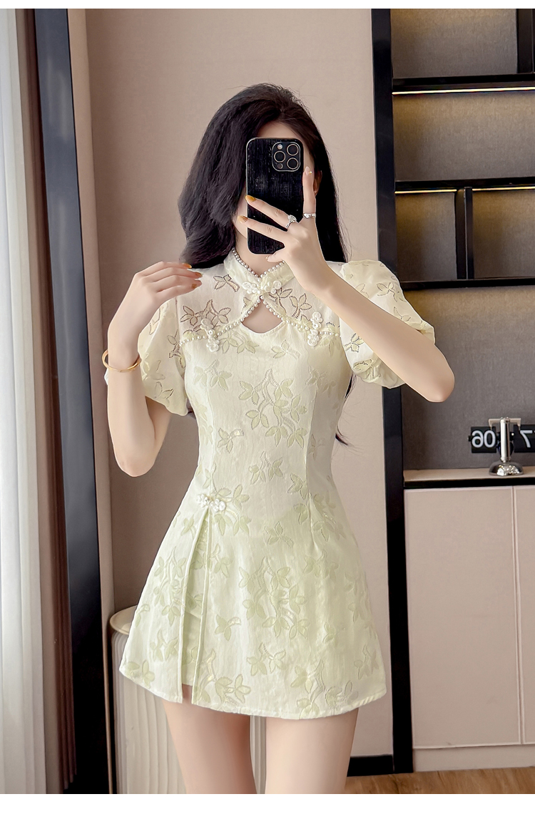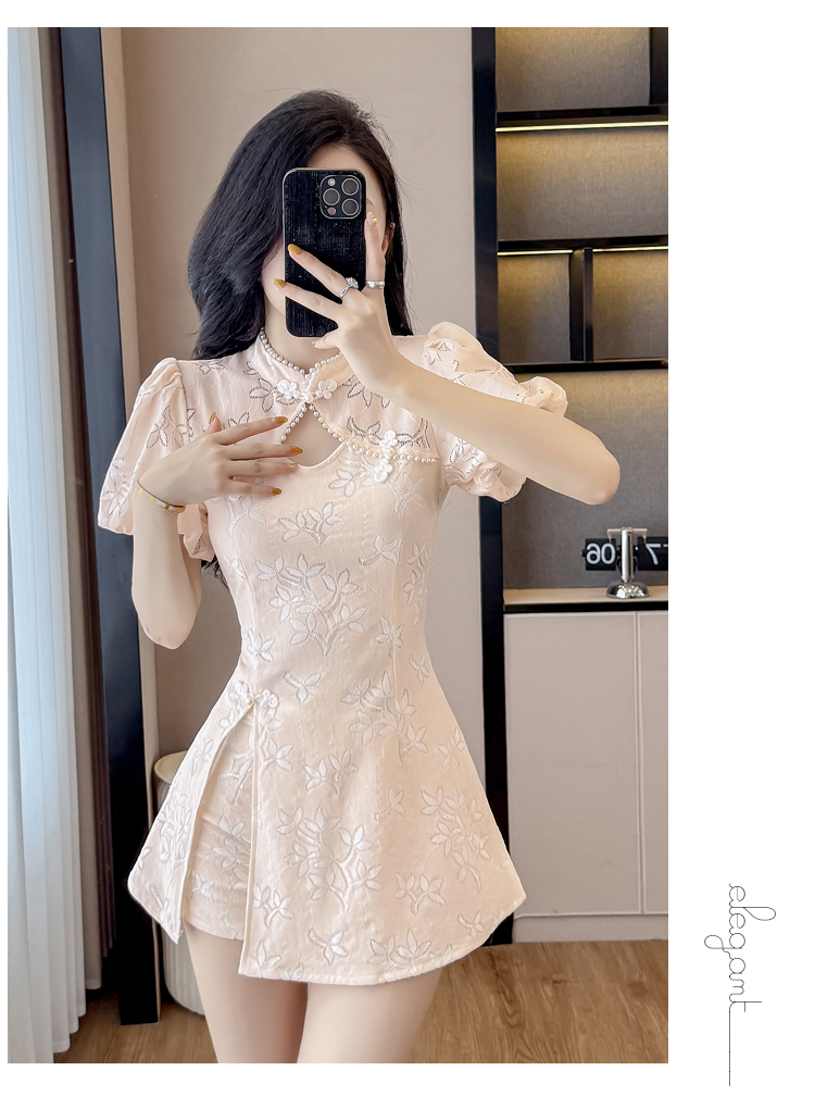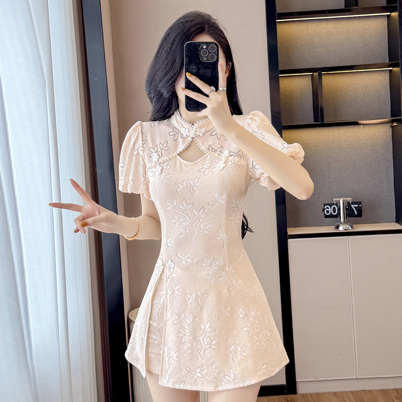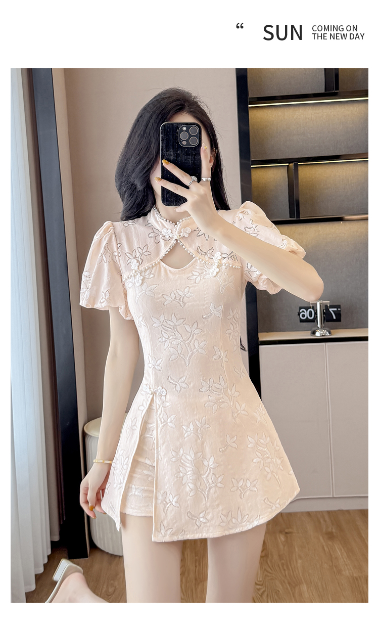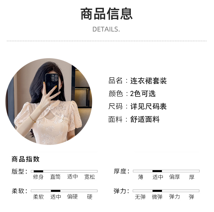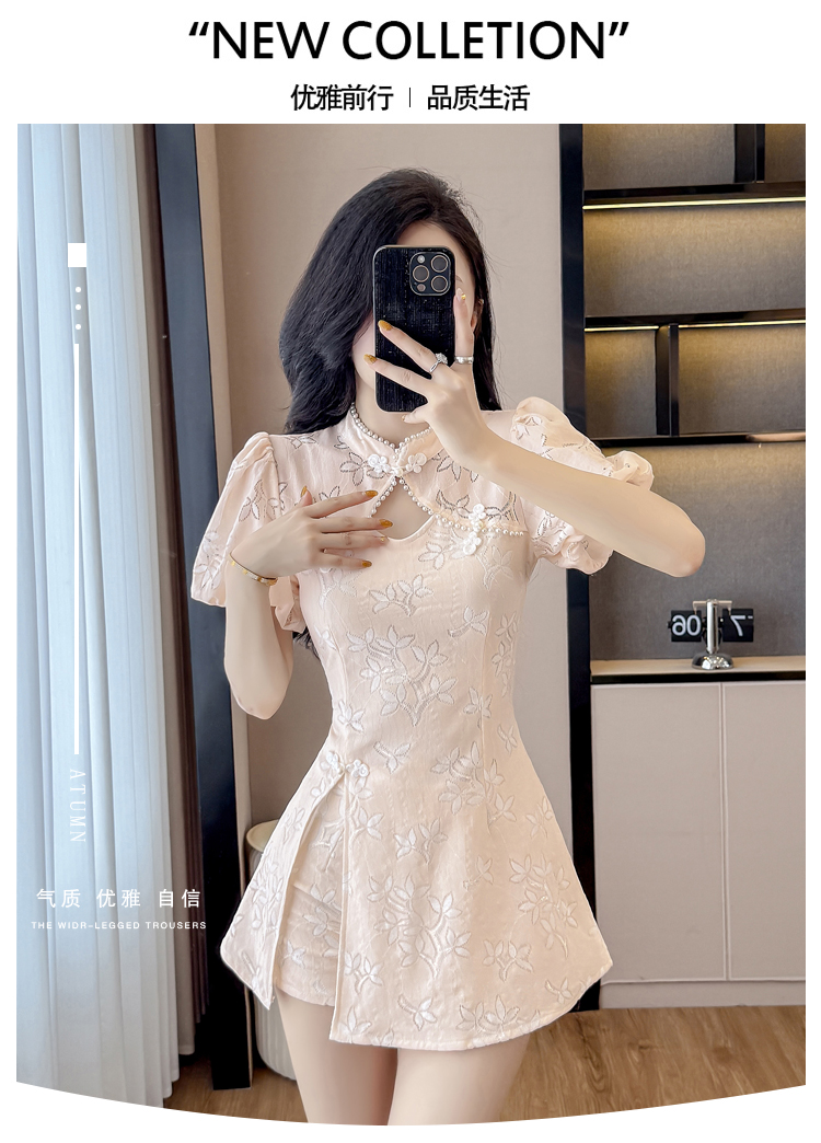 MY15485# 新中式复古改良旗袍裙盘扣蕾丝国风连衣裙短裤两件套女裝貨源服裝批發