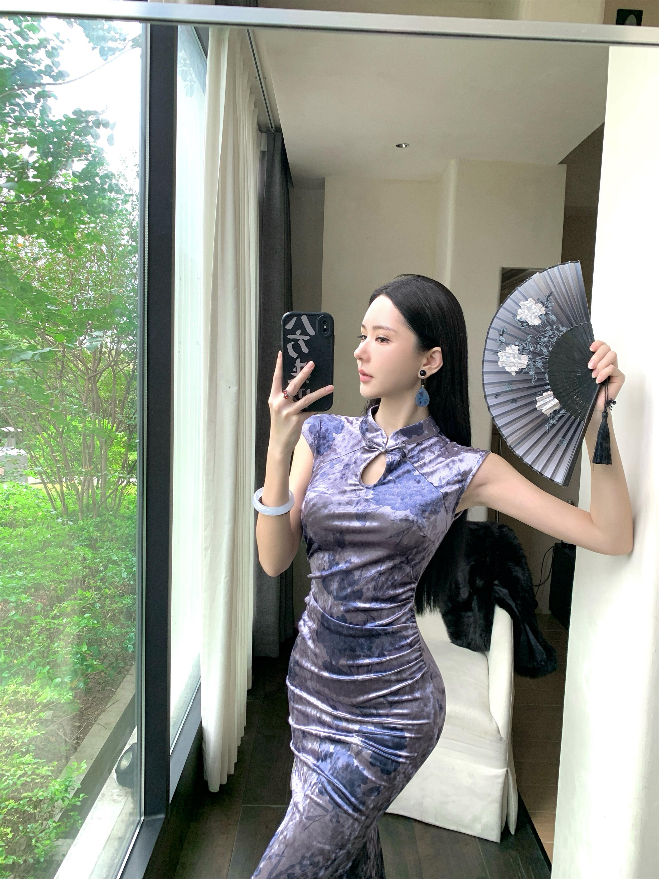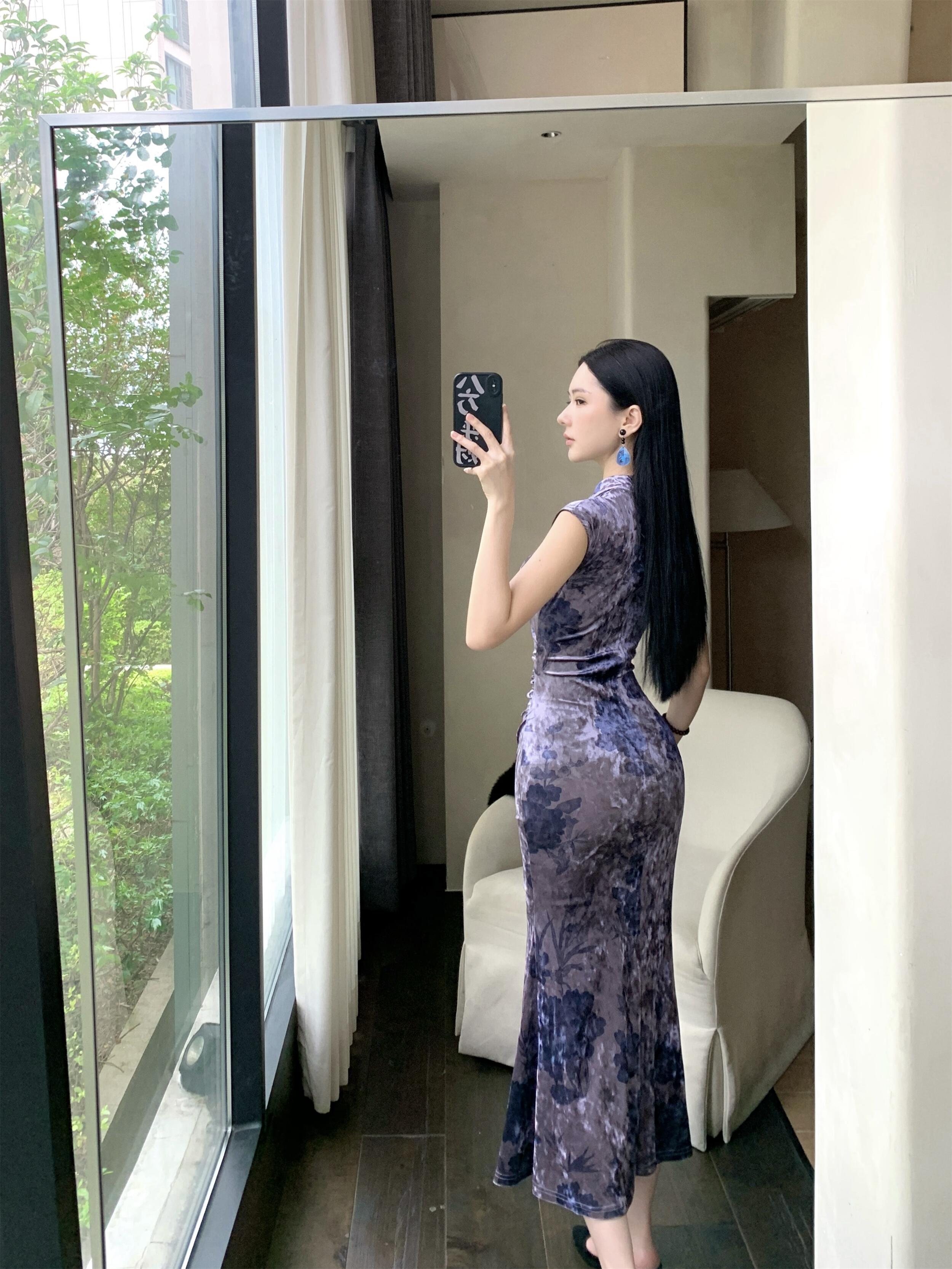 MY15765# 新中式改良旗袍丝绒印花显瘦百搭无袖包臀鱼尾长裙连衣裙女裝貨源服裝批發