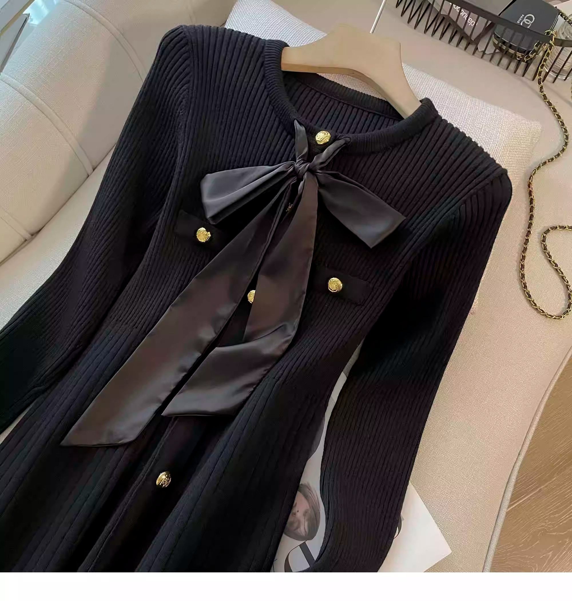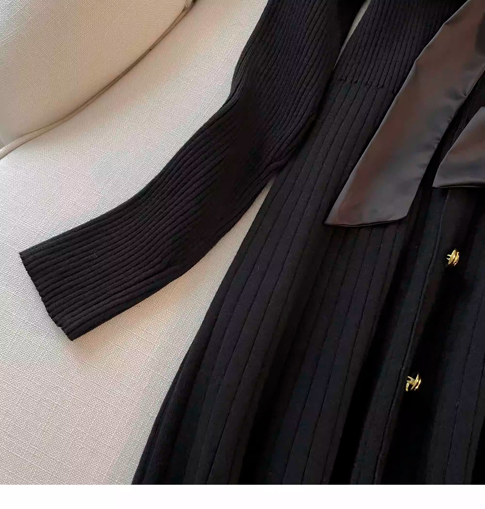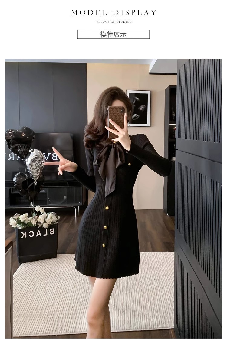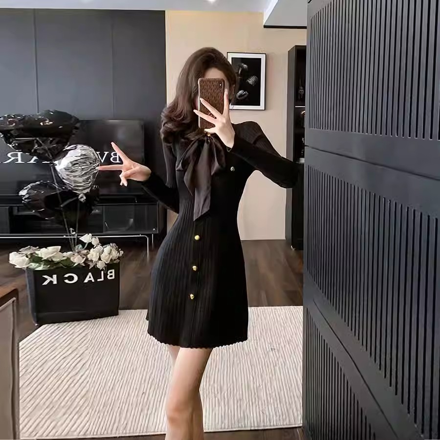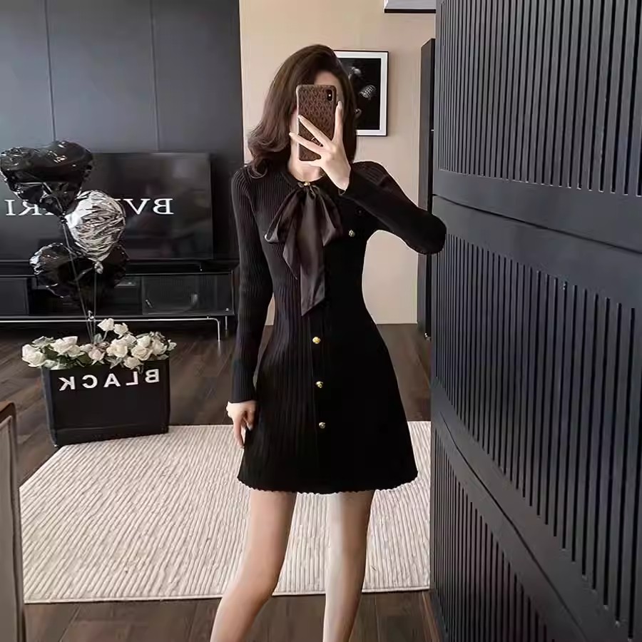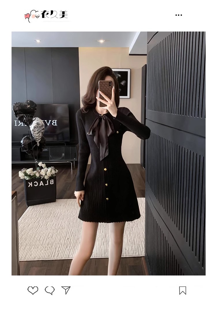 MY15946# 新款小香风甜美气质系带针织连衣裙收腰A字裙毛衣外穿打底裙女裝貨源服裝批發
