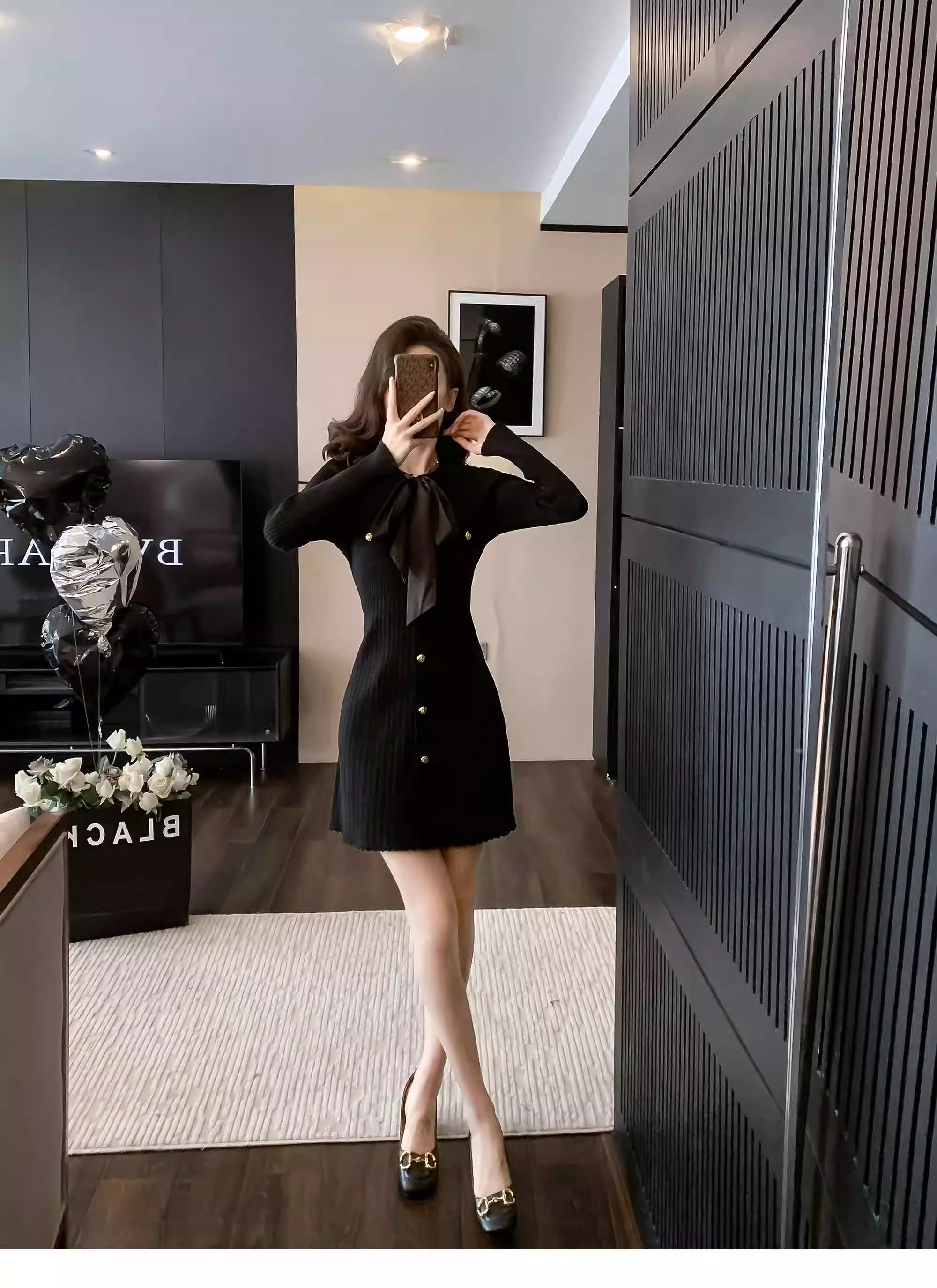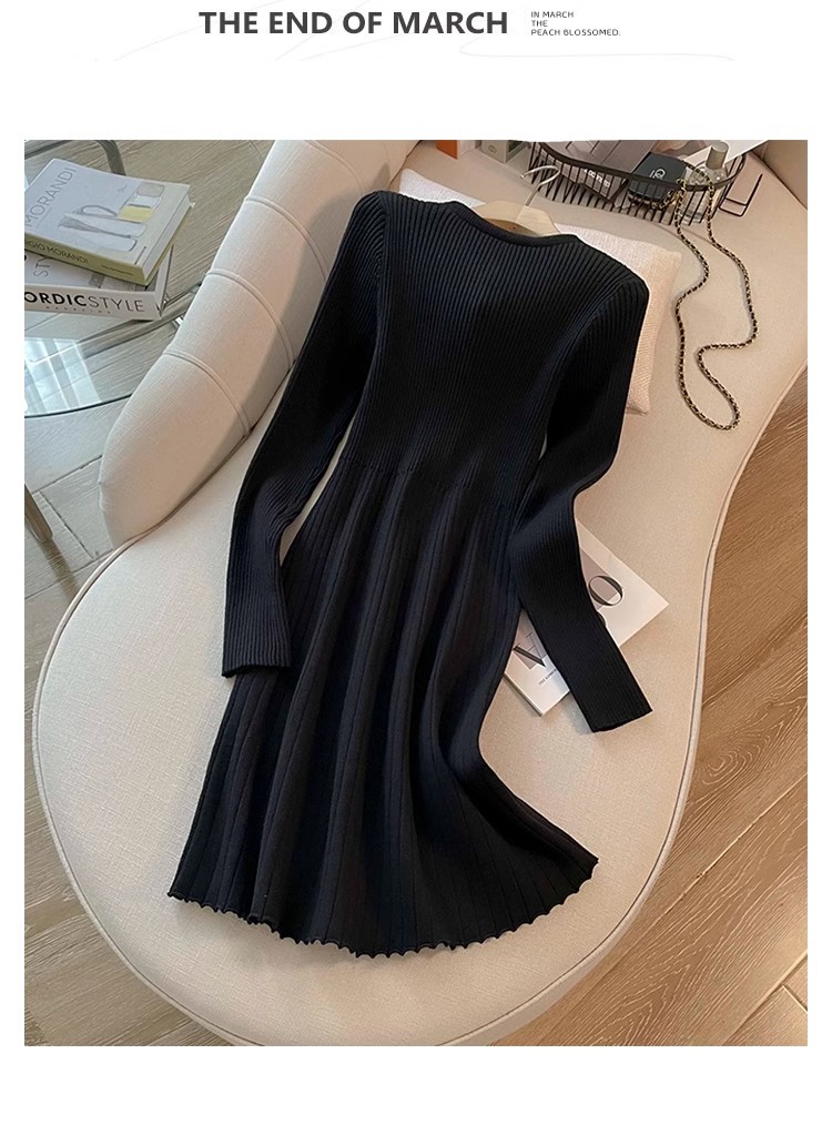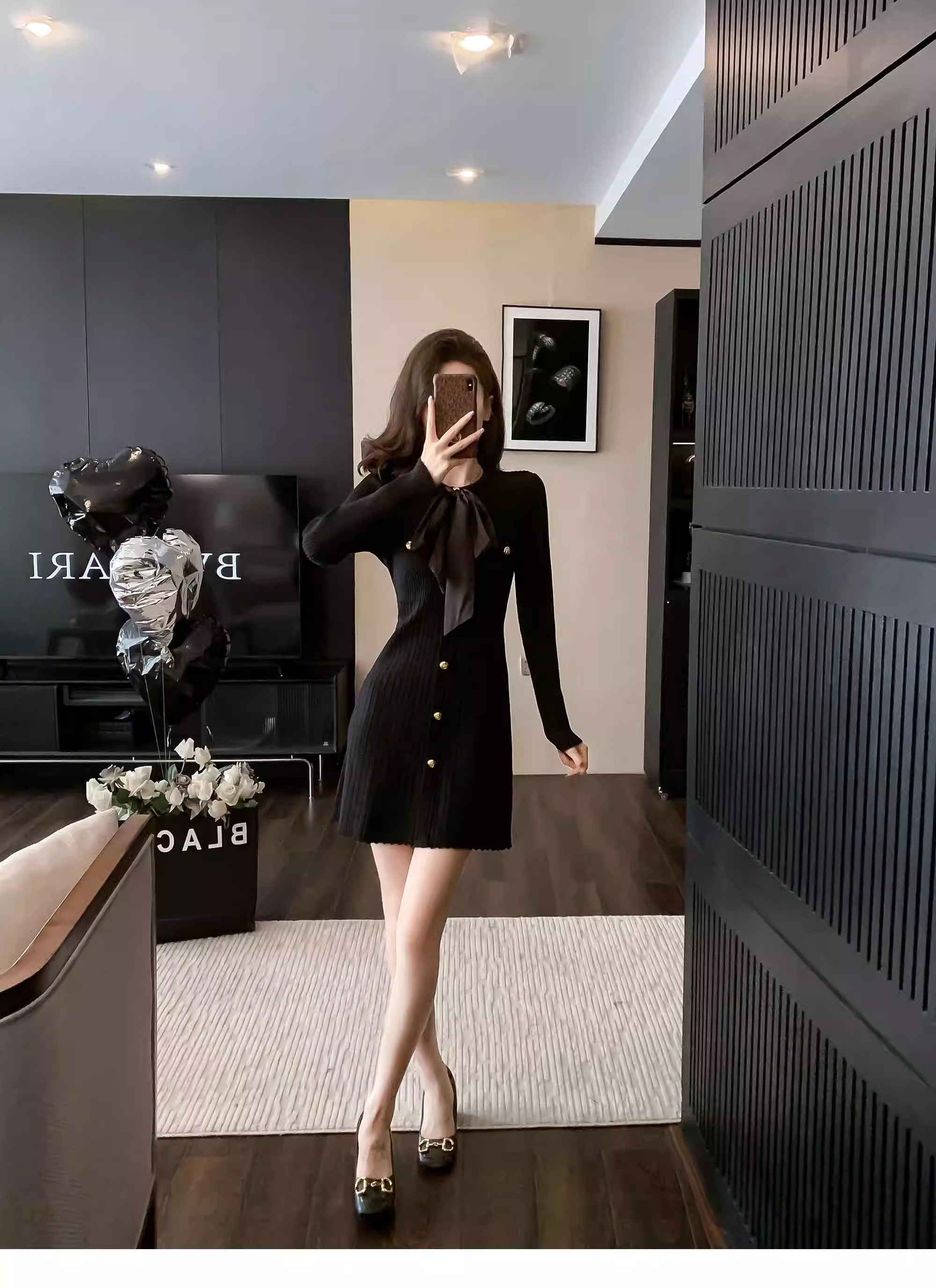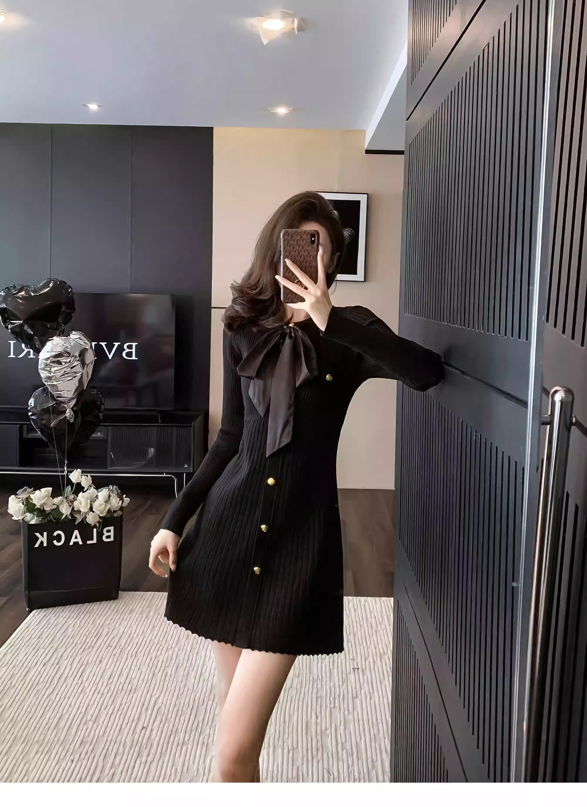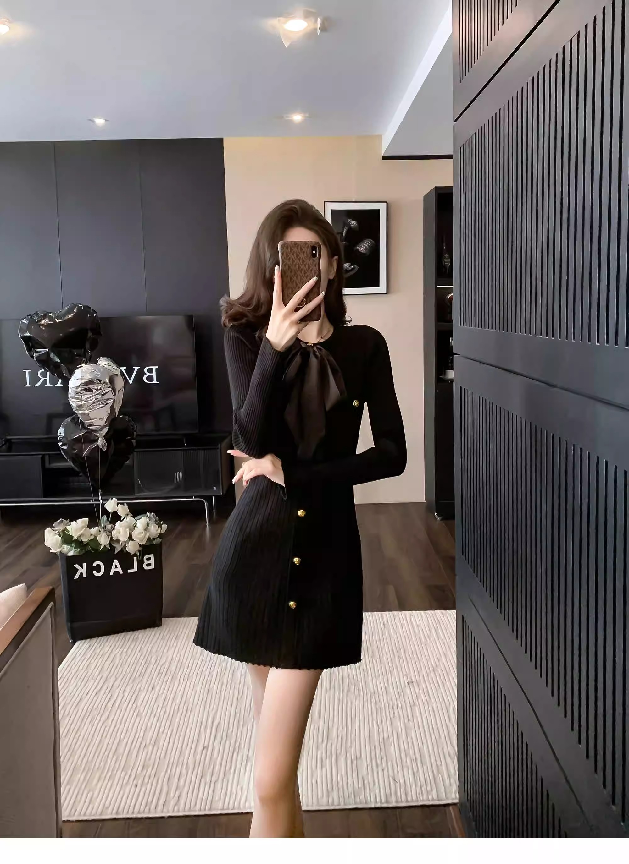 MY15946# 新款小香风甜美气质系带针织连衣裙收腰A字裙毛衣外穿打底裙女裝貨源服裝批發