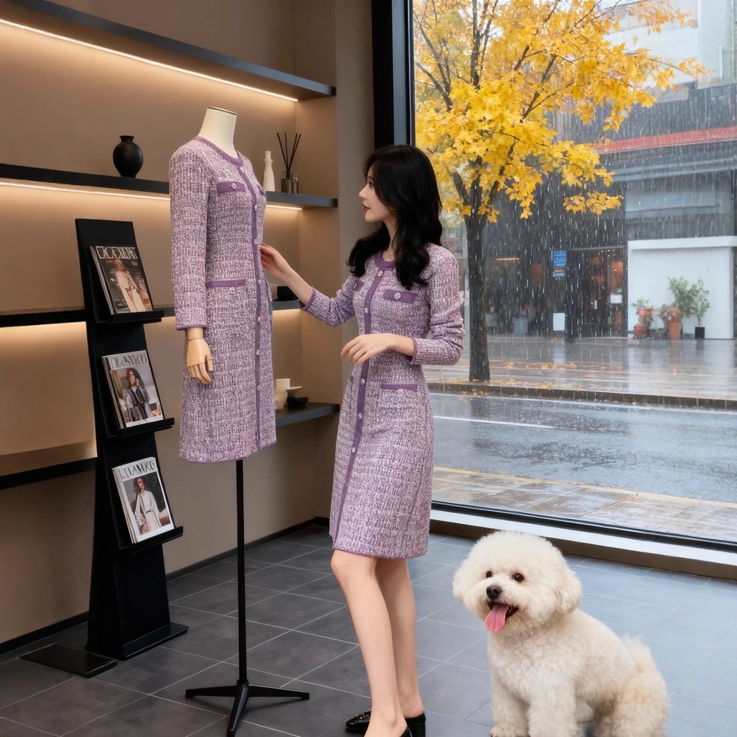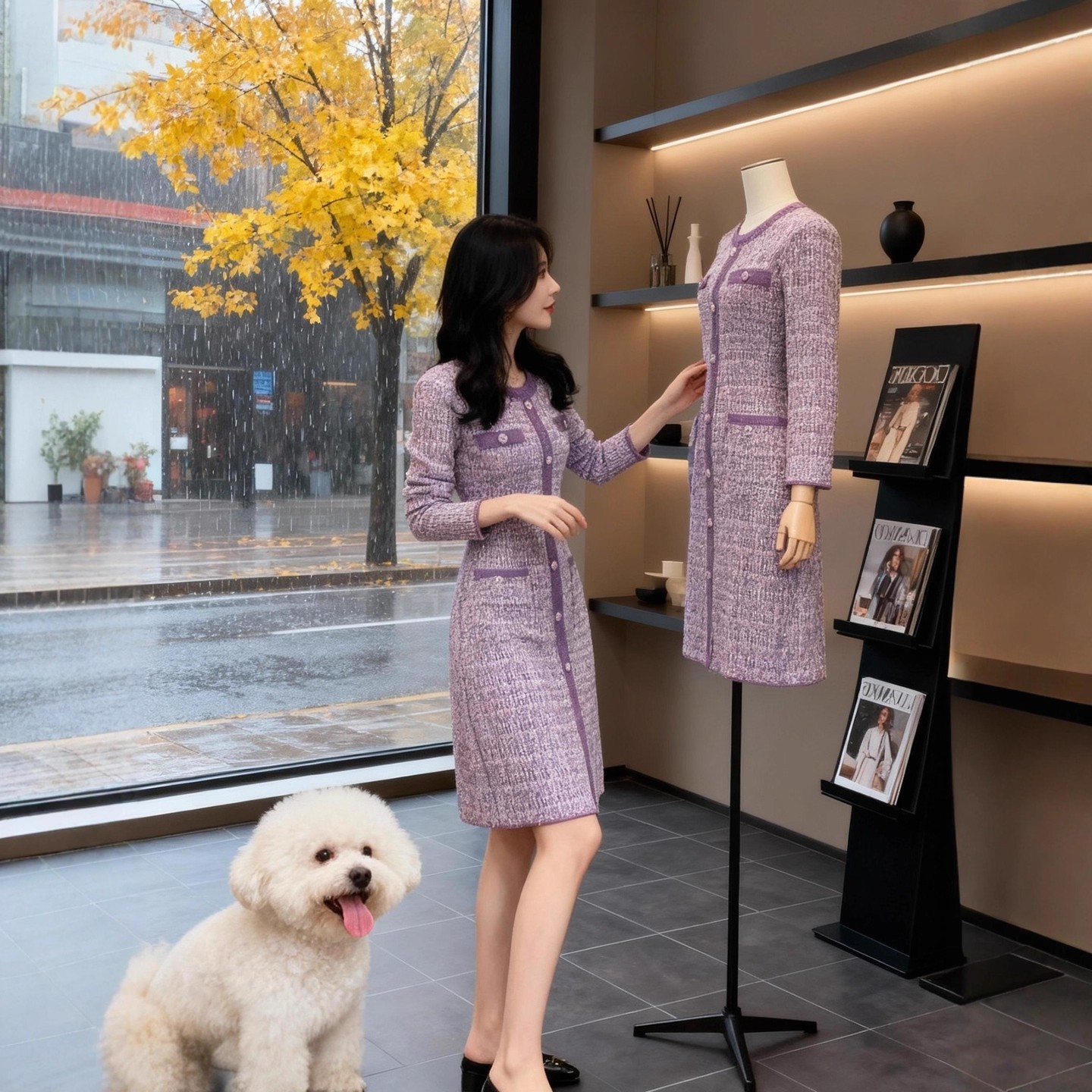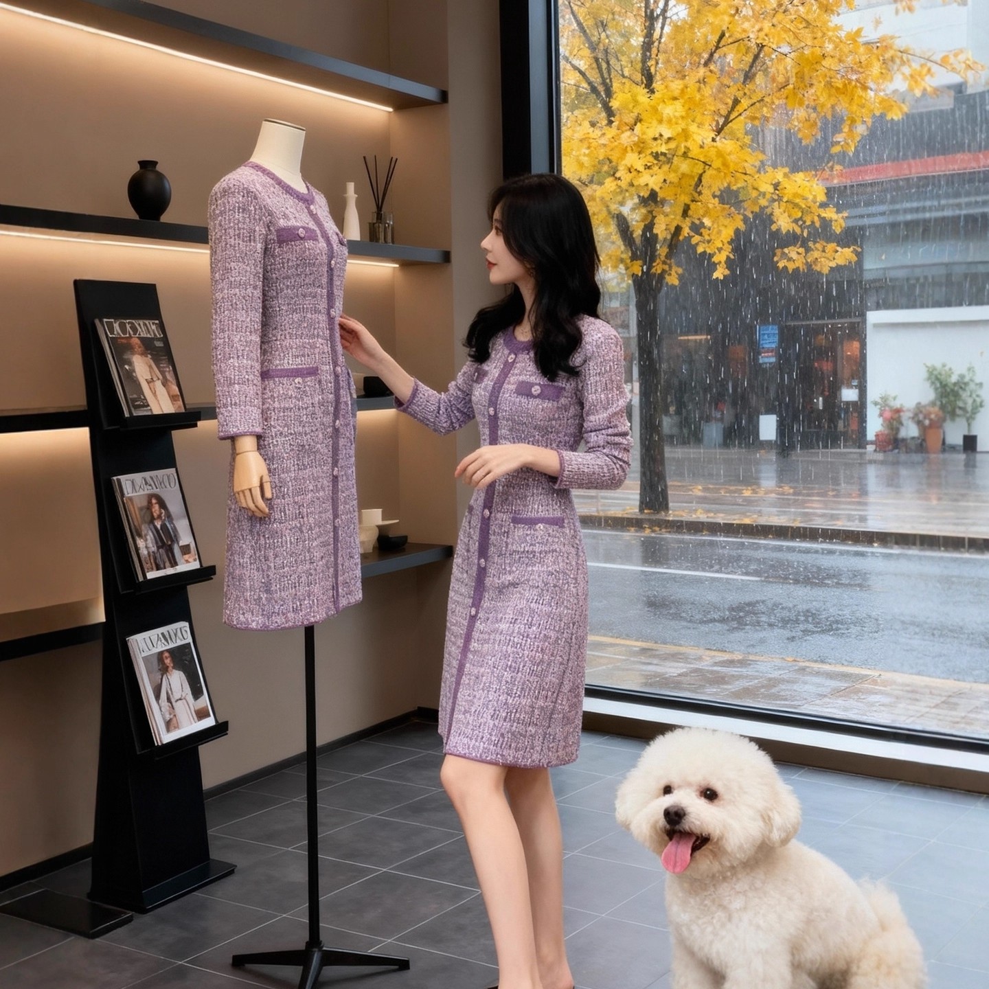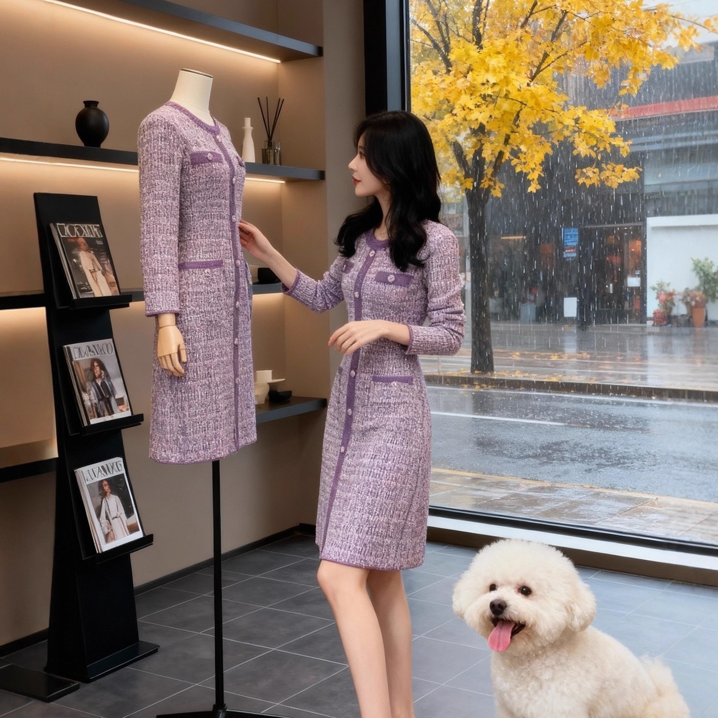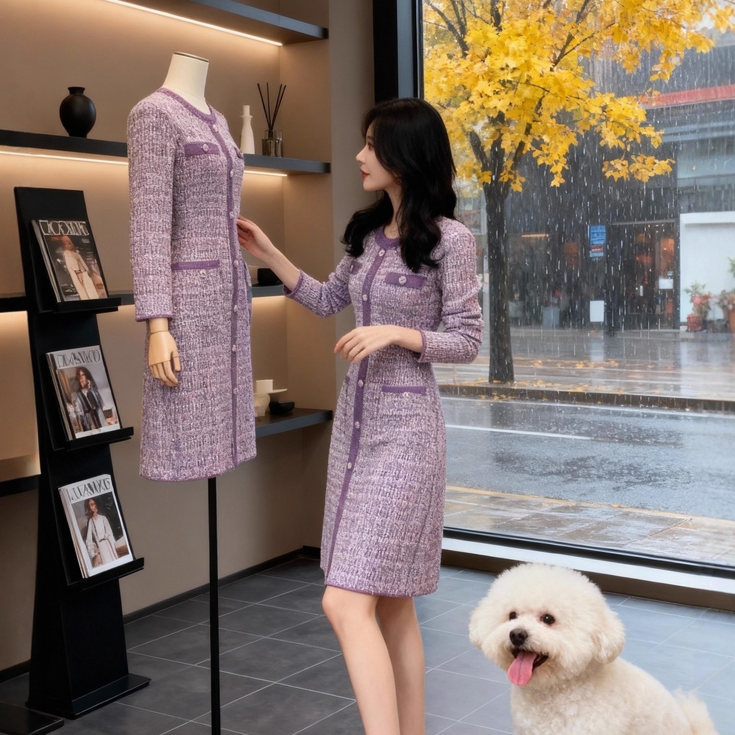 MY15949# 小香风紫色针织连衣裙新款修身收腰名媛气质排扣长裙子女裝貨源服裝批發