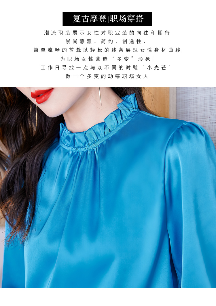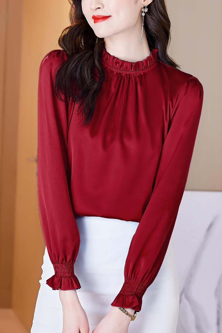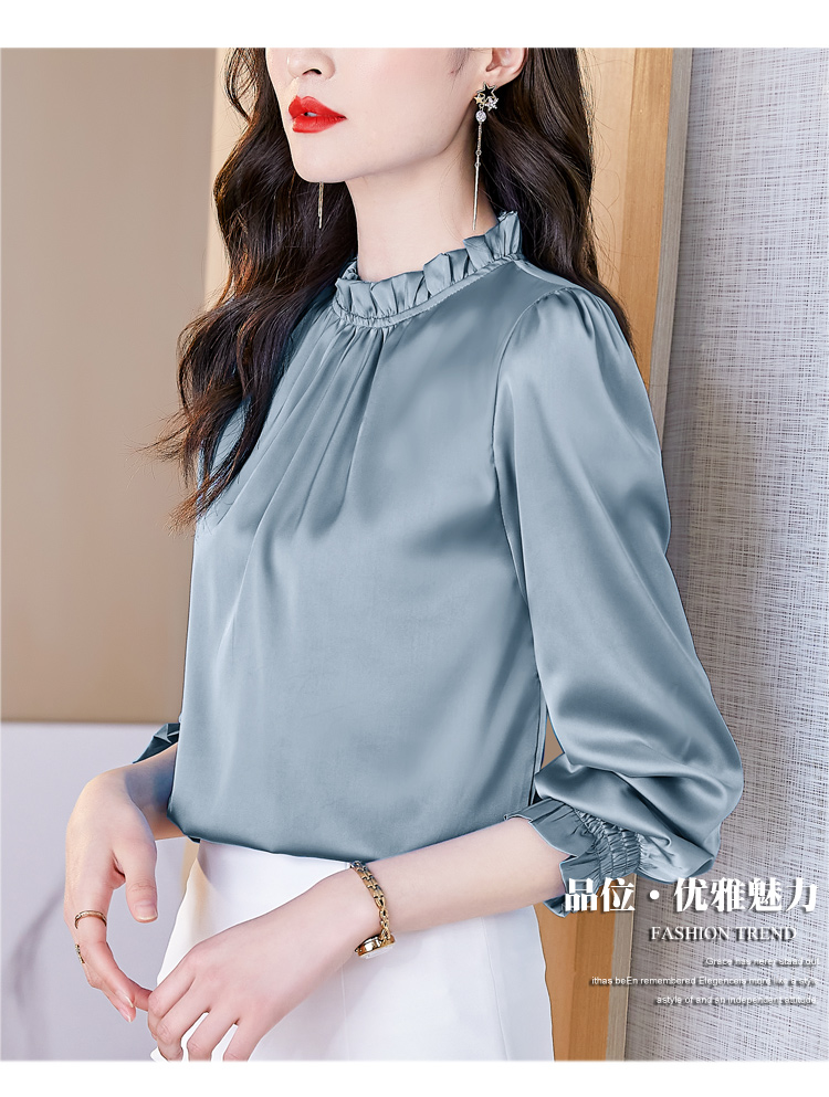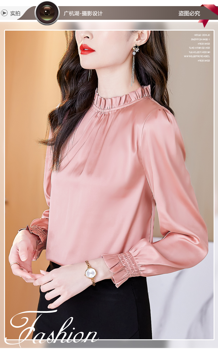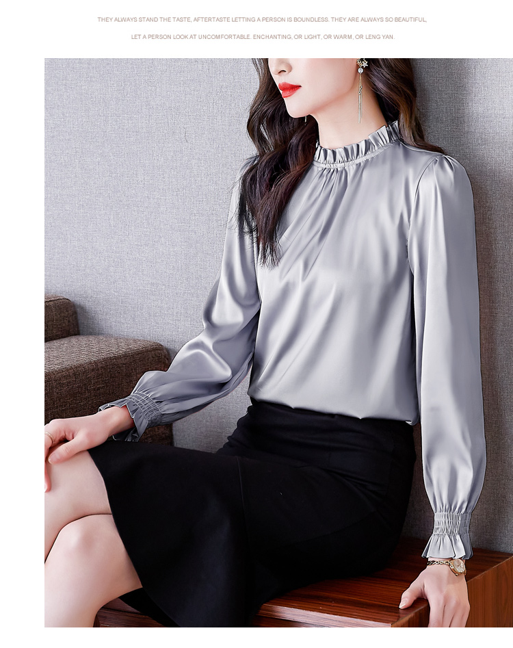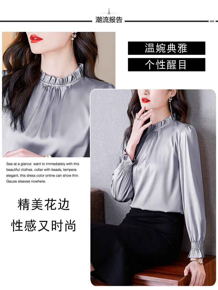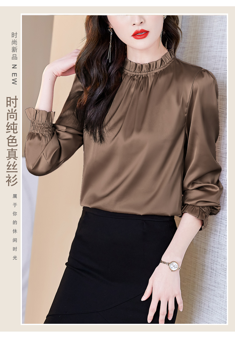 MY15957# 木耳边小衫洋气泡泡袖缎面桑蚕丝高端衬衣女气质真丝上衣女裝貨源服裝批發