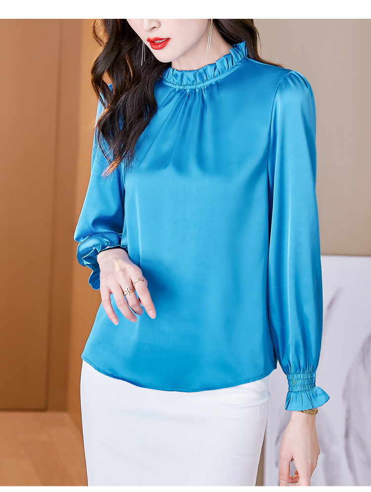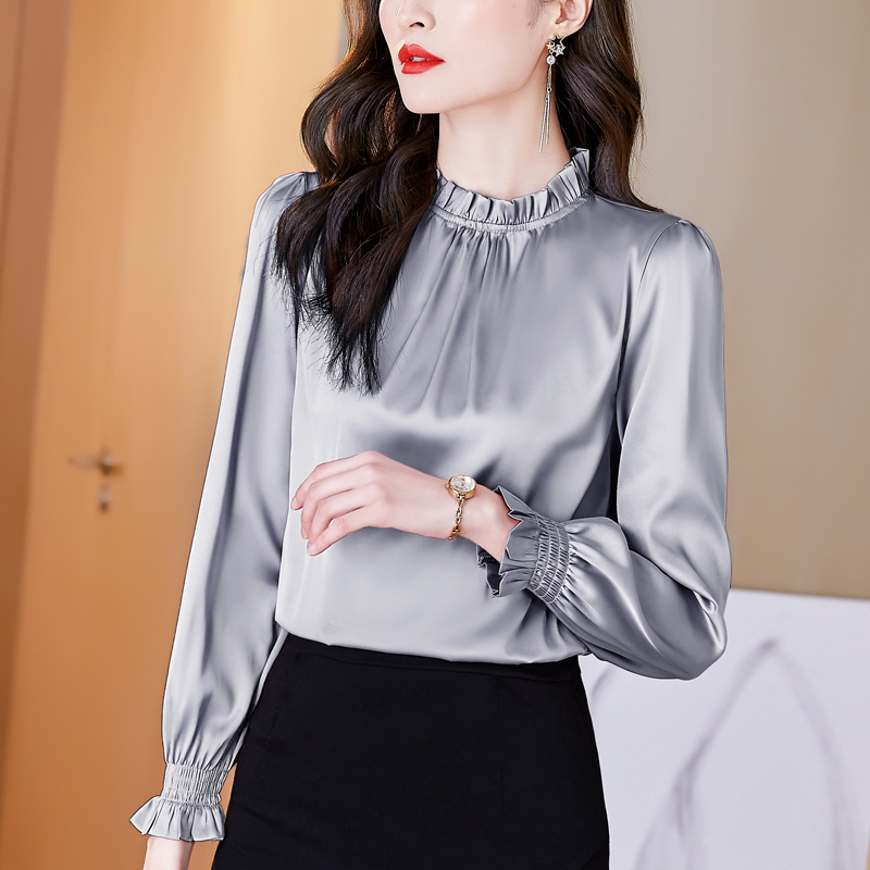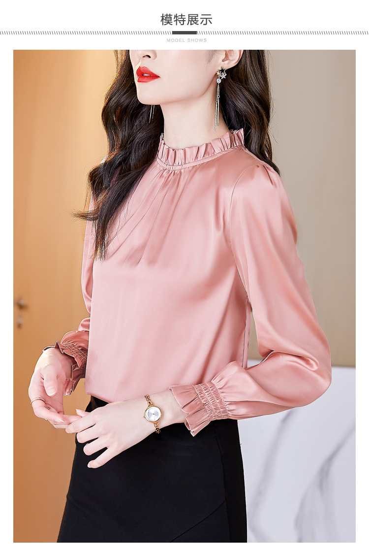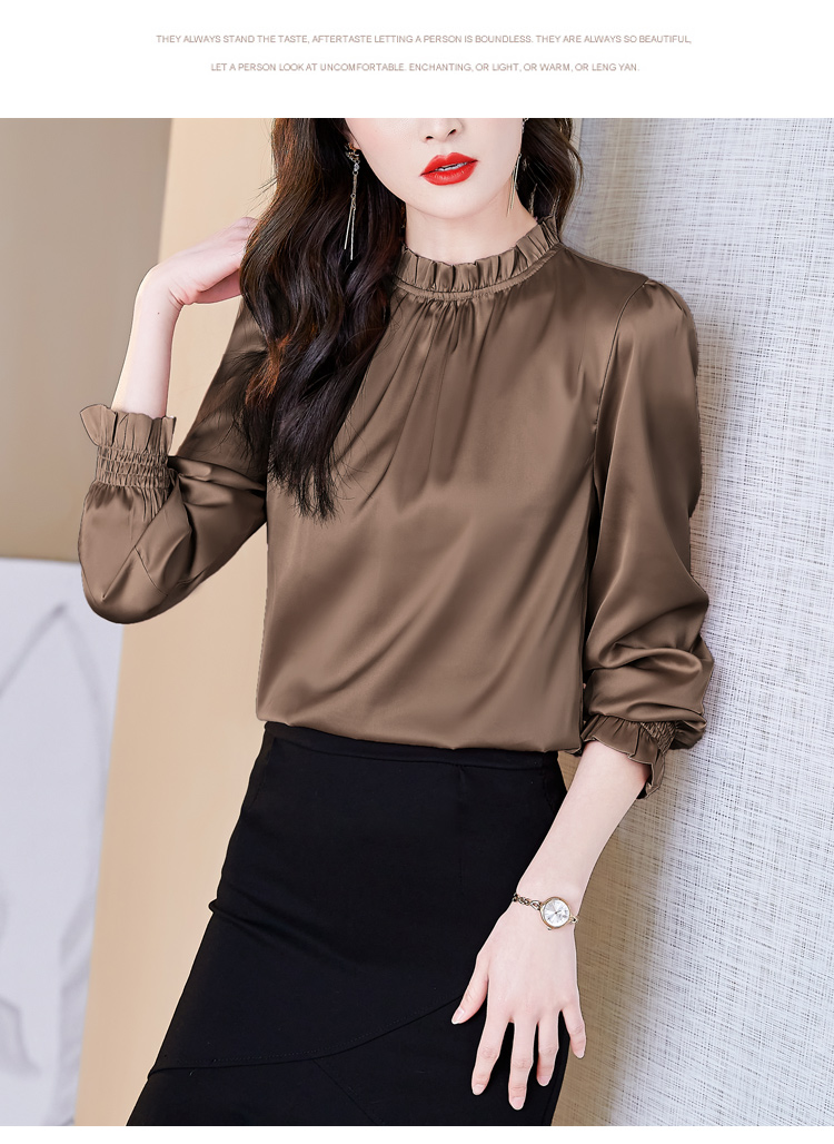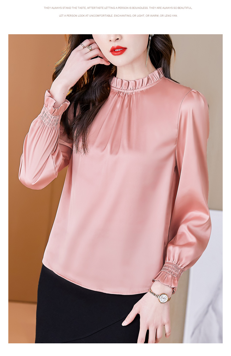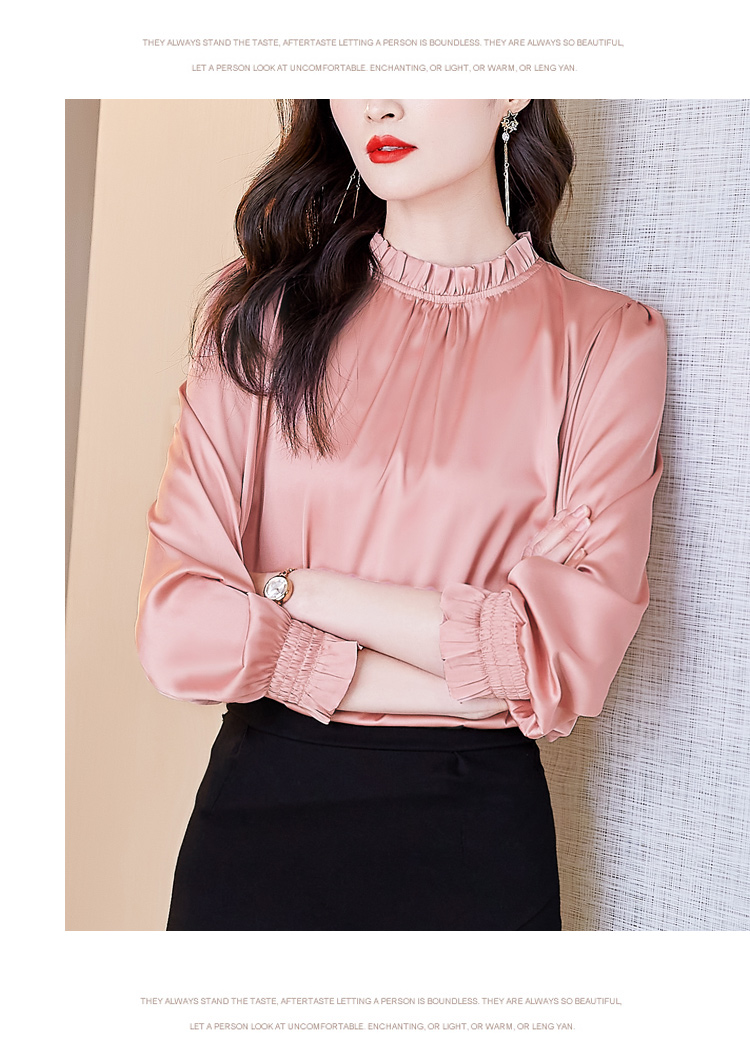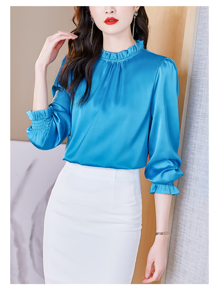 MY15957# 木耳边小衫洋气泡泡袖缎面桑蚕丝高端衬衣女气质真丝上衣女裝貨源服裝批發
