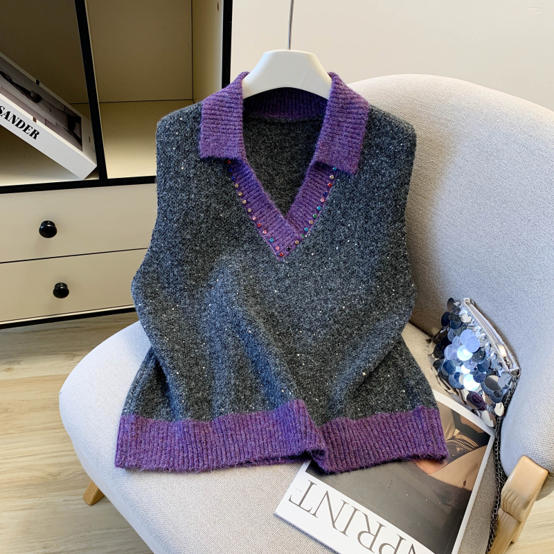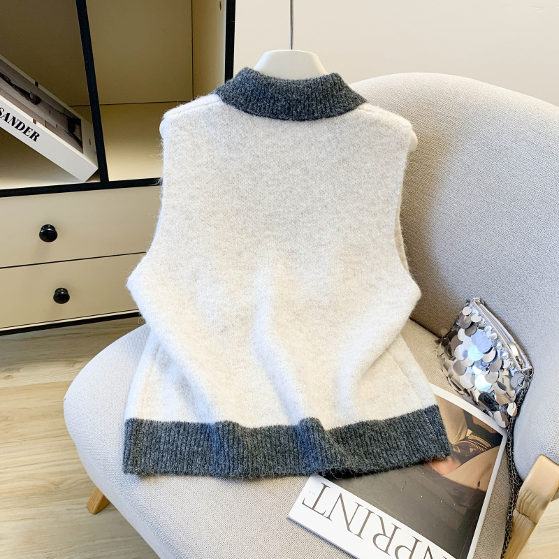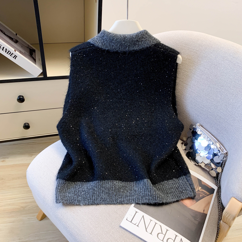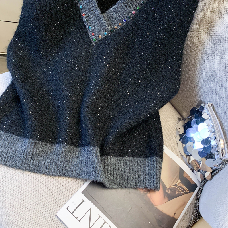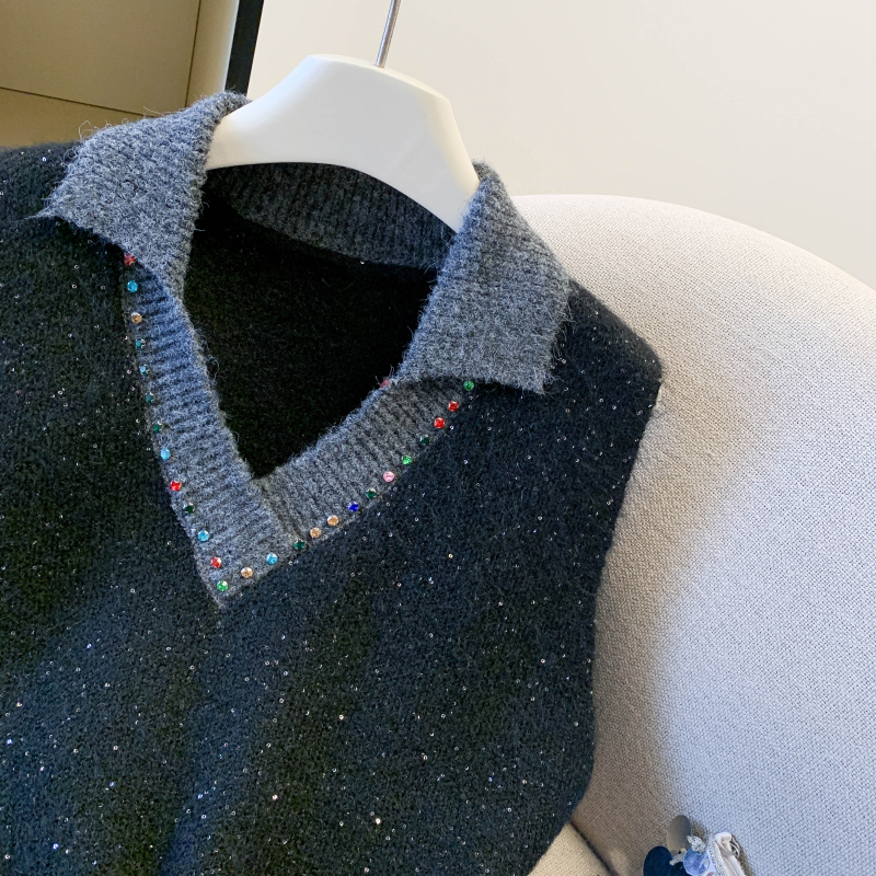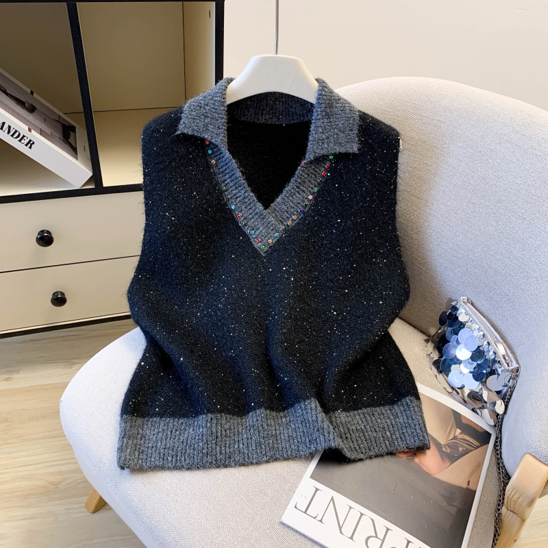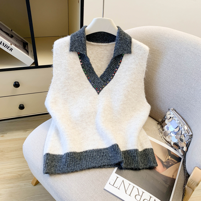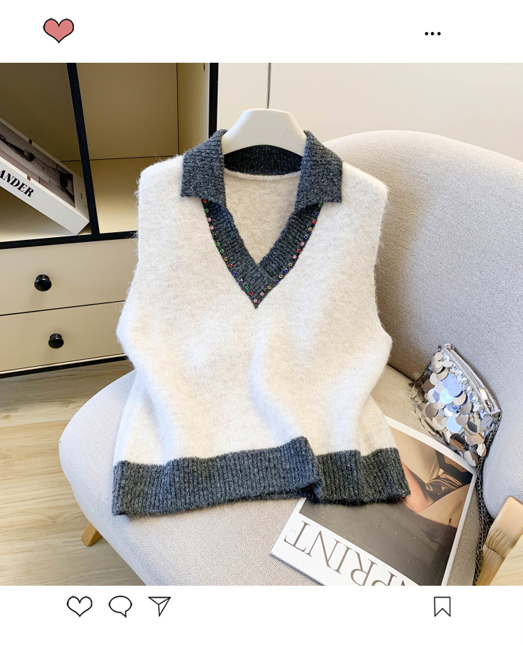 MY15960# 高级感撞色烫钻V领马甲外穿叠穿洋气时尚百搭女裝貨源服裝批發