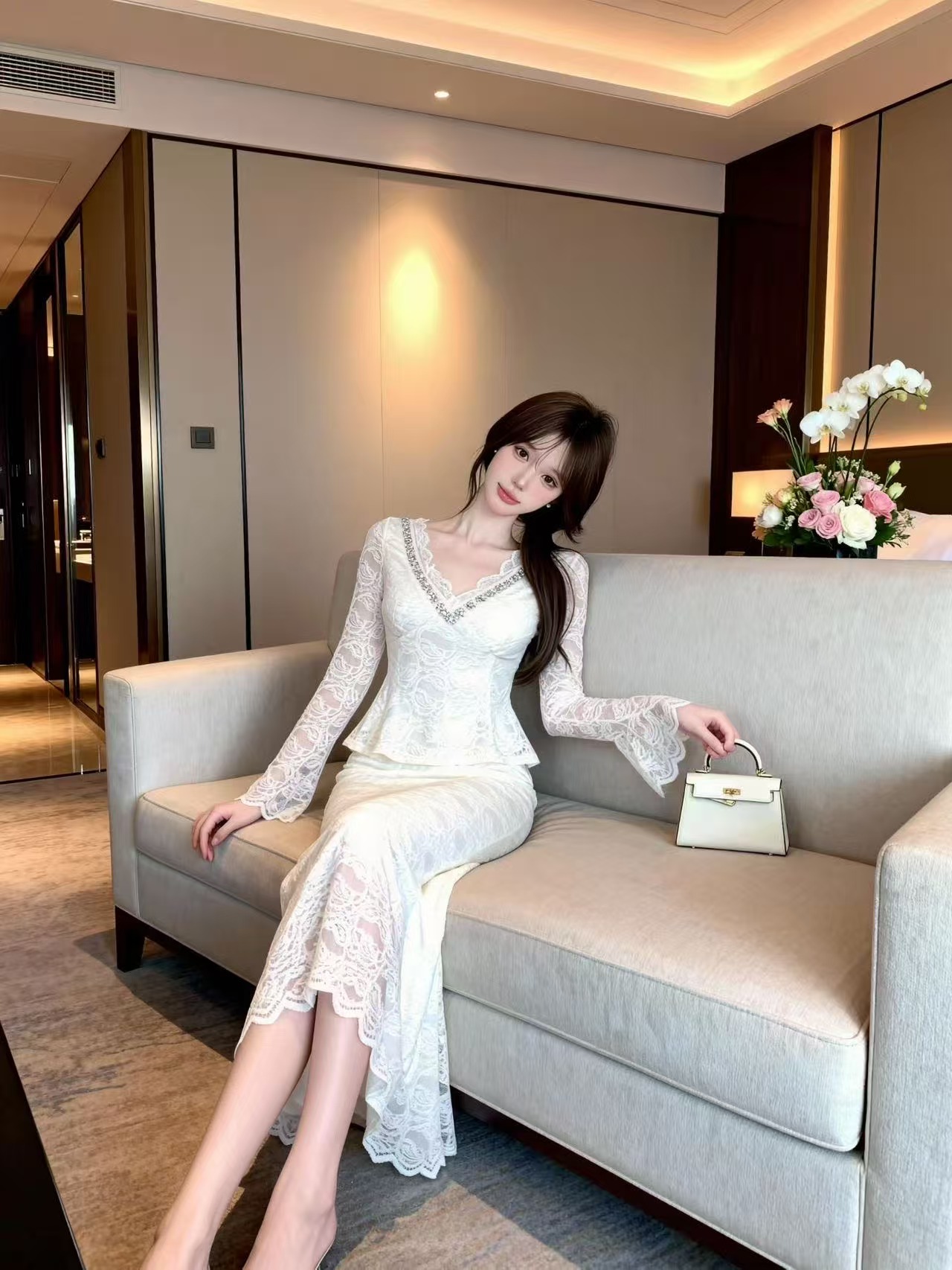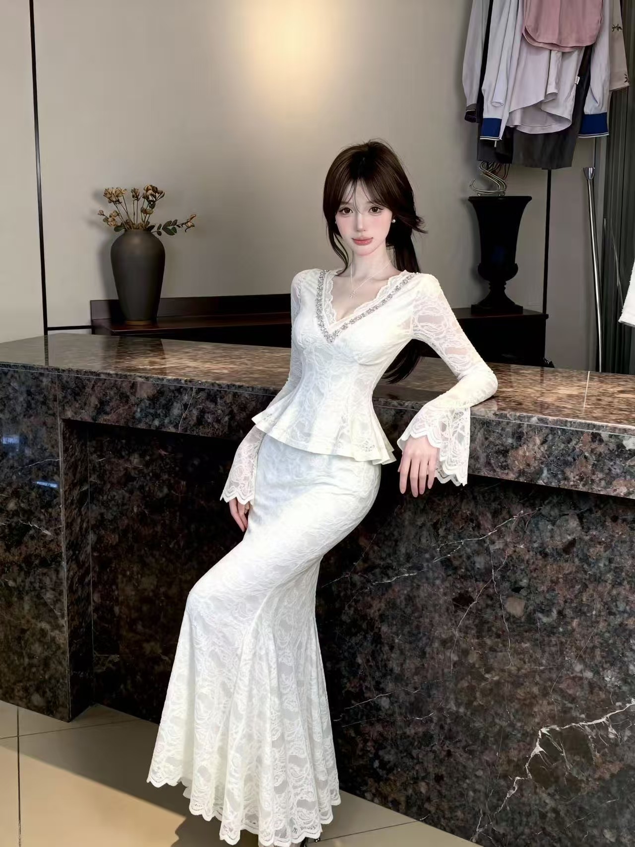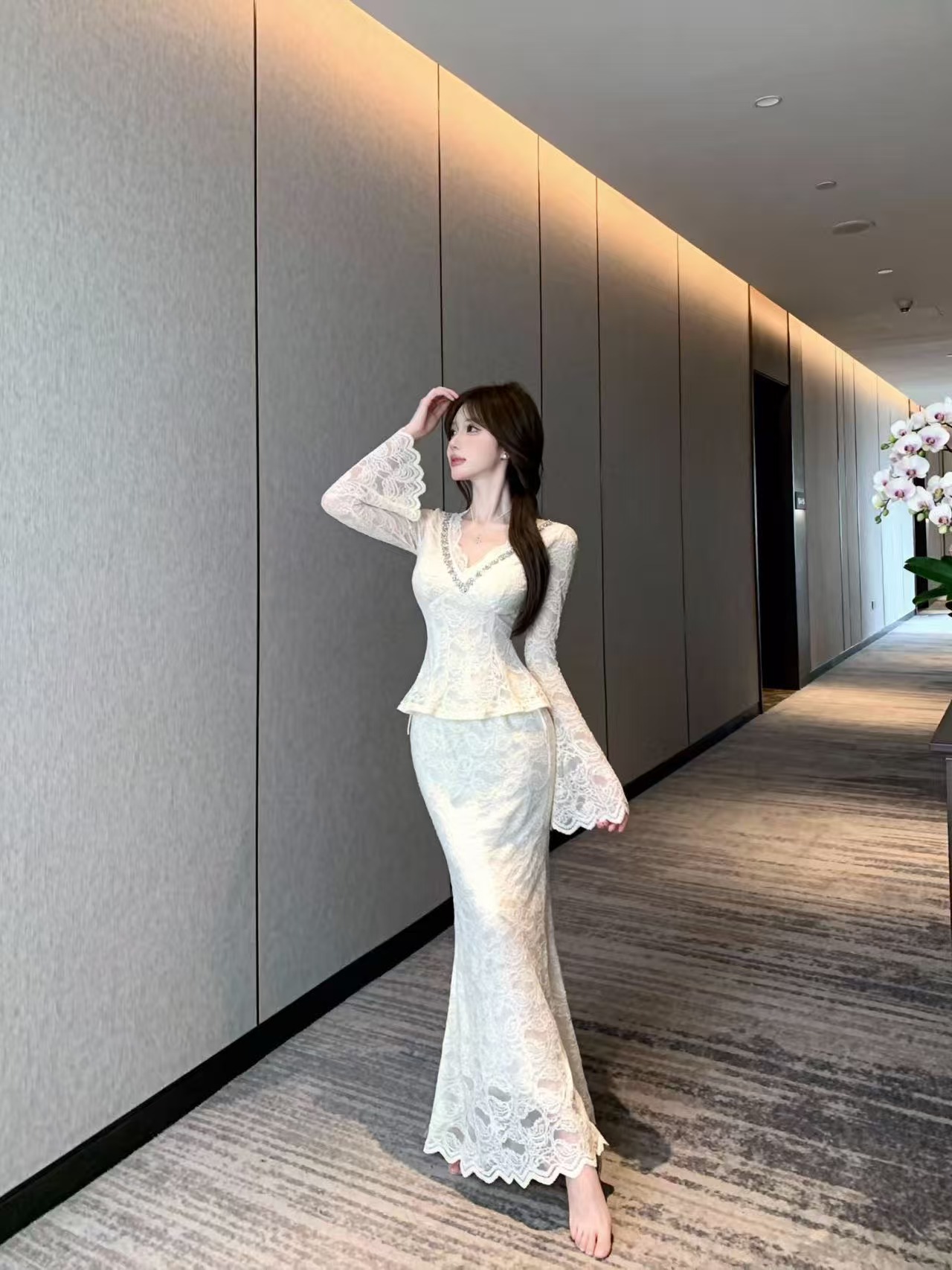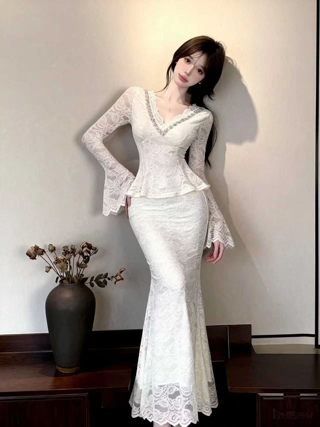 MY15967# 法式名媛穿搭洋气高级感V领收腰蕾丝上衣高腰包臀半裙裙套装女裝貨源服裝批發
