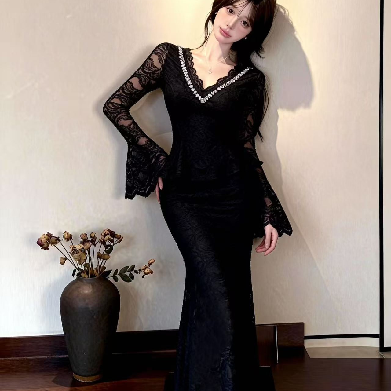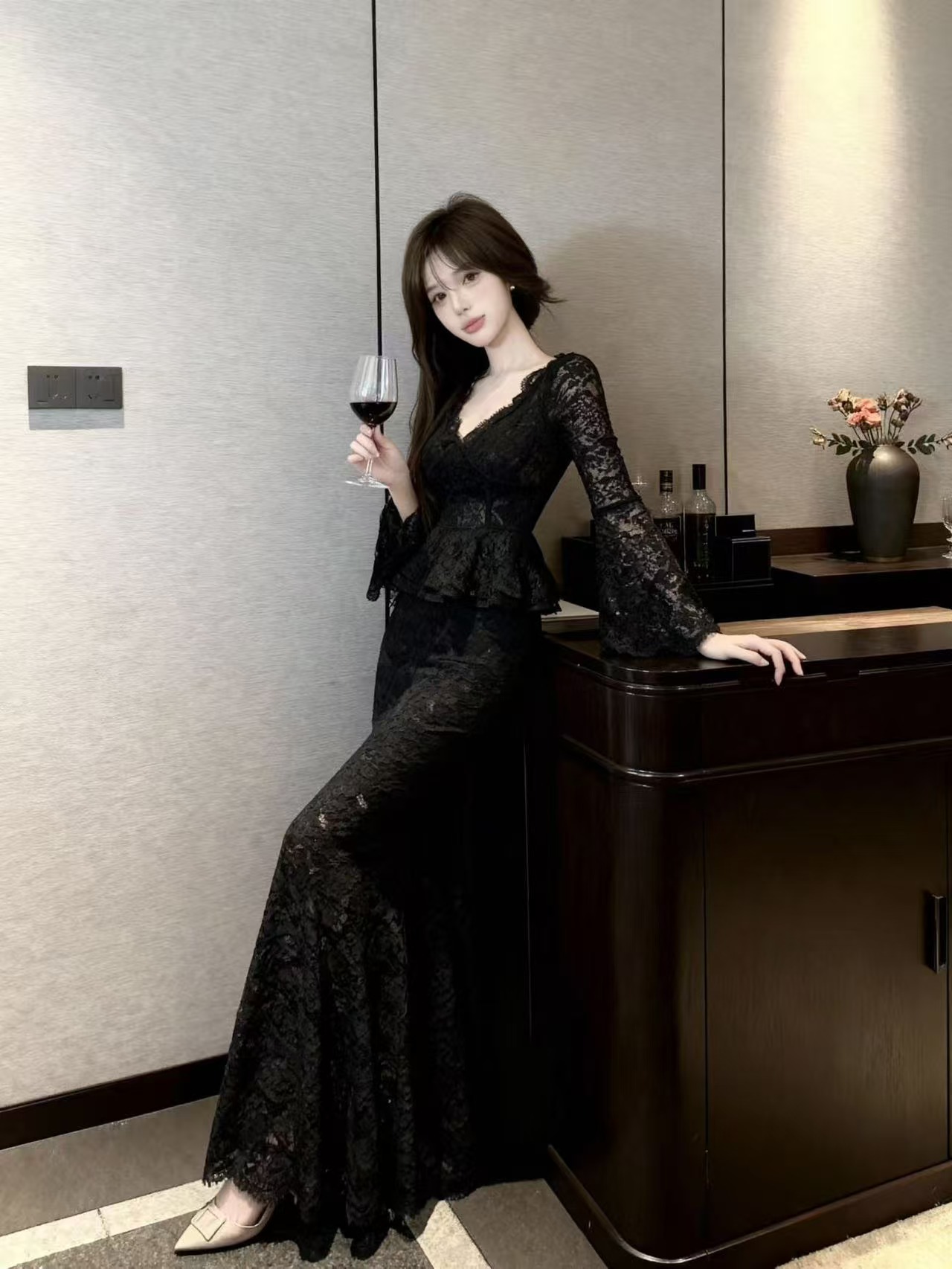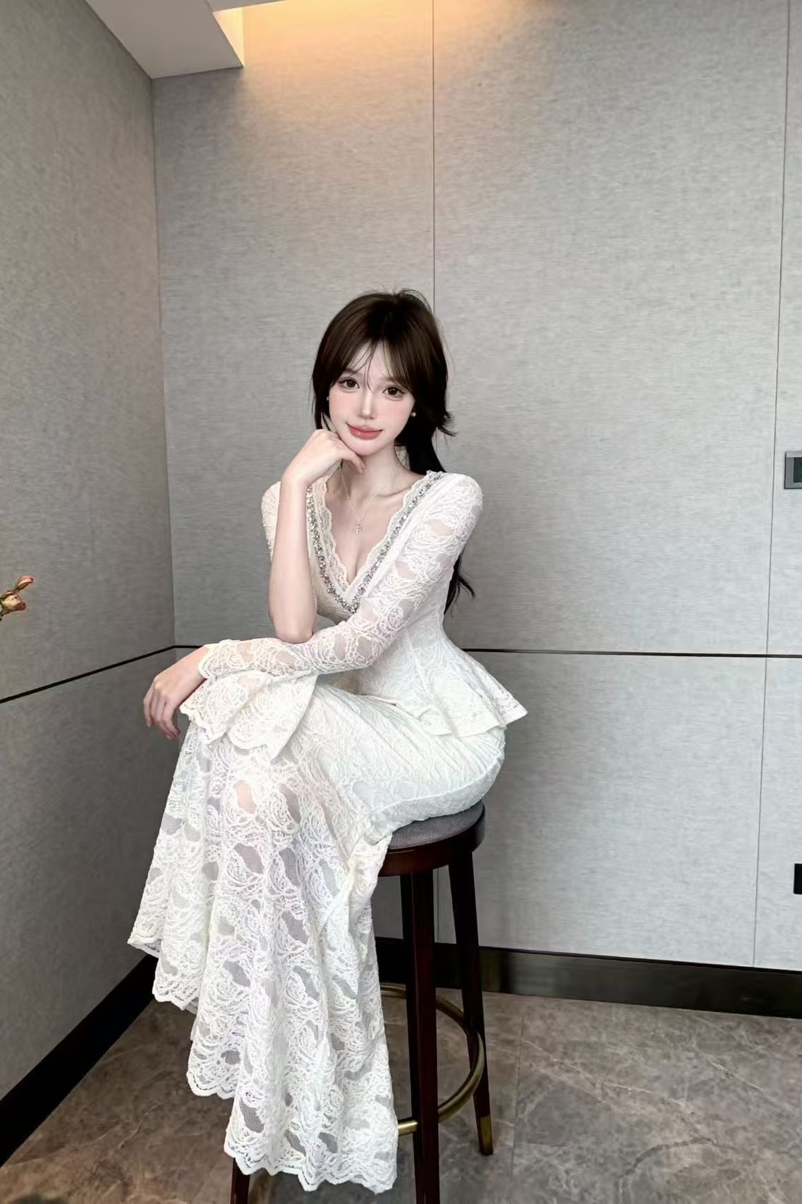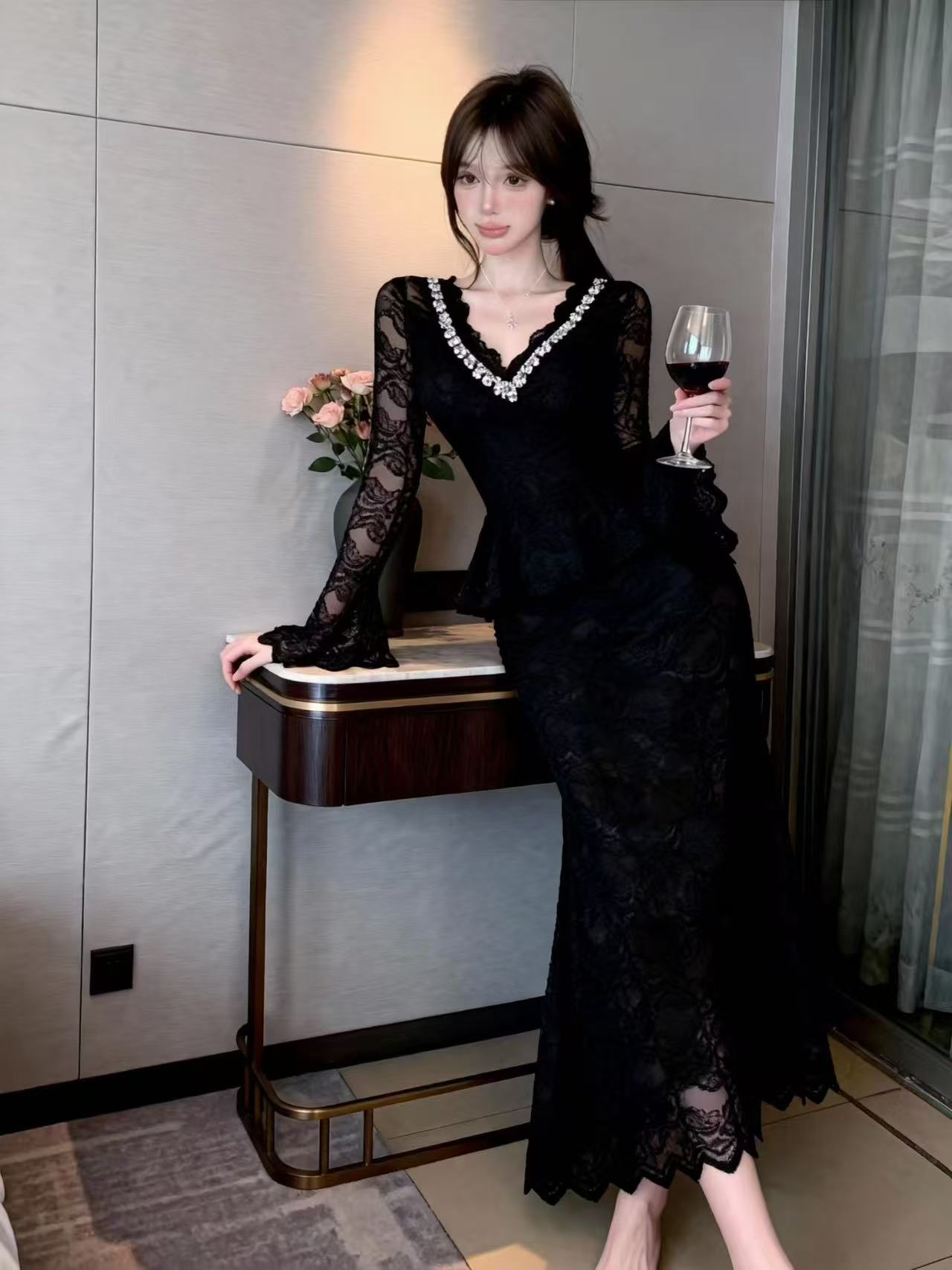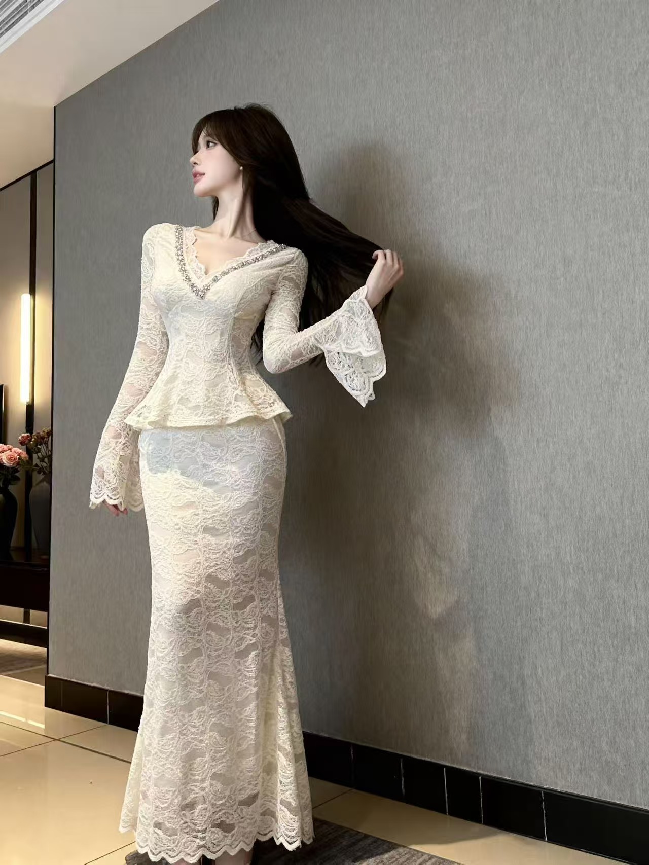 MY15967# 法式名媛穿搭洋气高级感V领收腰蕾丝上衣高腰包臀半裙裙套装女裝貨源服裝批發
