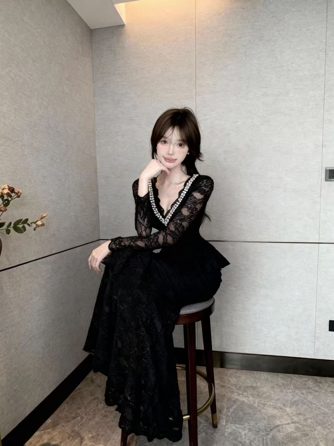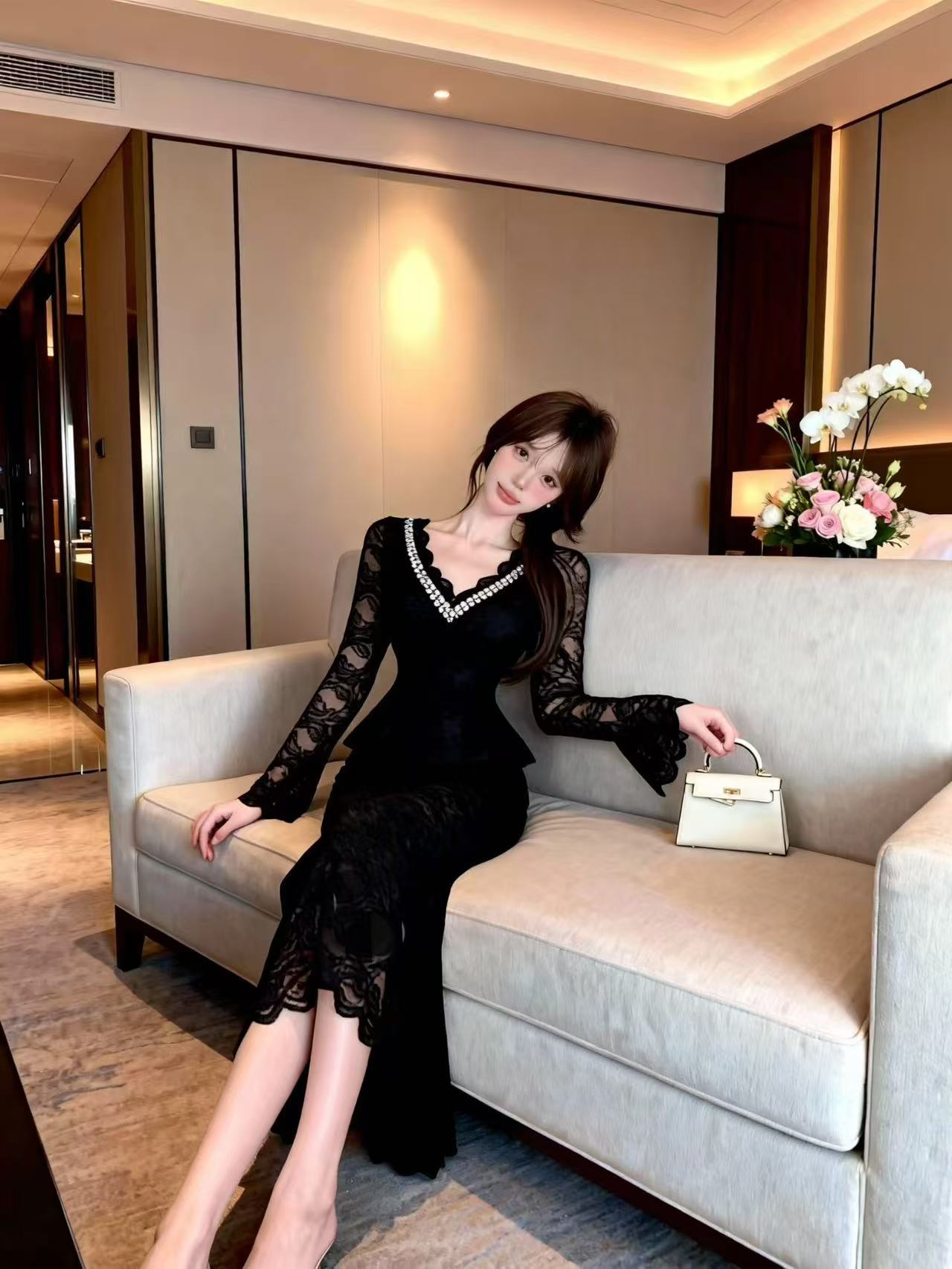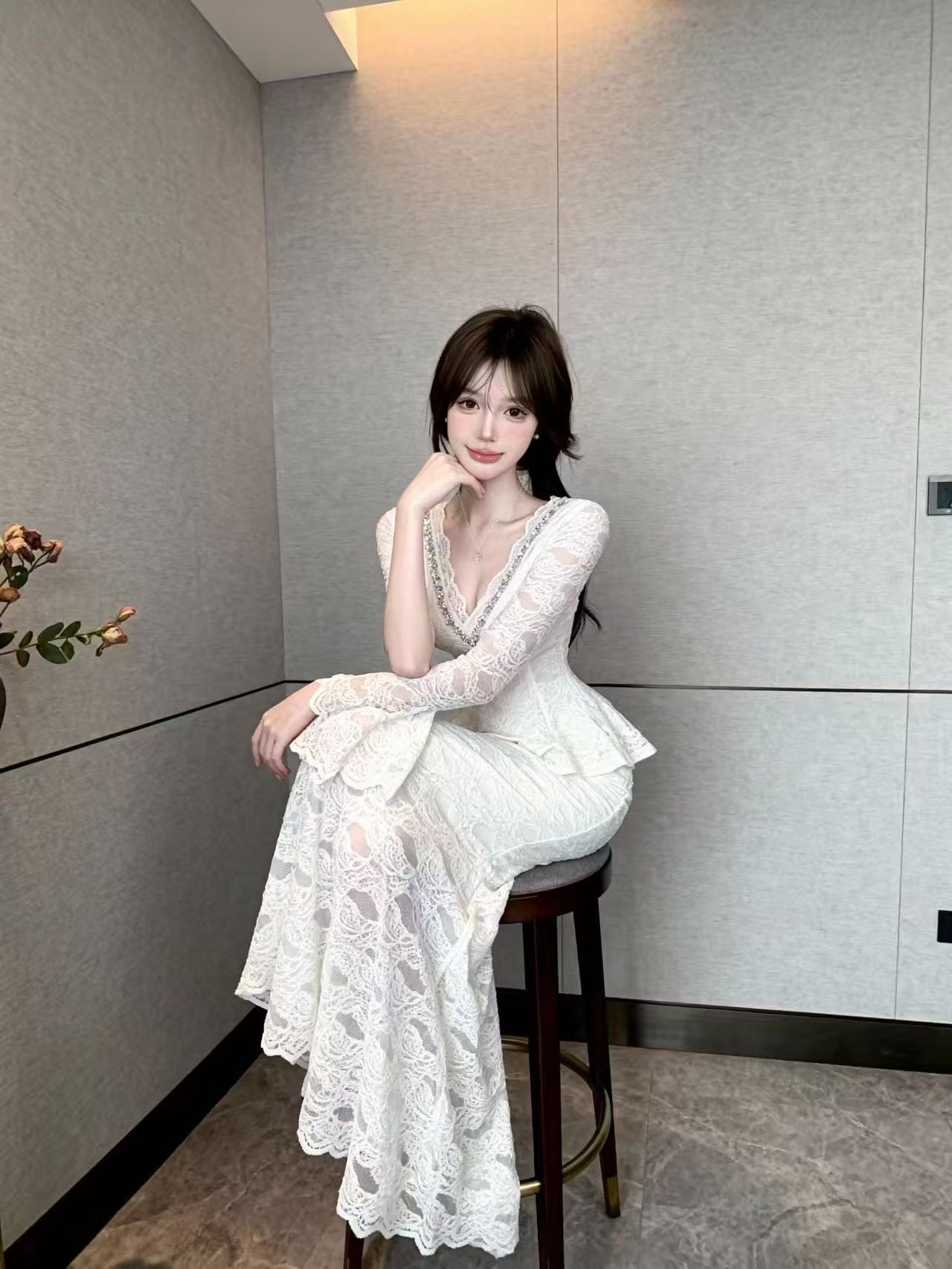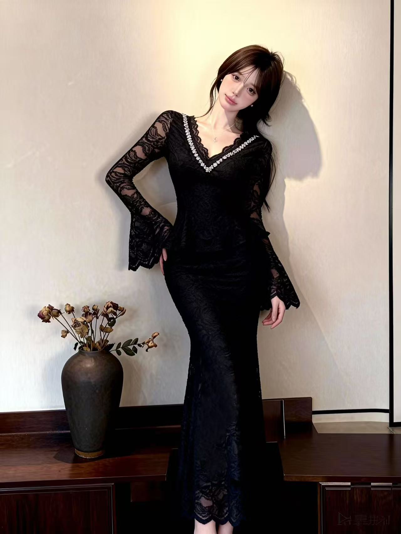 MY15967# 法式名媛穿搭洋气高级感V领收腰蕾丝上衣高腰包臀半裙裙套装女裝貨源服裝批發