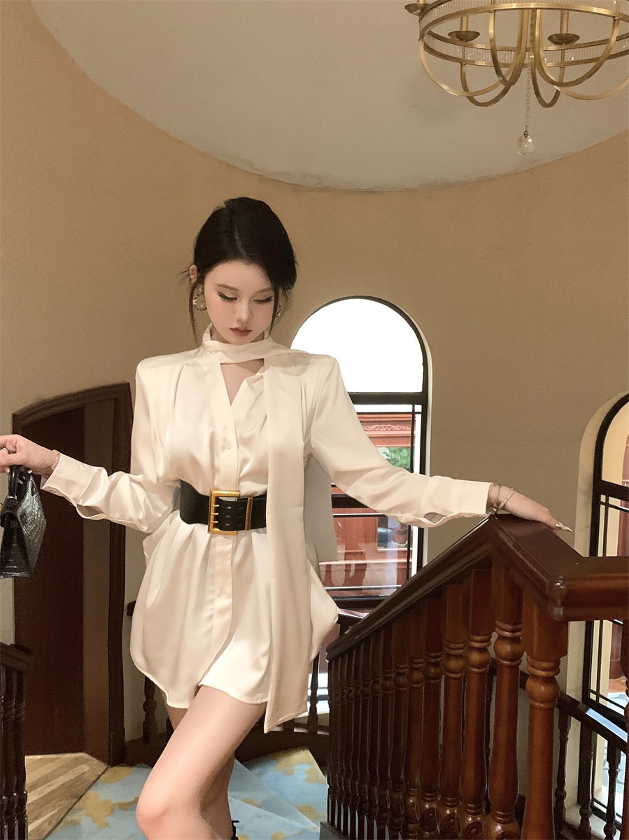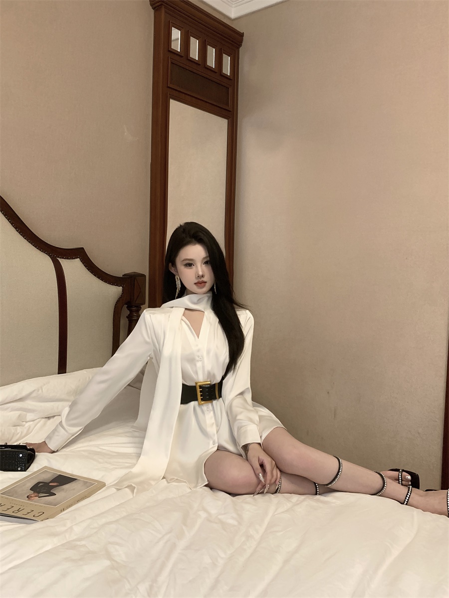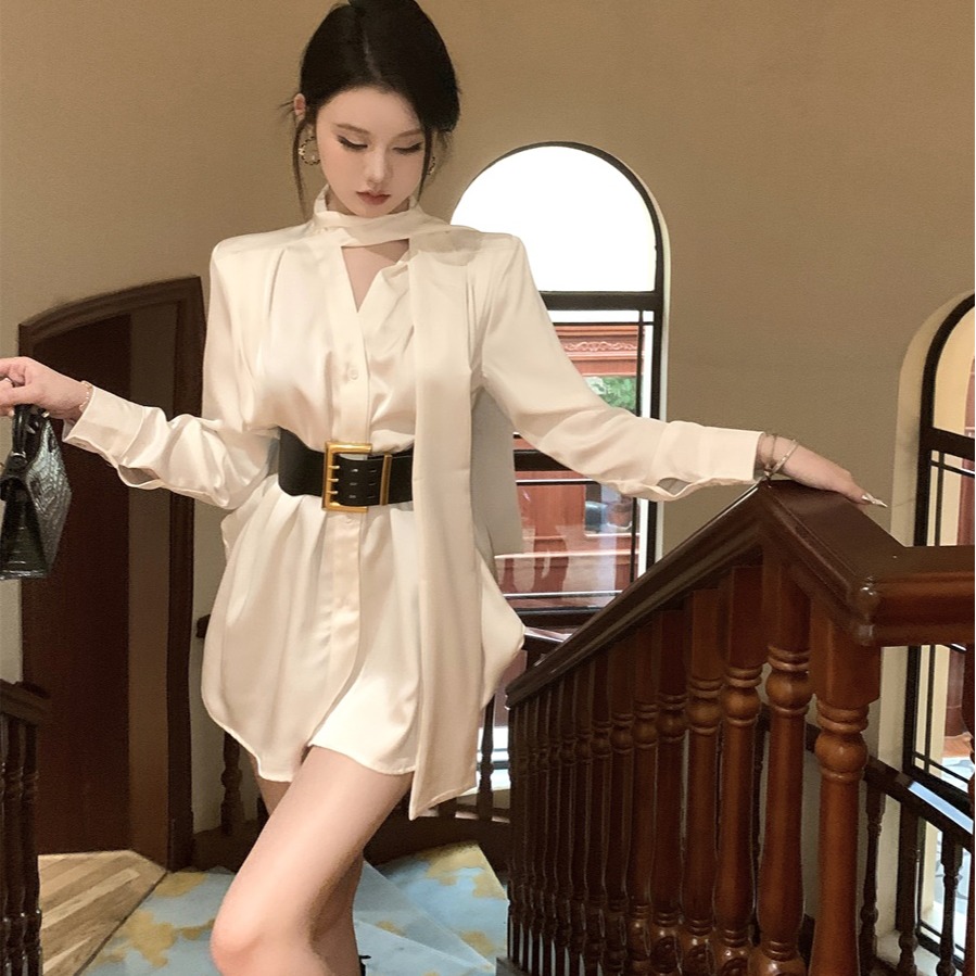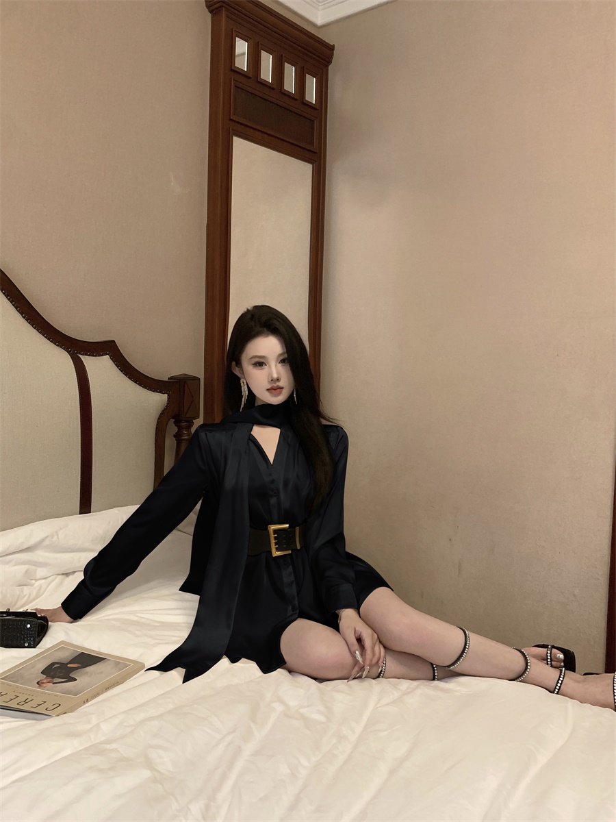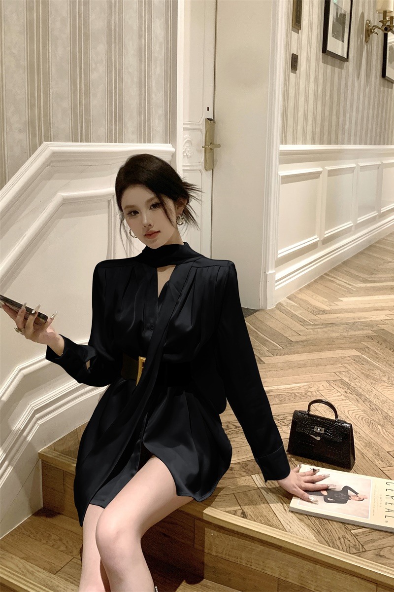 MY15968# 法式气质名媛高级感缎面衬衫连衣裙夏季不规则气质短裙女装女裝貨源服裝批發