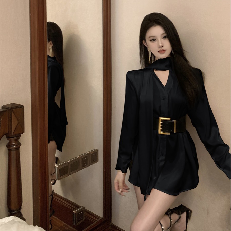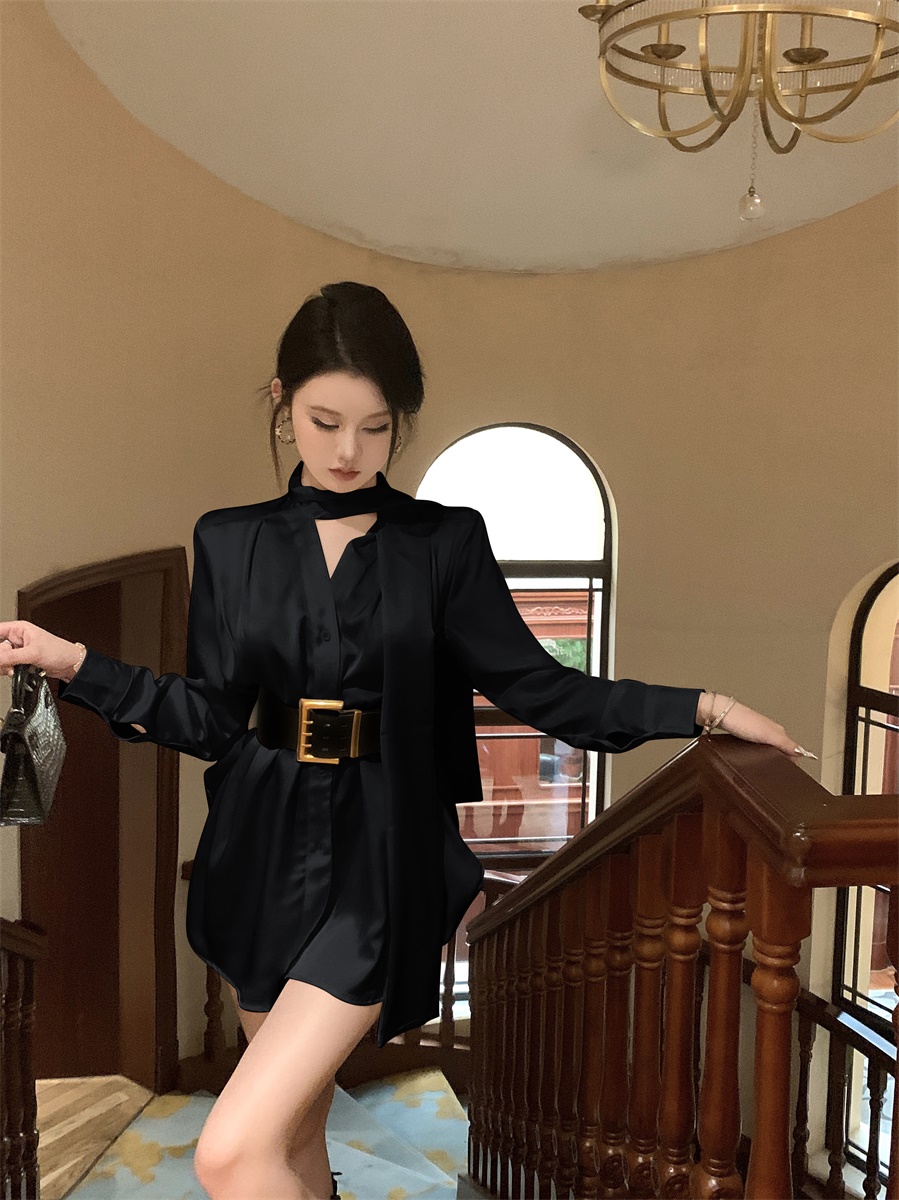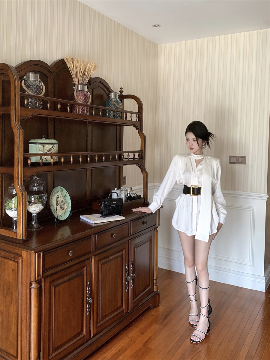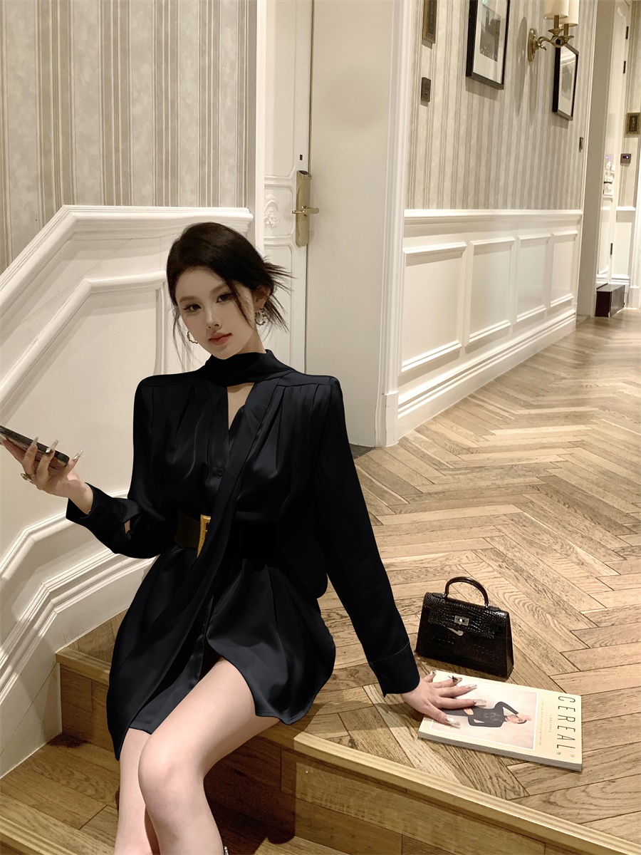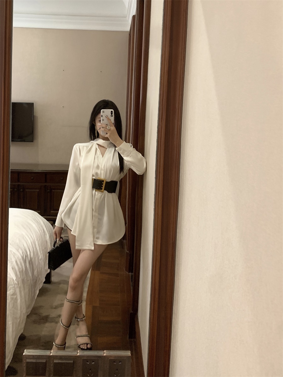 MY15968# 法式气质名媛高级感缎面衬衫连衣裙夏季不规则气质短裙女装女裝貨源服裝批發