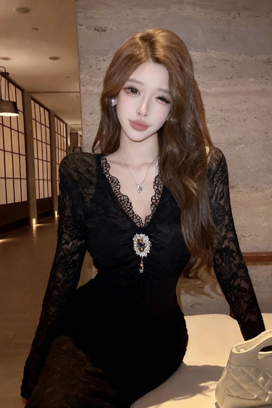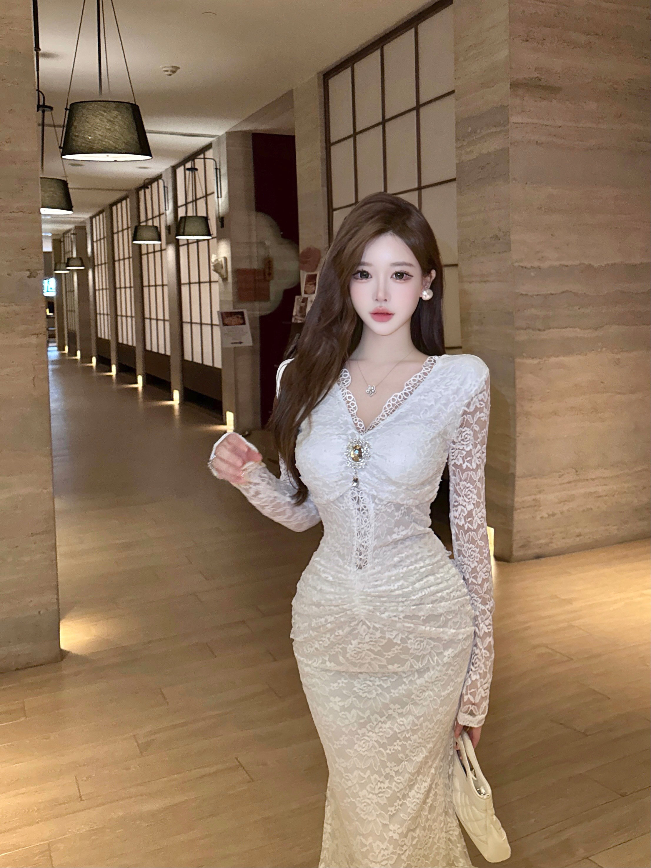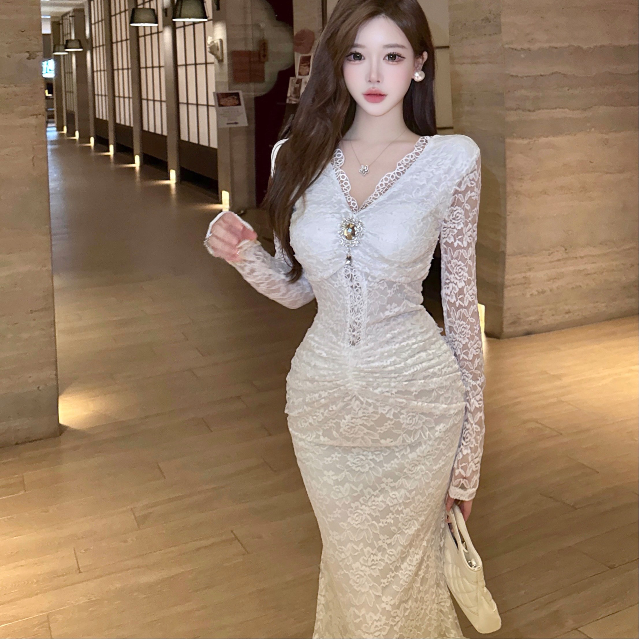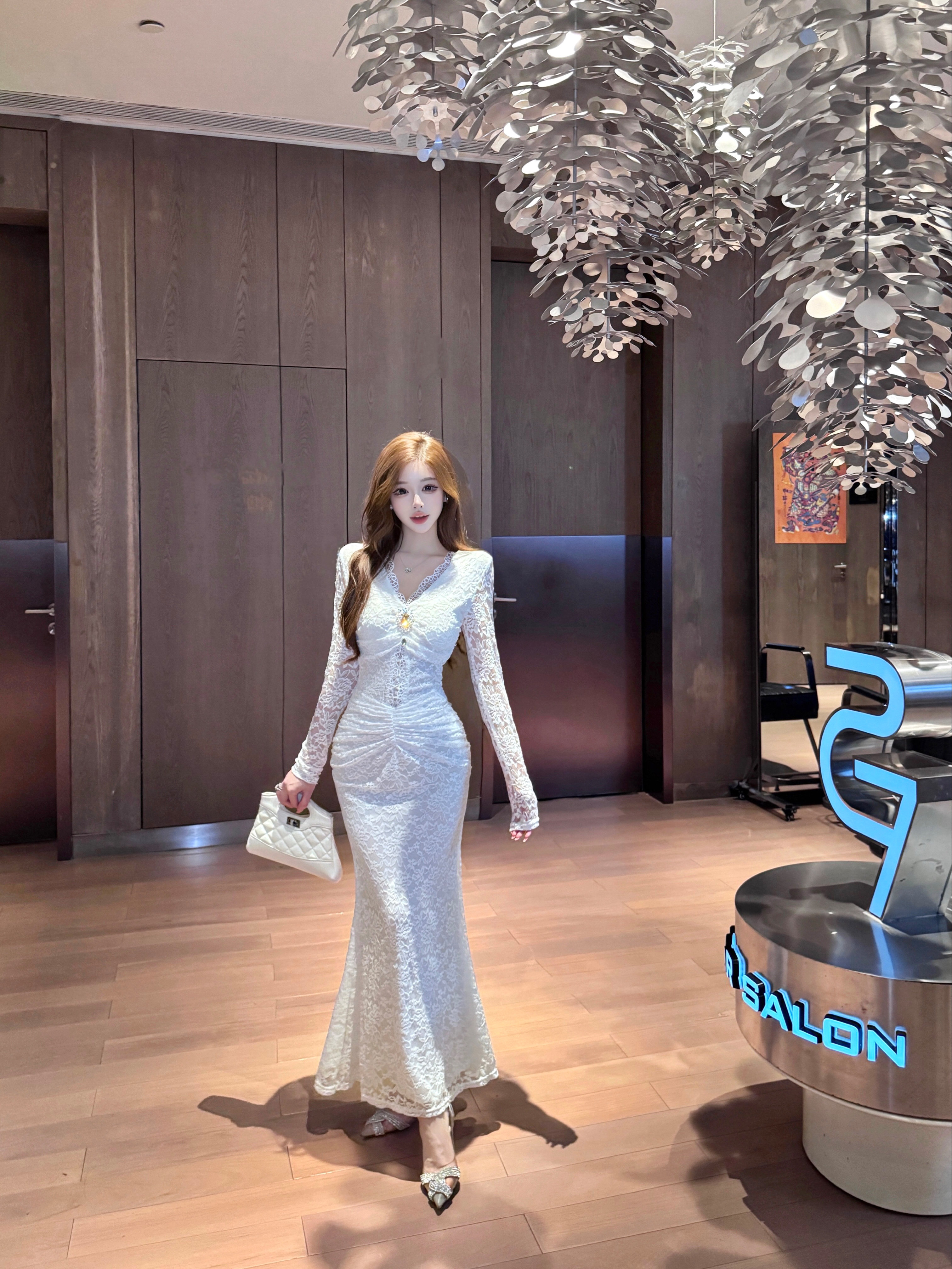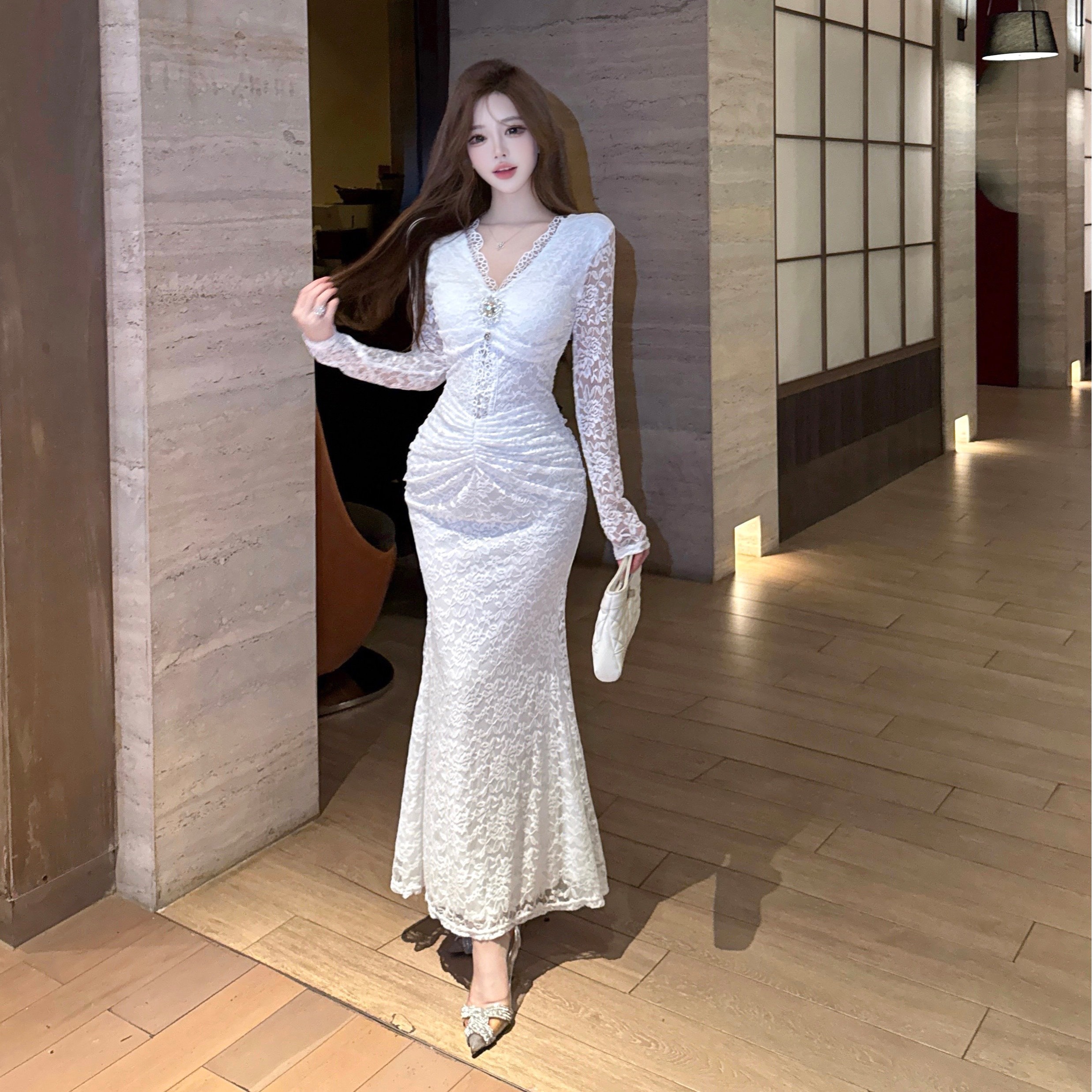 MY15969# 赫小木香风时尚气质v领连衣裙收腰显瘦打底鱼尾裙高级感长裙女裝貨源服裝批發