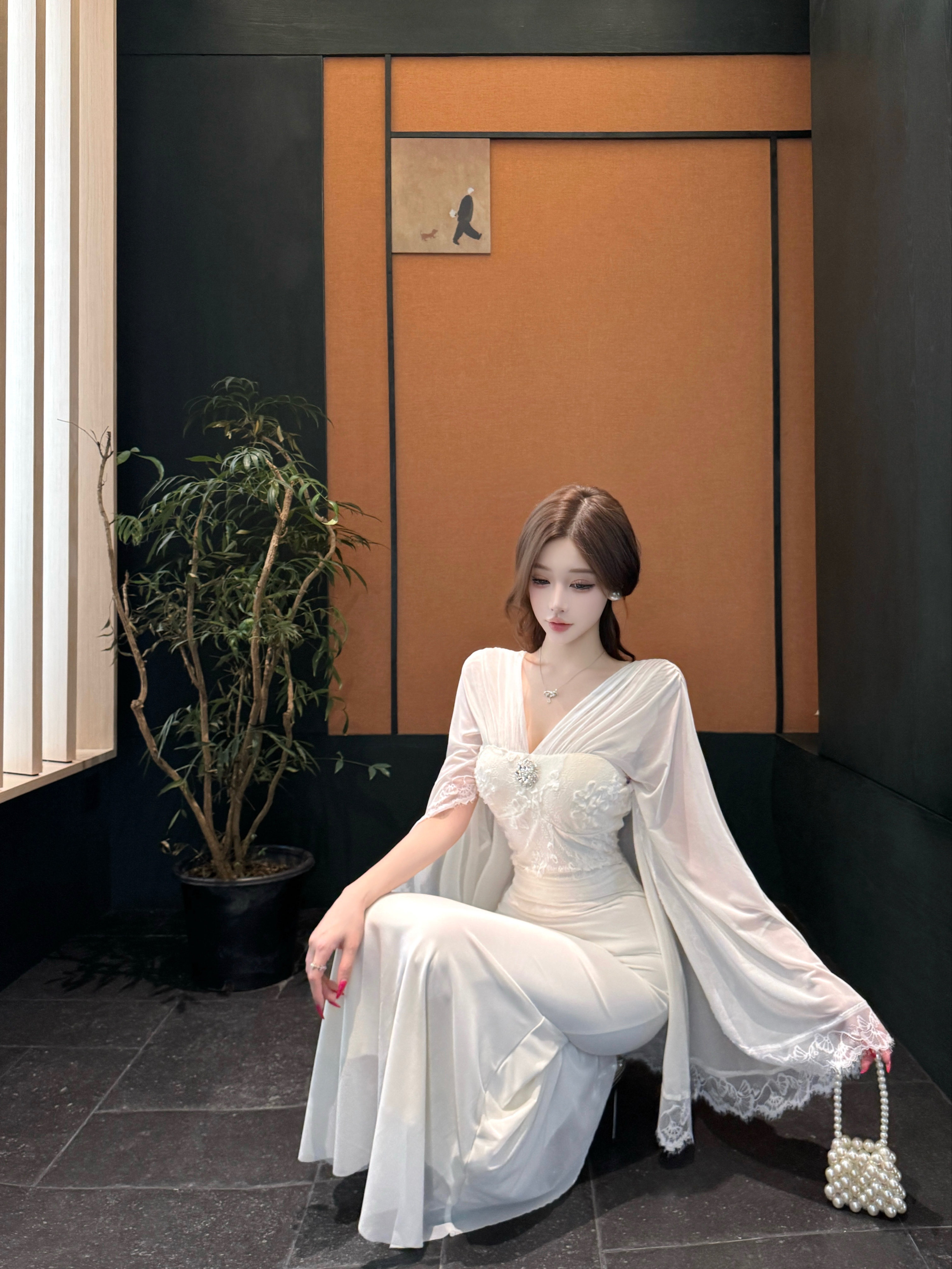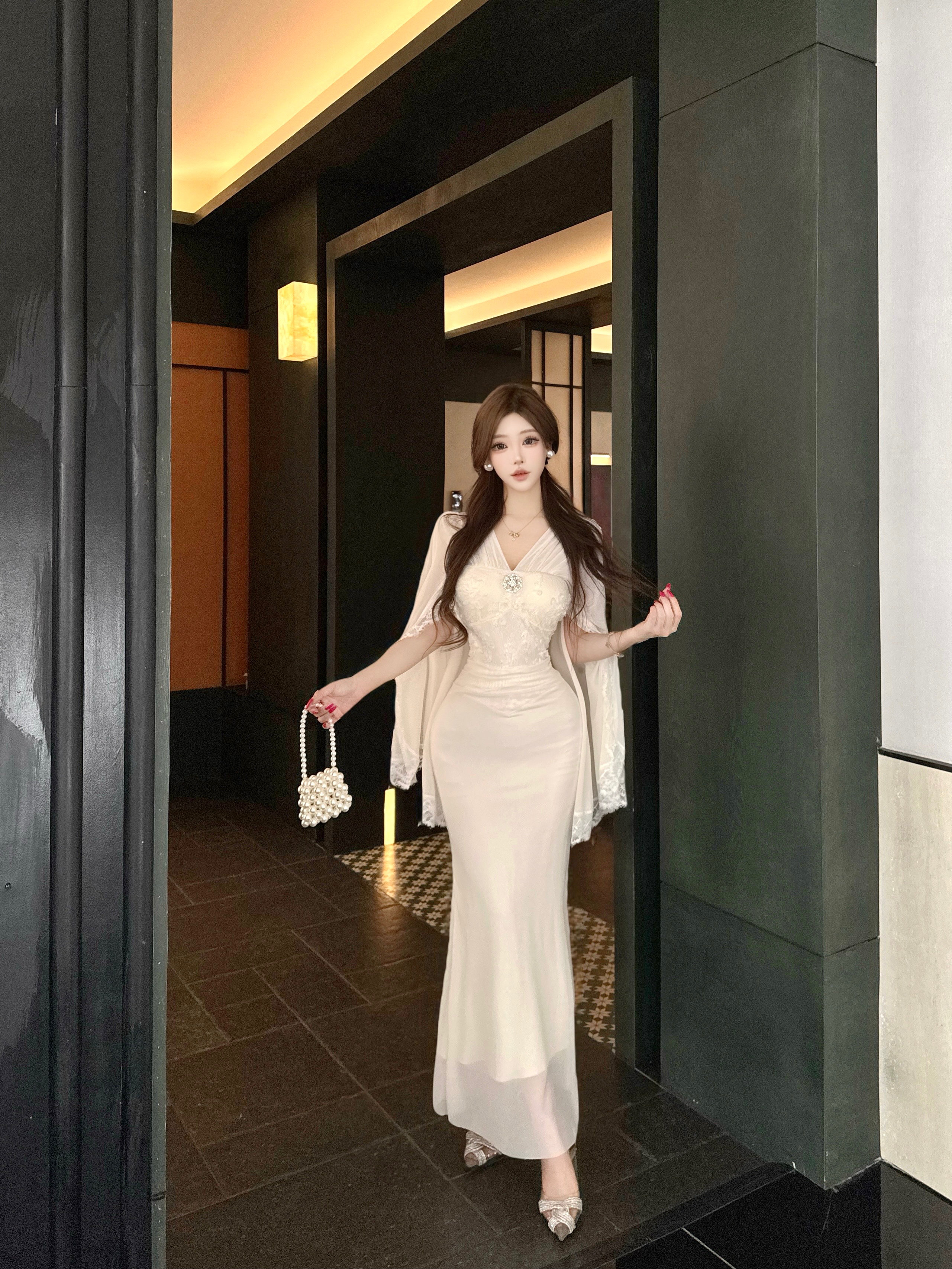 MY15970# 江南美人绝美高级感温柔纯欲性感飘带连肩袖设计感礼服显瘦裙女裝貨源服裝批發