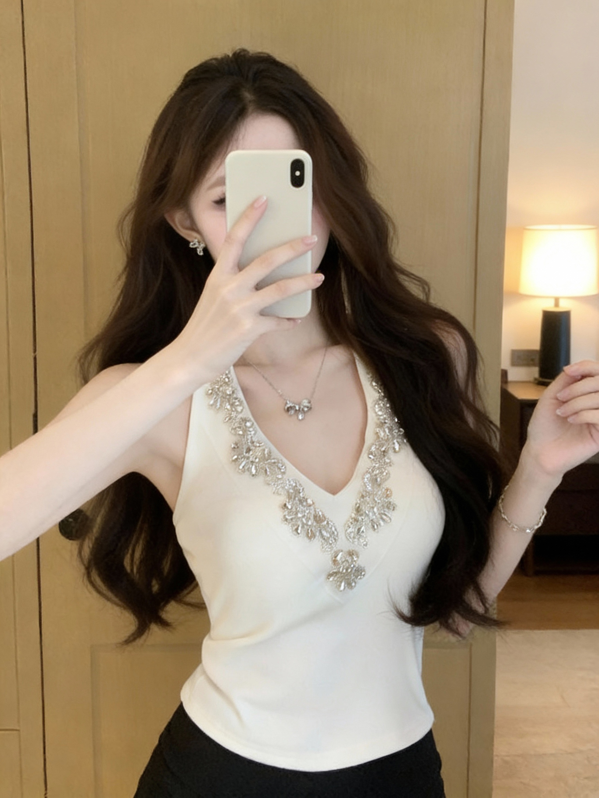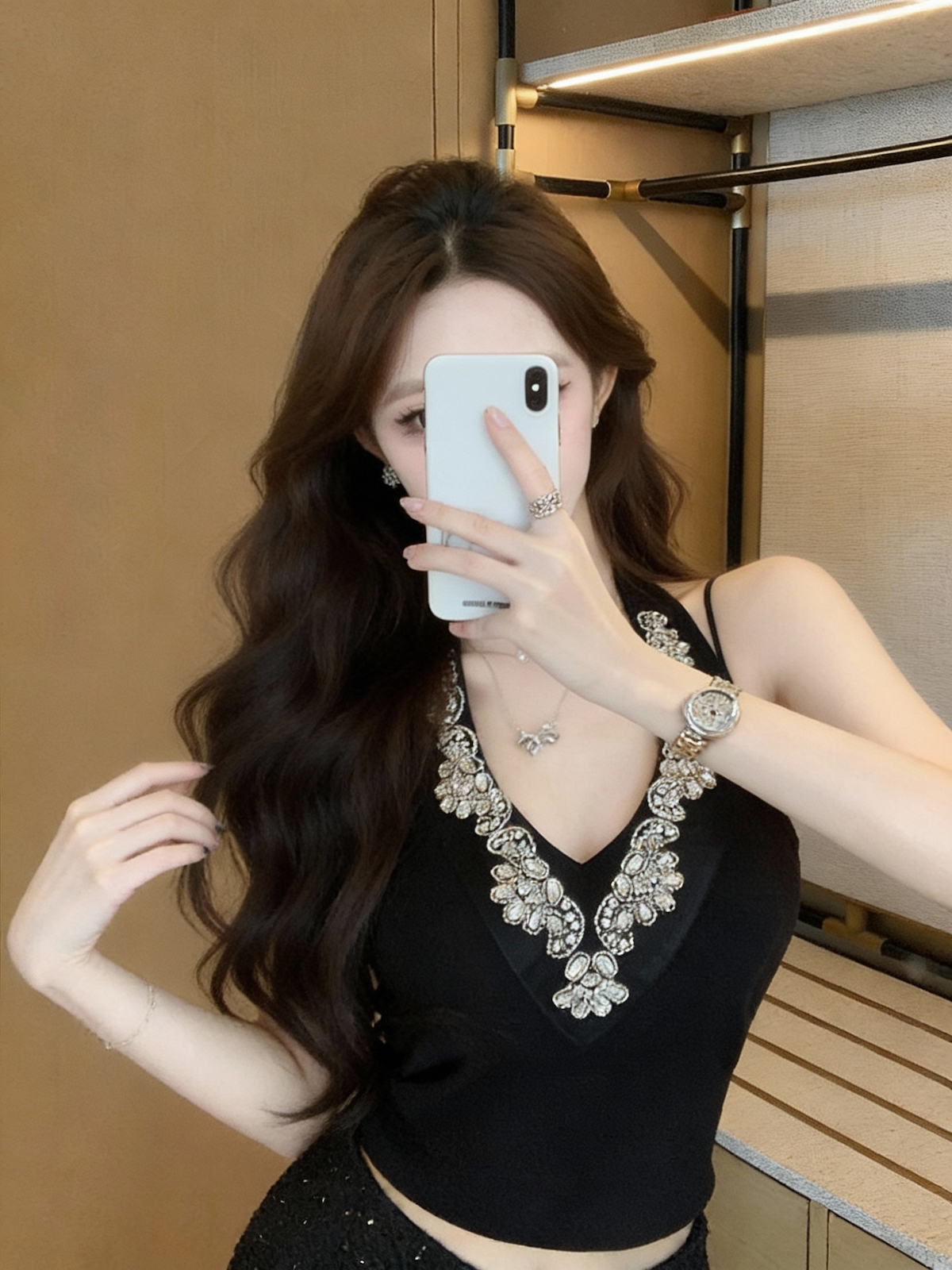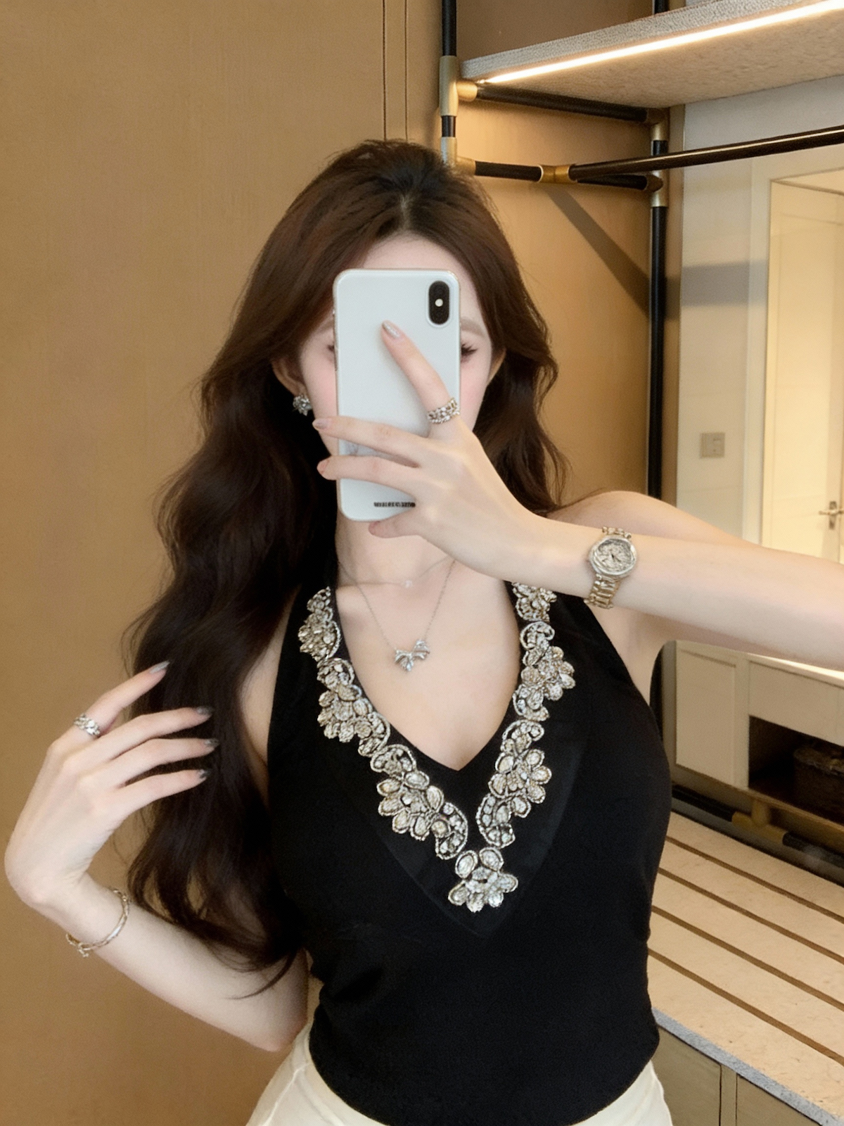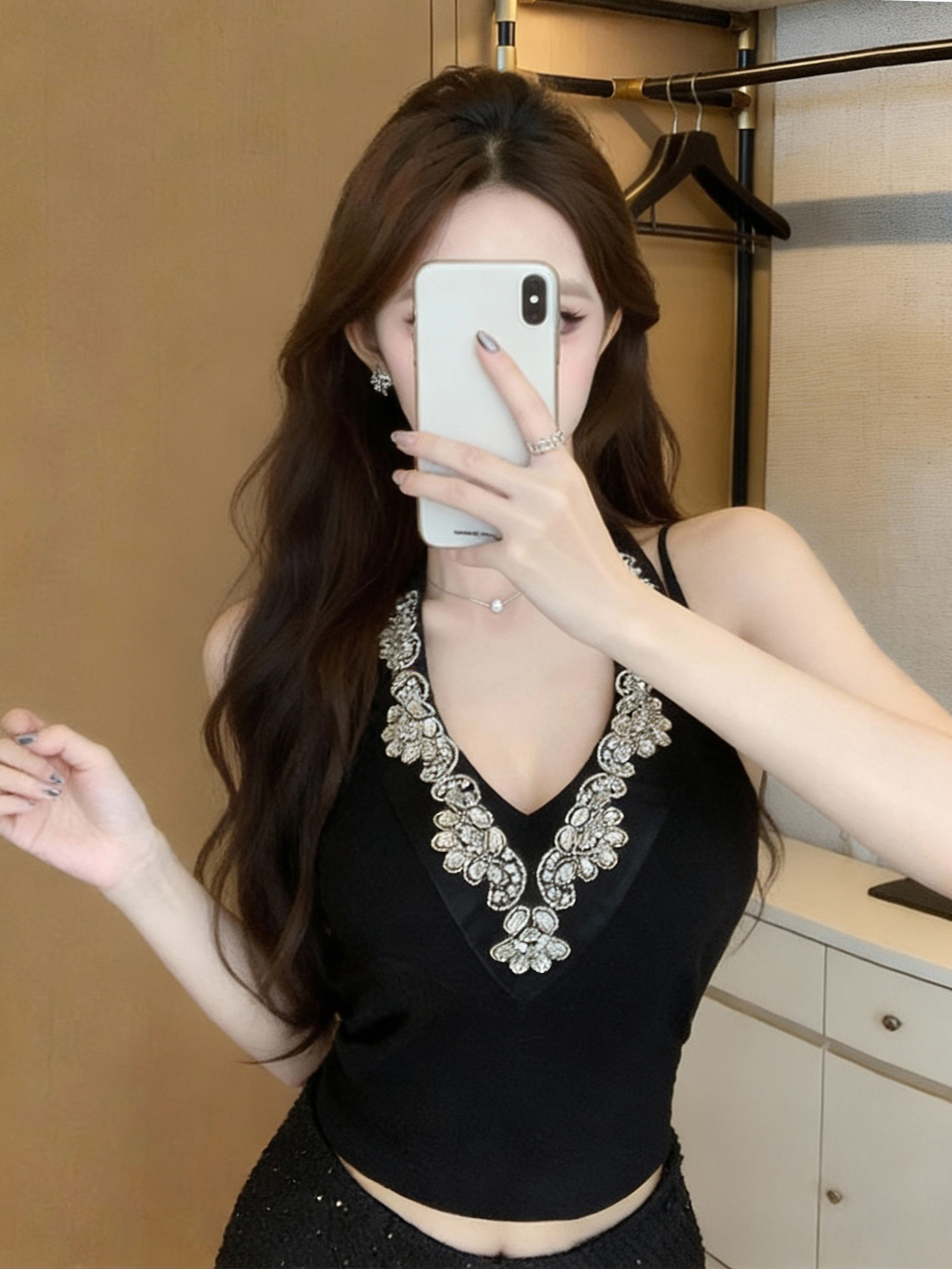 MY15971# 性感重工水钻蕾丝拼接背心吊带女V领修身显瘦无袖上衣女裝貨源服裝批發