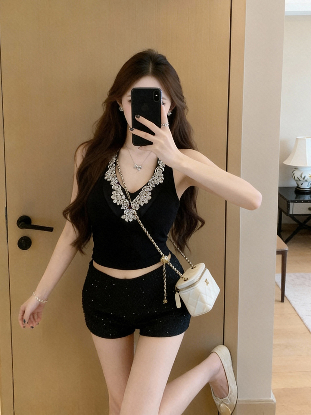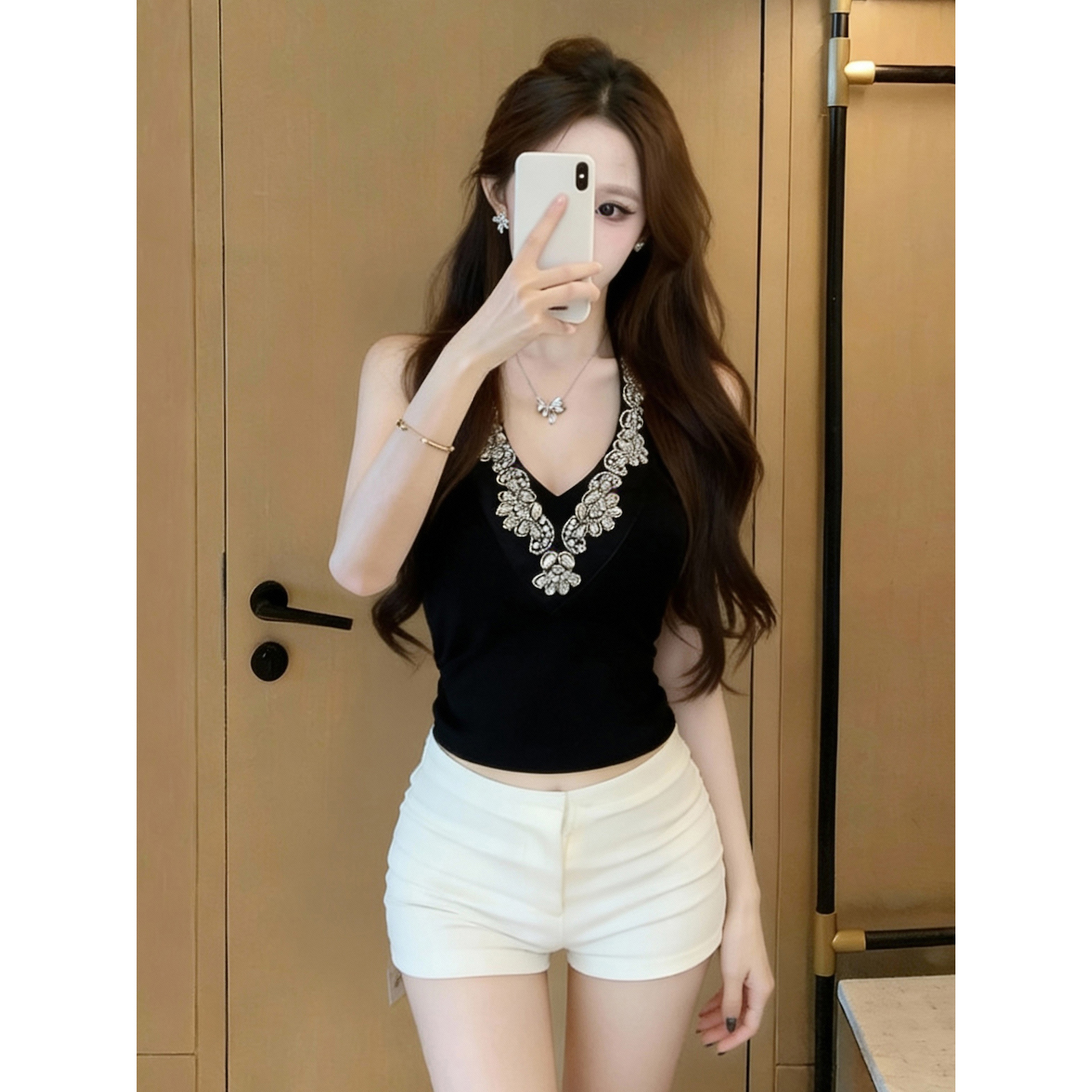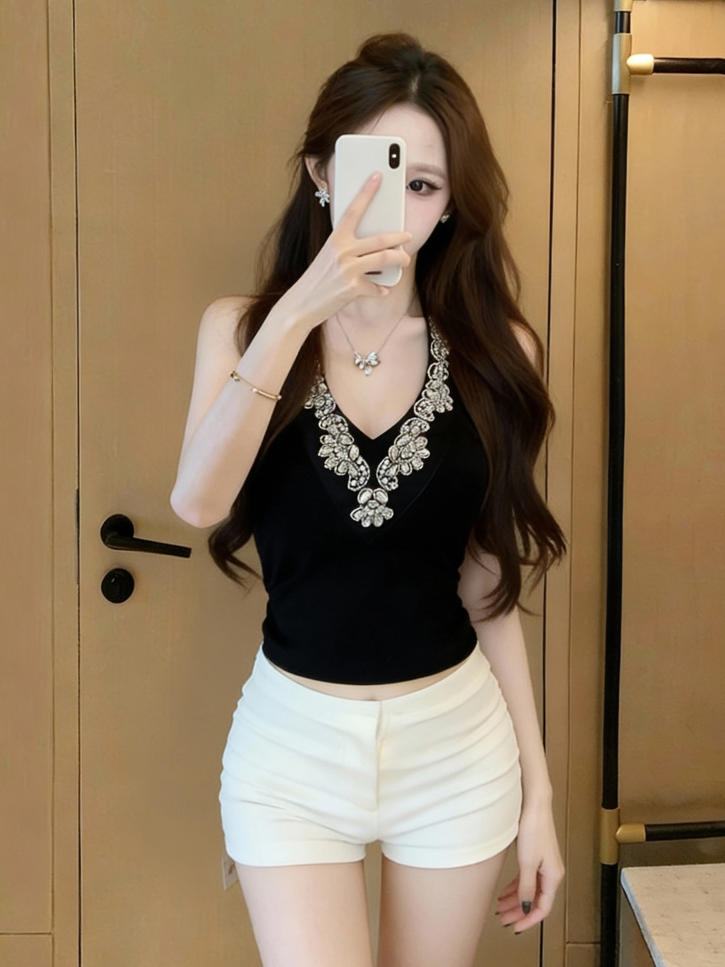 MY15971# 性感重工水钻蕾丝拼接背心吊带女V领修身显瘦无袖上衣女裝貨源服裝批發