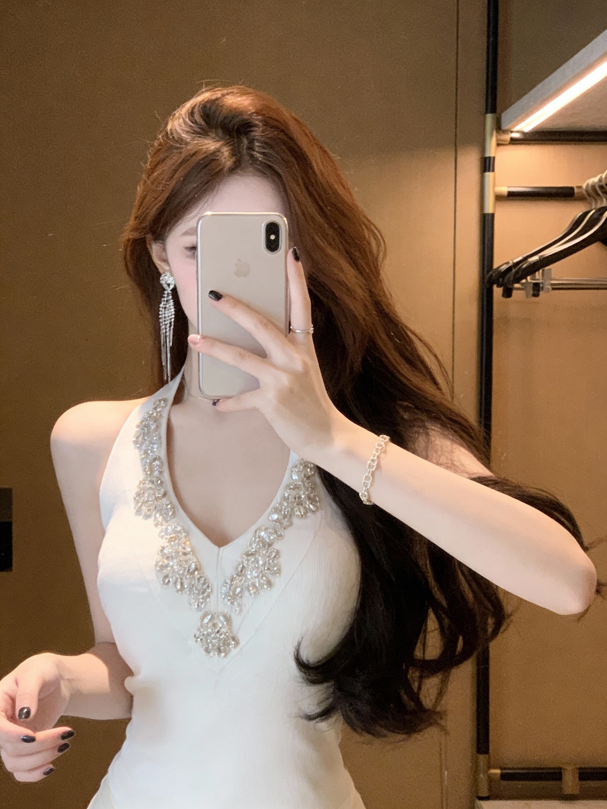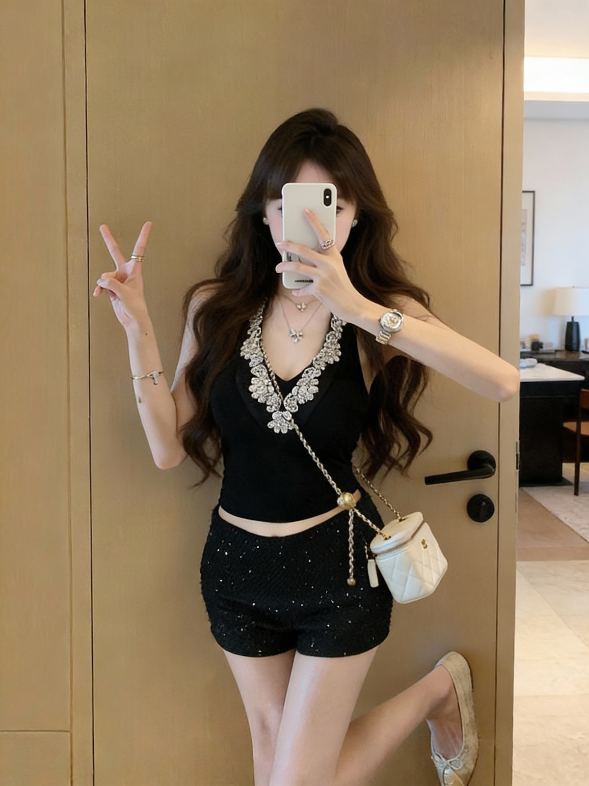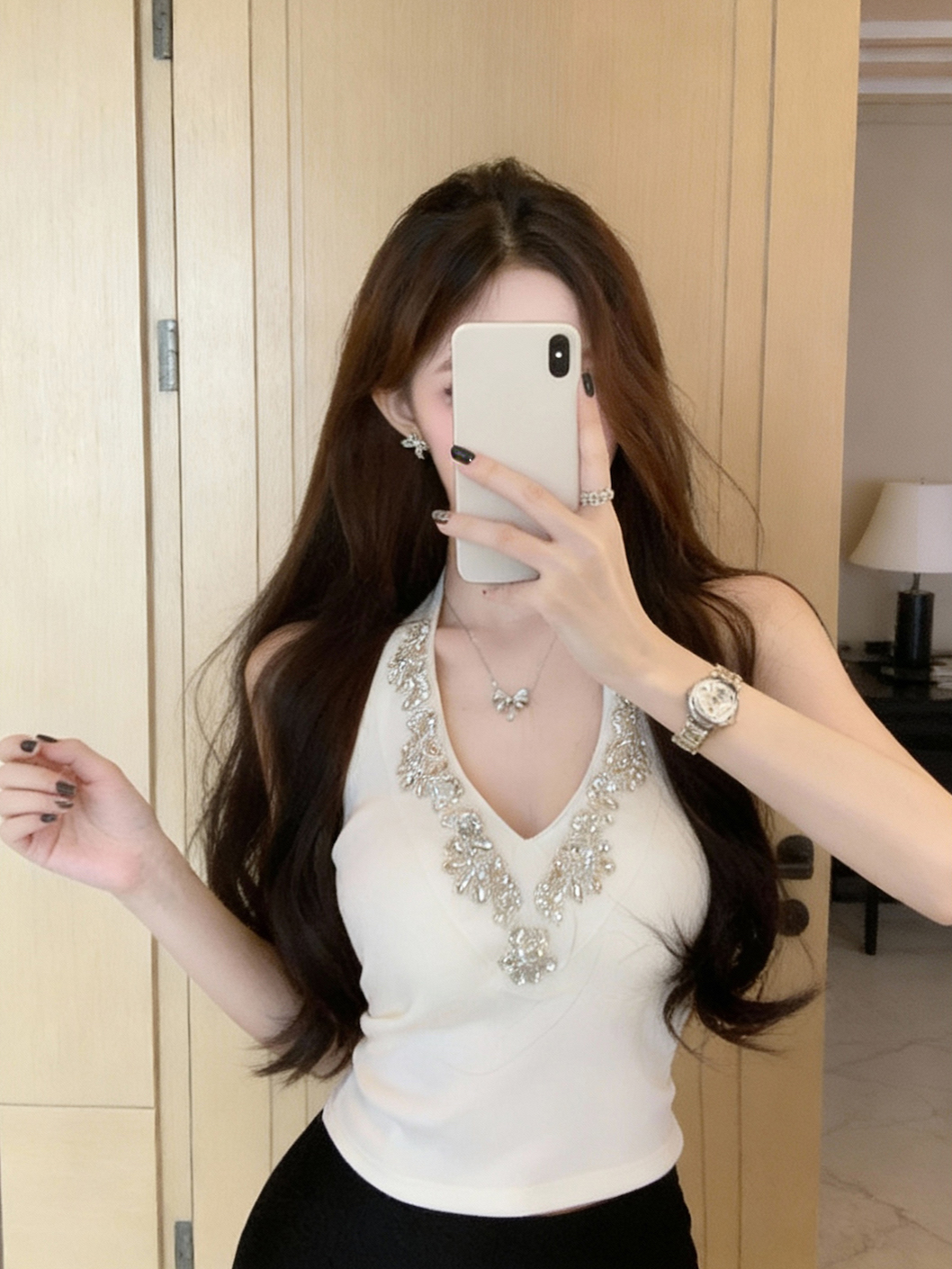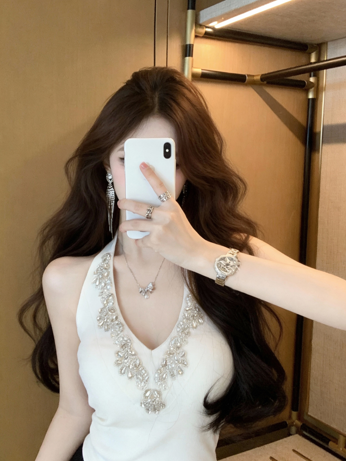MY15971# 性感重工水钻蕾丝拼接背心吊带女V领修身显瘦无袖上衣女裝貨源服裝批發