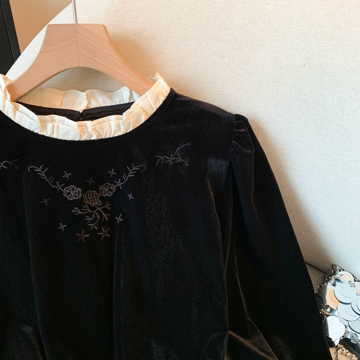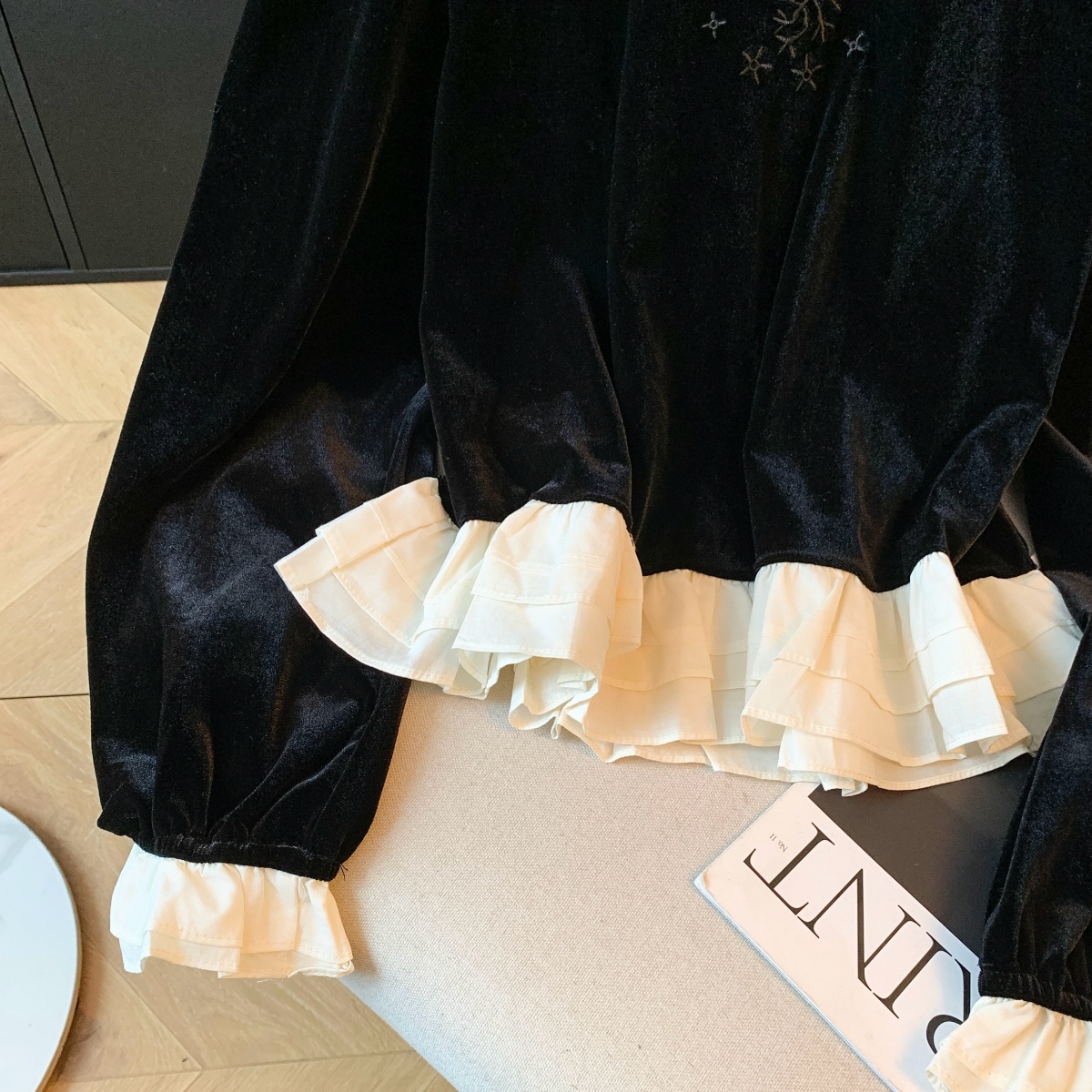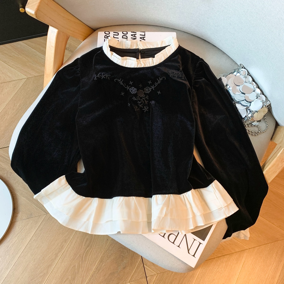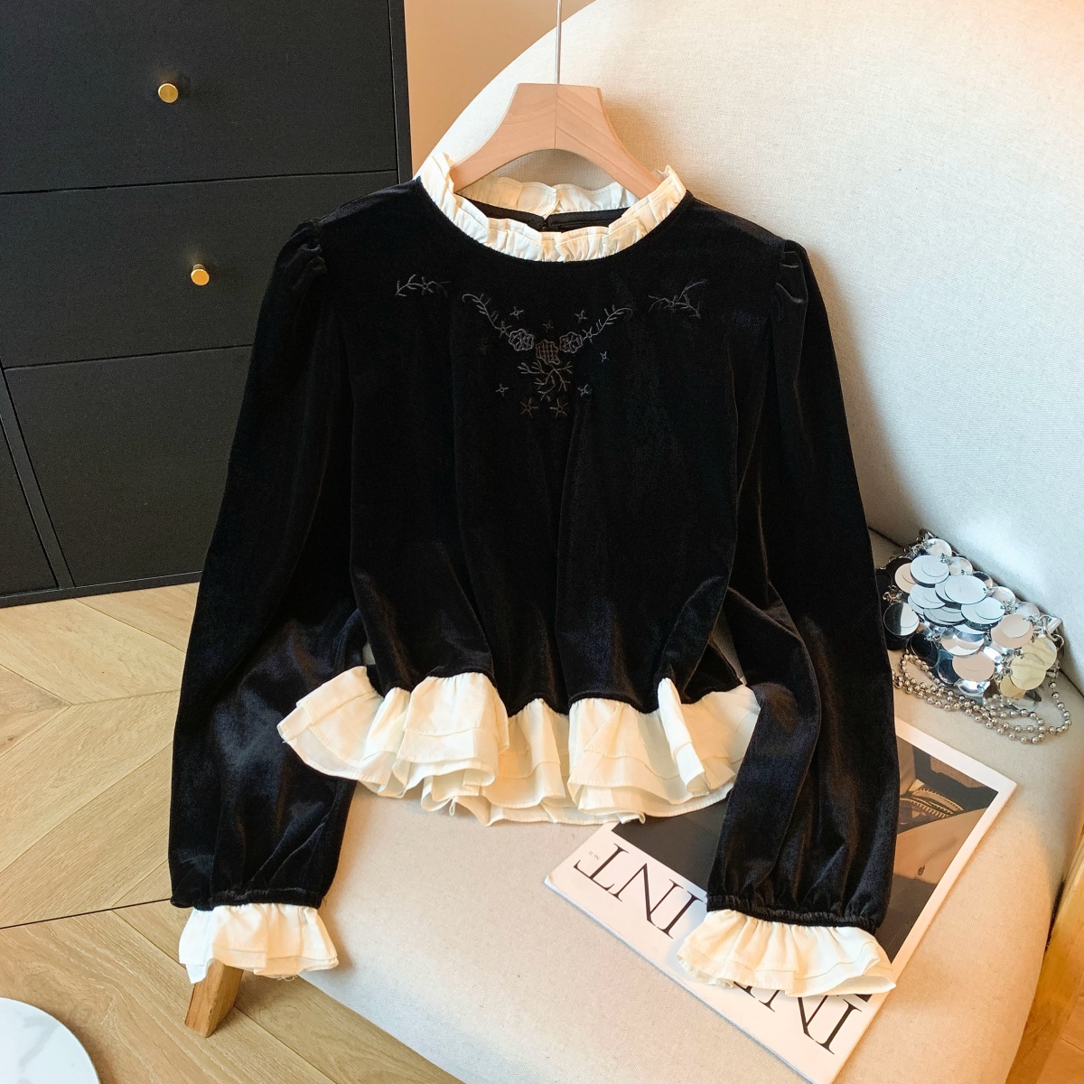 MY15984# 刺绣丝绒长袖衬衫新款木耳边圆领拼接打底衫上衣潮女裝貨源服裝批發