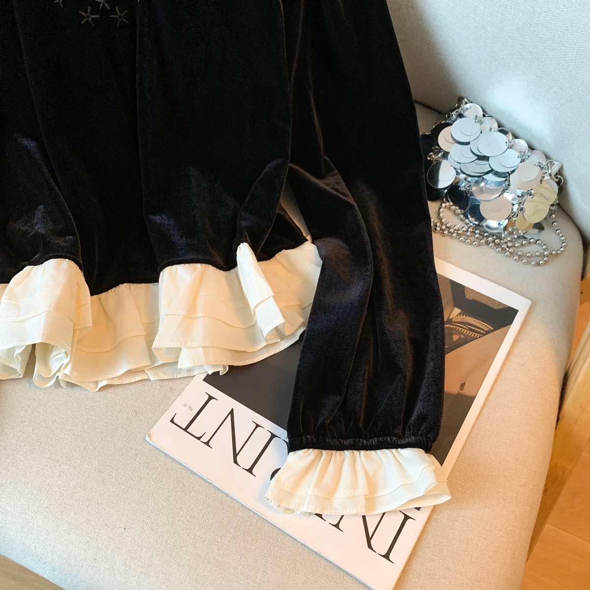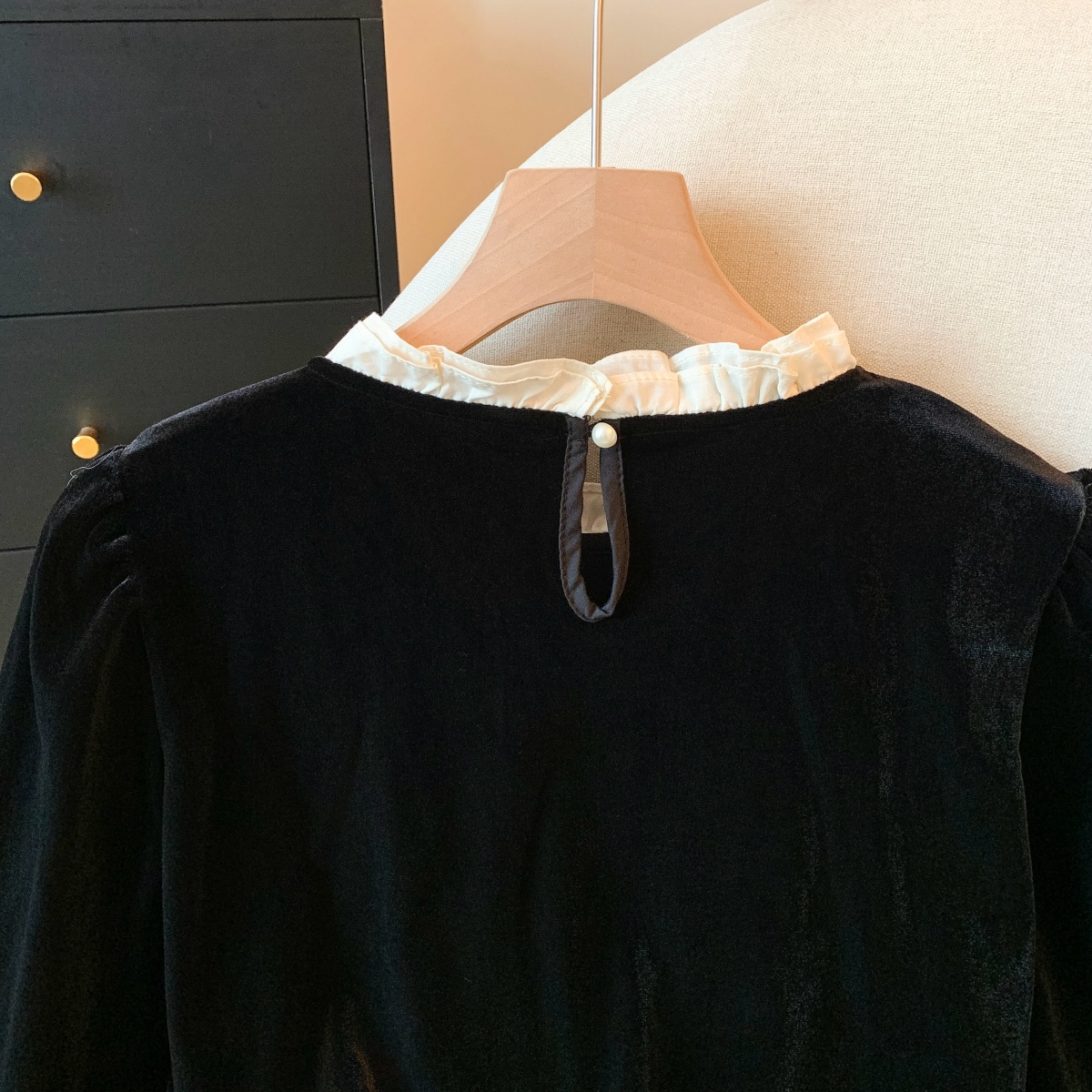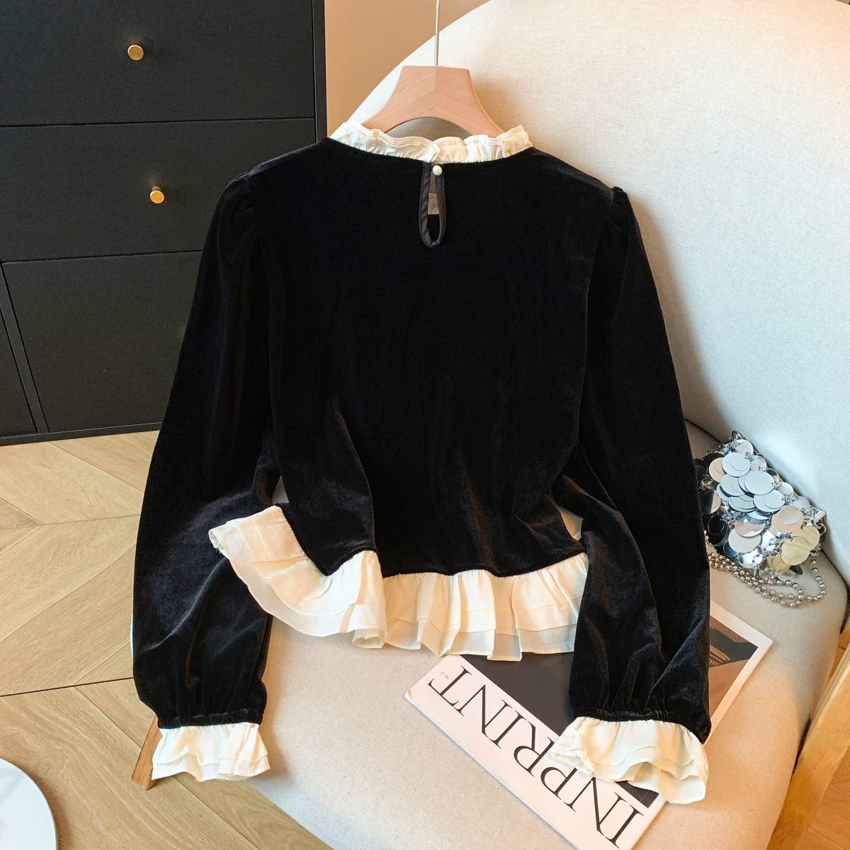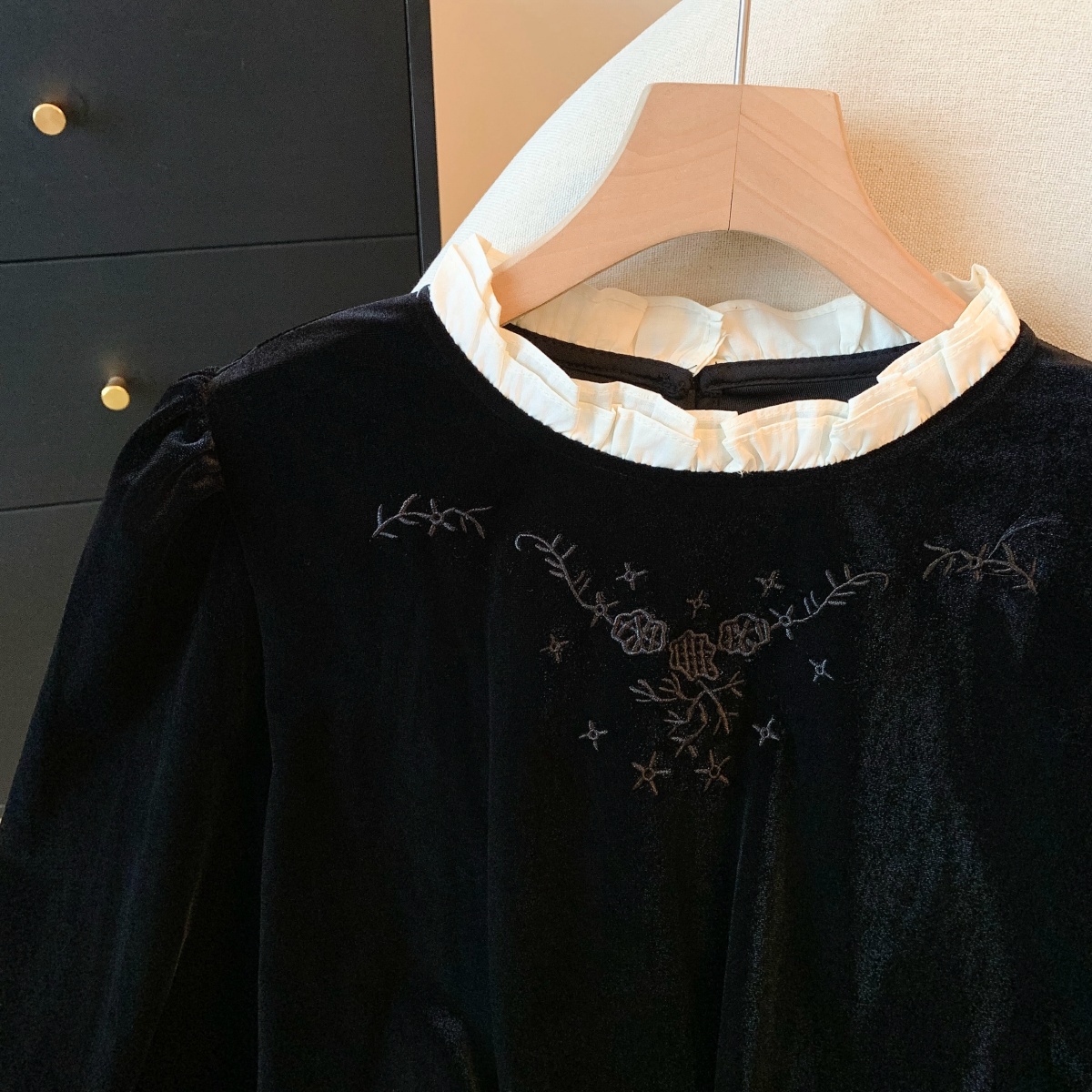 MY15984# 刺绣丝绒长袖衬衫新款木耳边圆领拼接打底衫上衣潮女裝貨源服裝批發