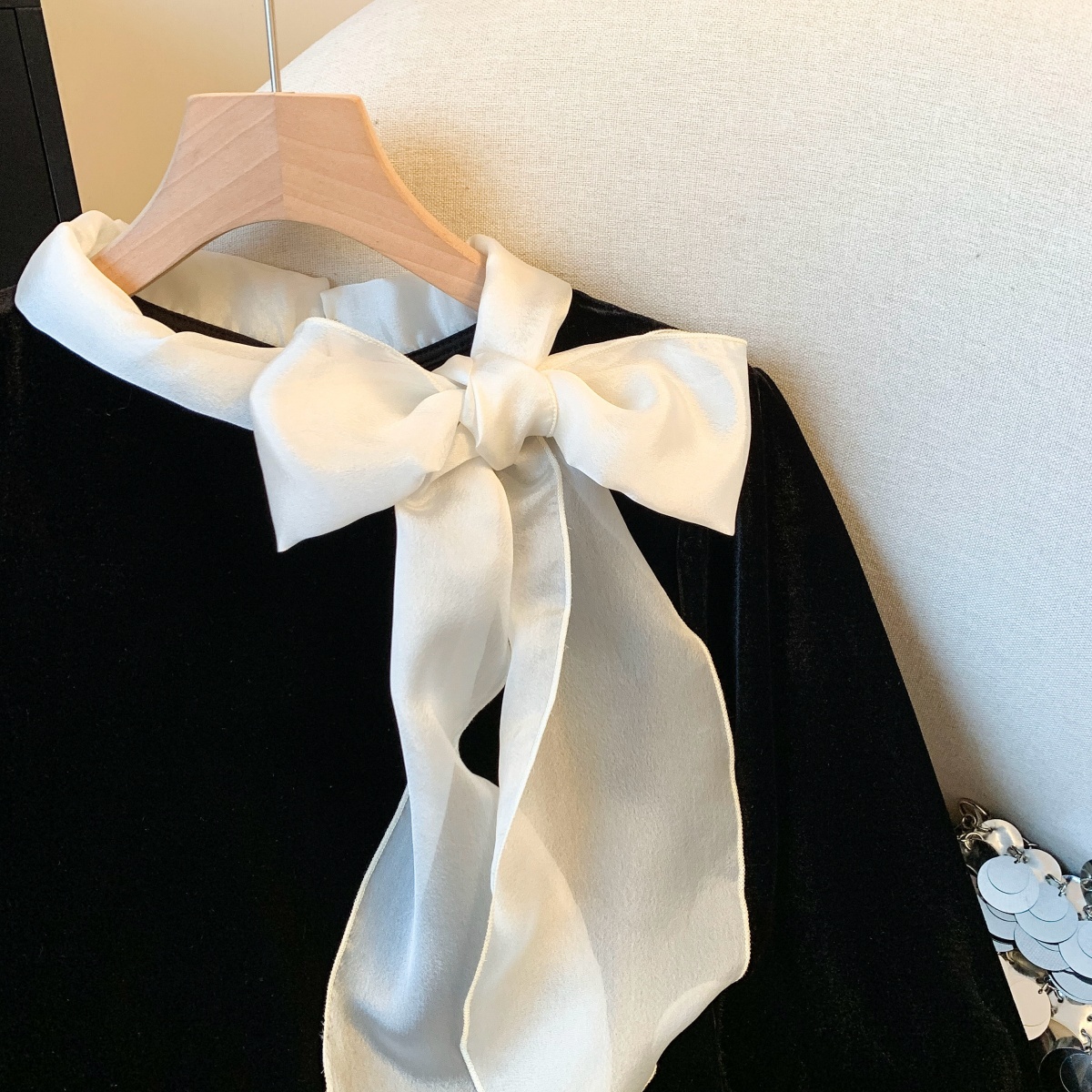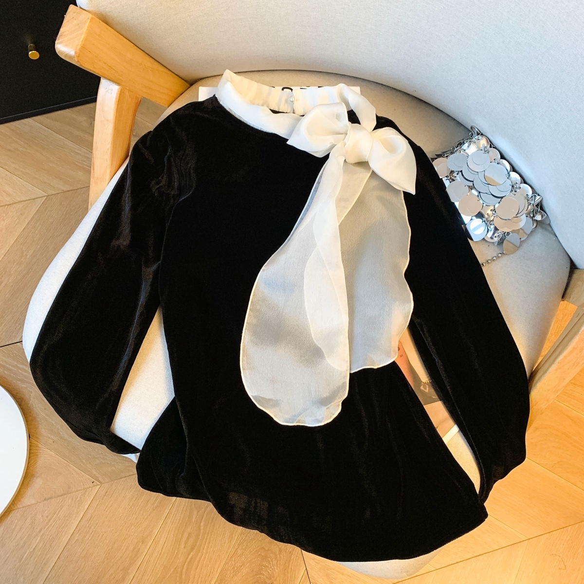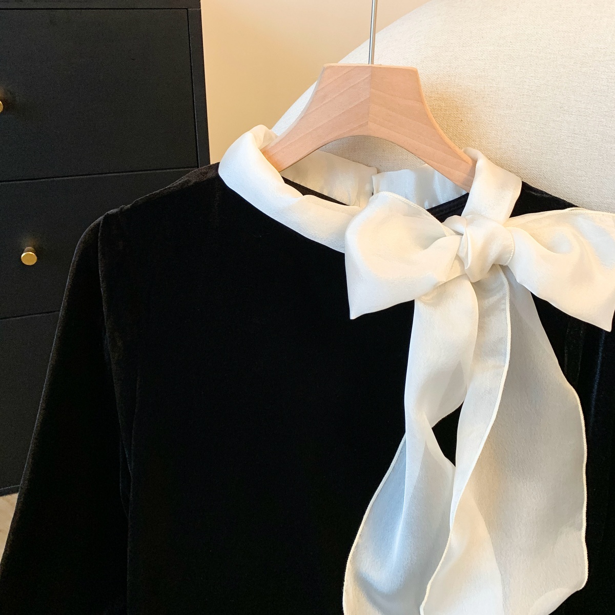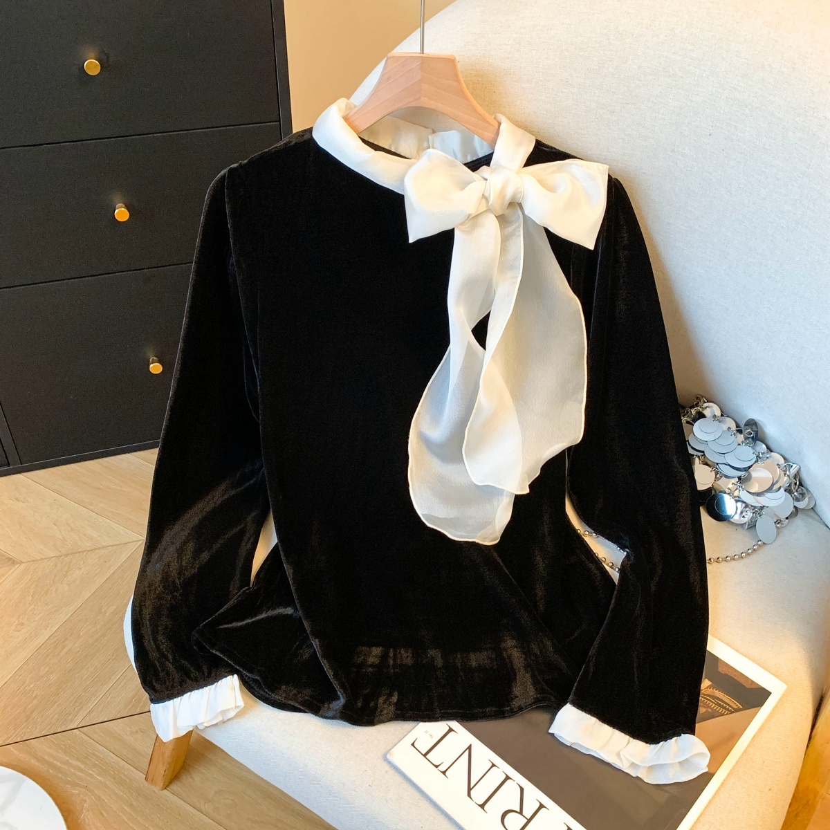 MY15987# 赫本风金丝绒蝴蝶结飘带衬衫女士内搭打底叠穿上衣女裝貨源服裝批發