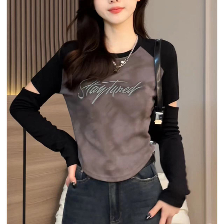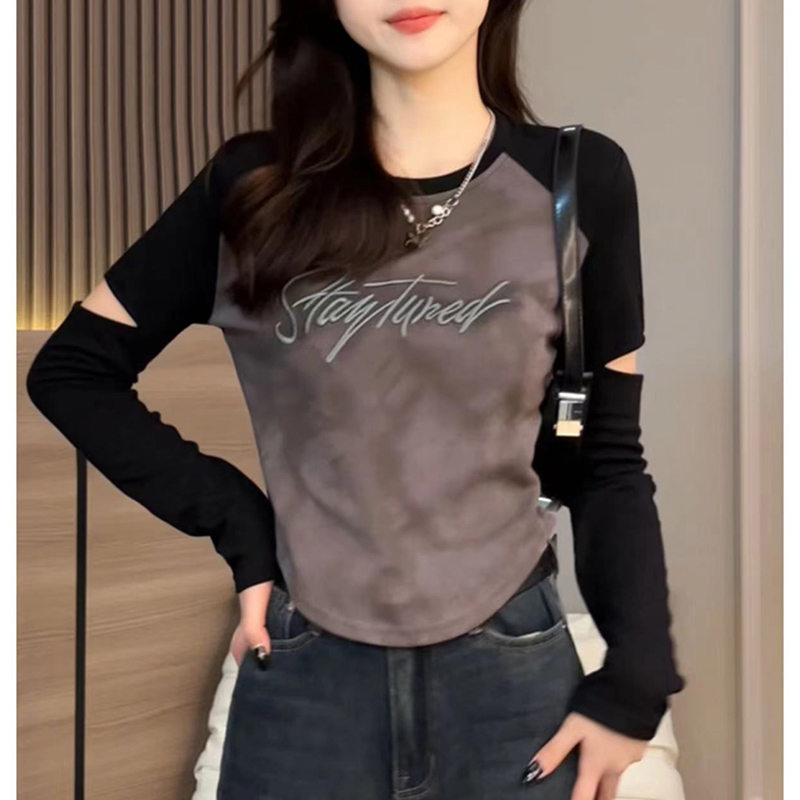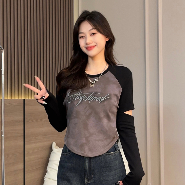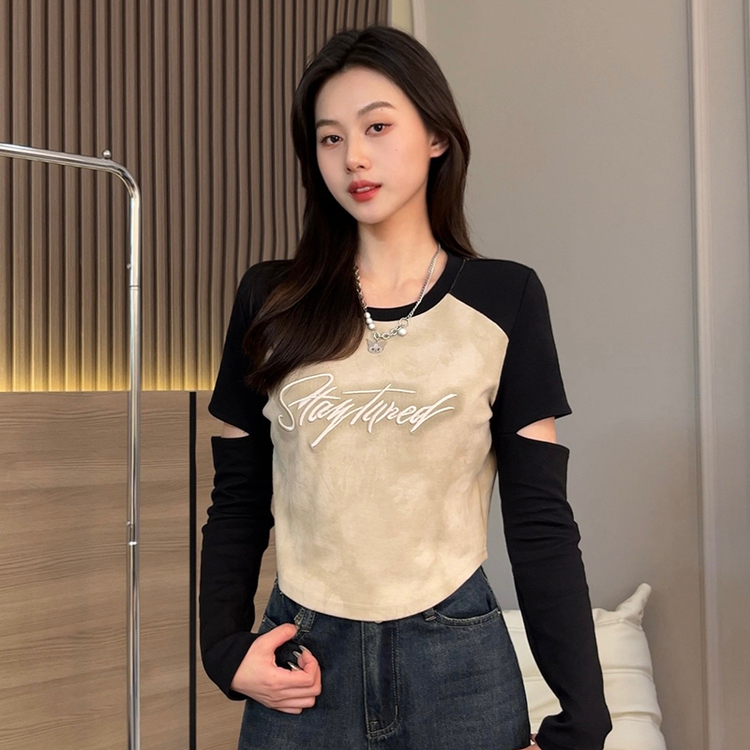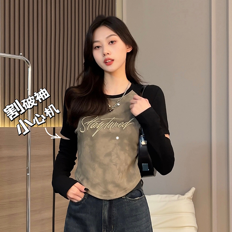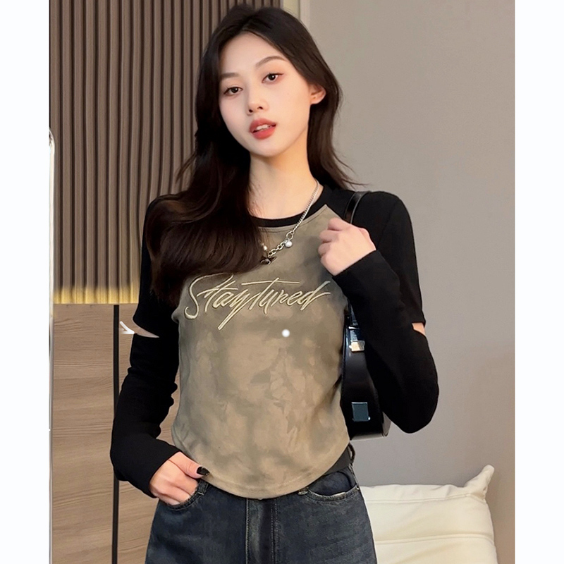 MY15989# 设计感别致镂空上衣女减龄显瘦字母绣花长袖t恤打底衫女裝貨源服裝批發