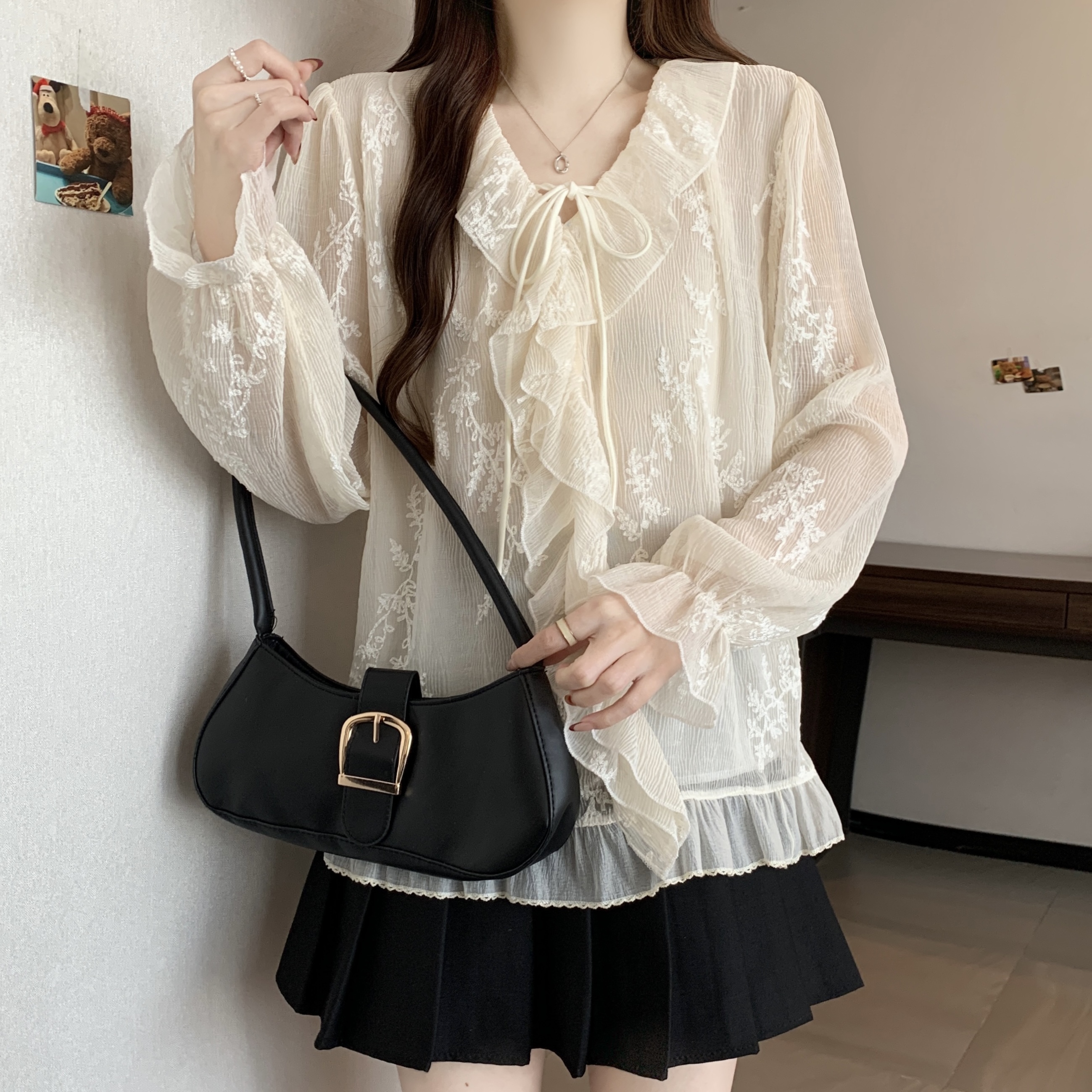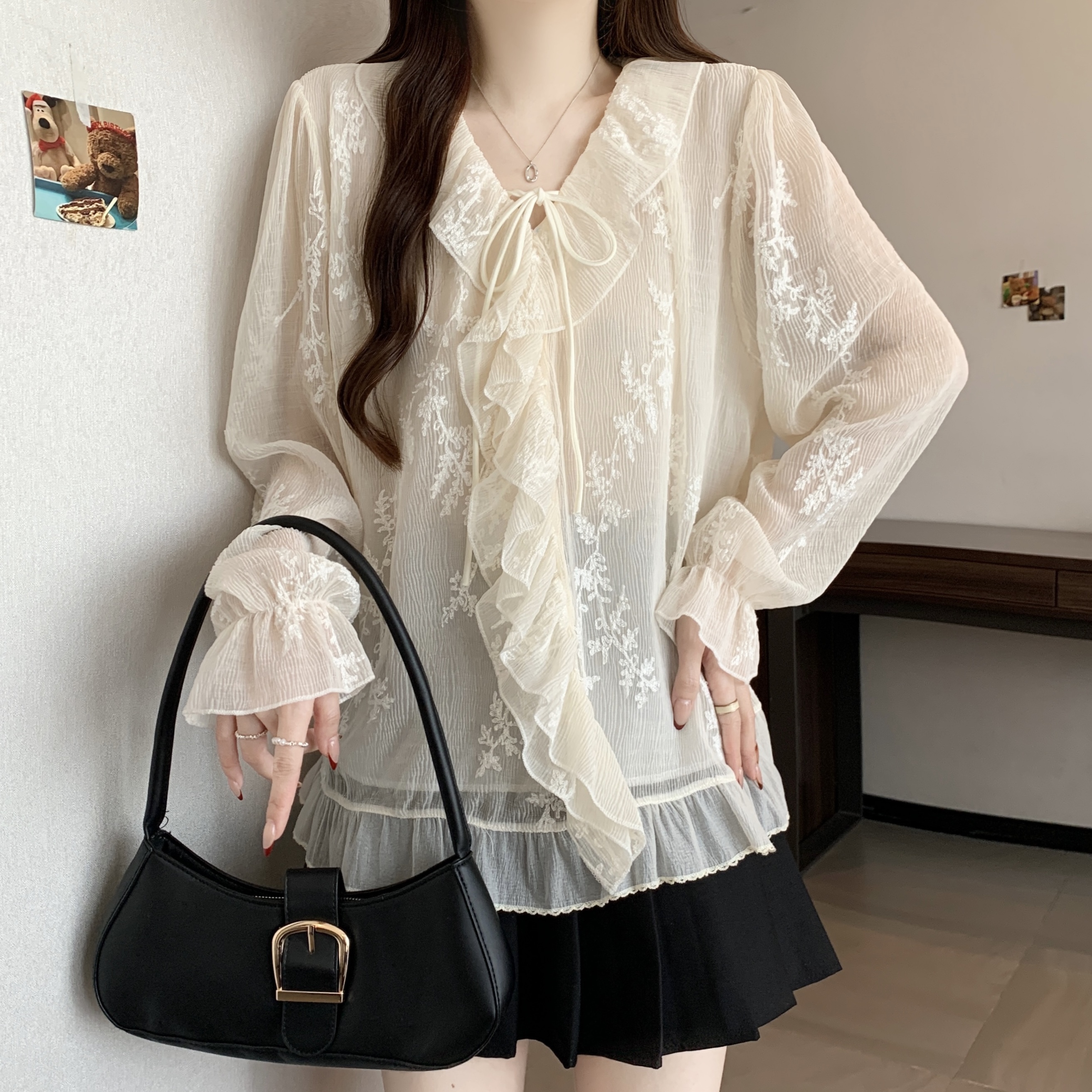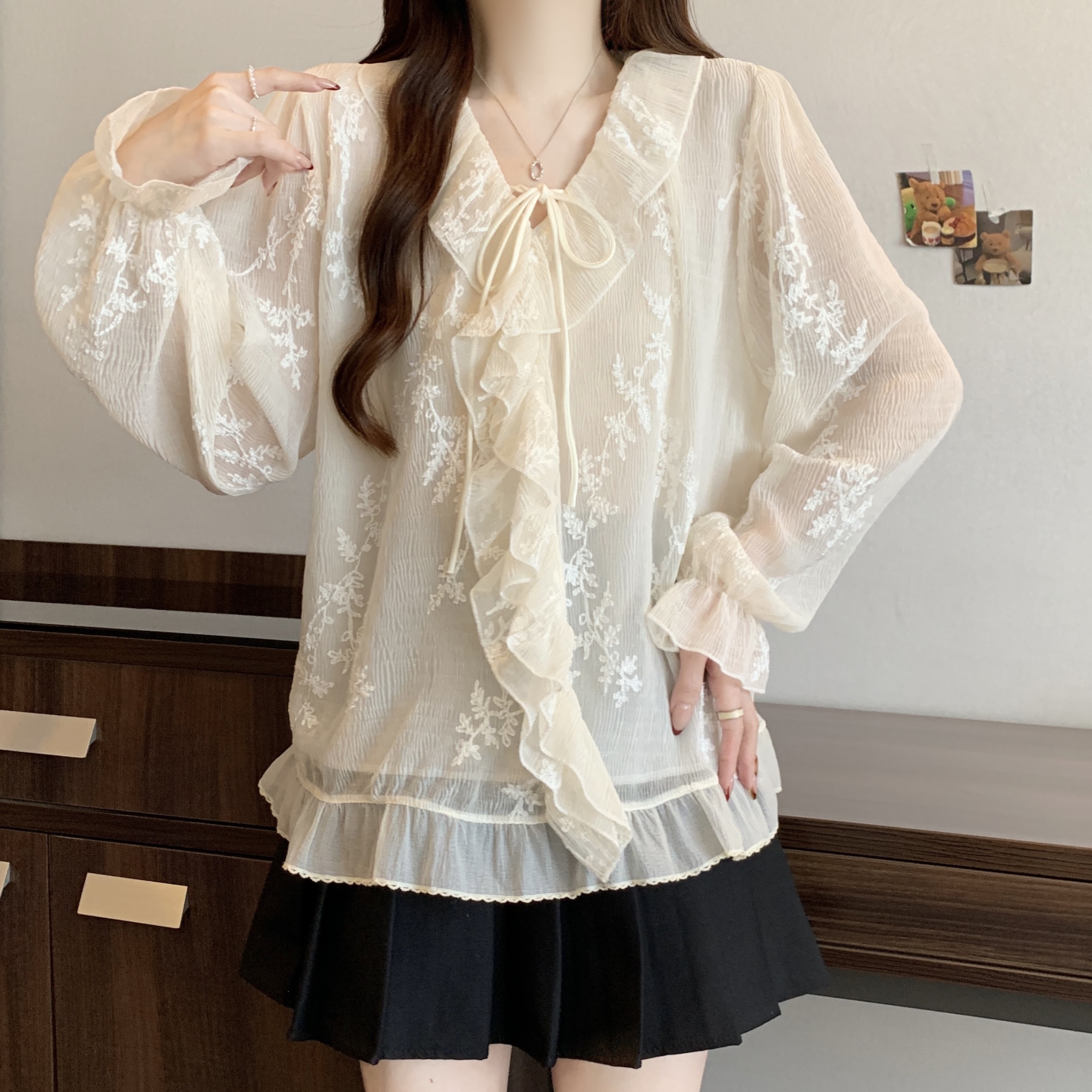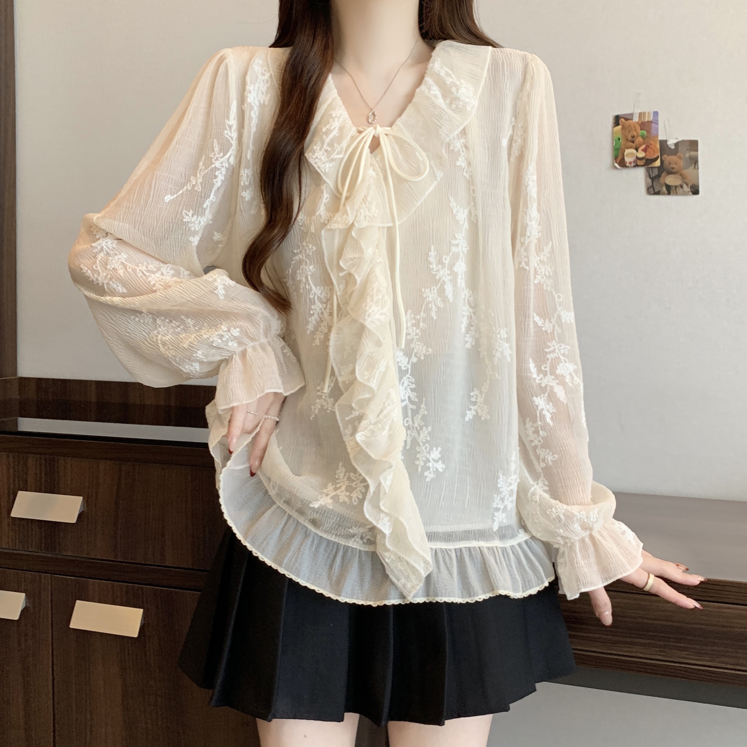 MY16001# 大码法式荷叶边喇叭长袖衬衫v领小衫新款别致上衣女裝貨源服裝批發