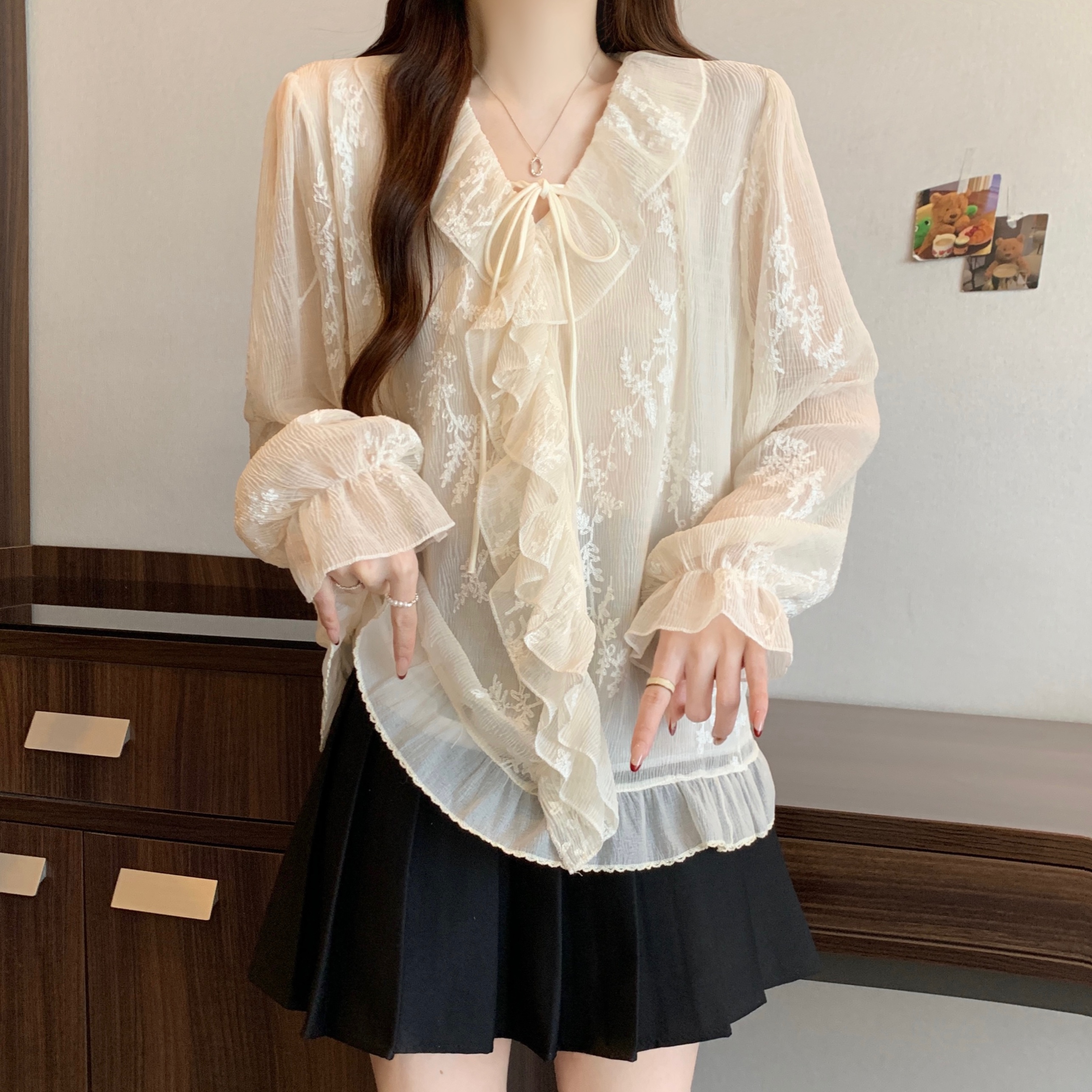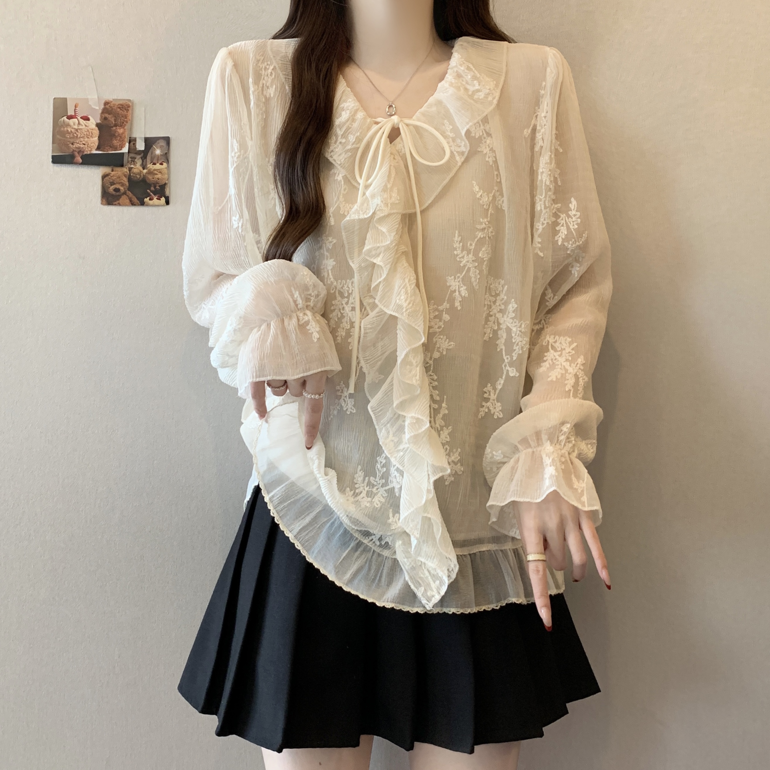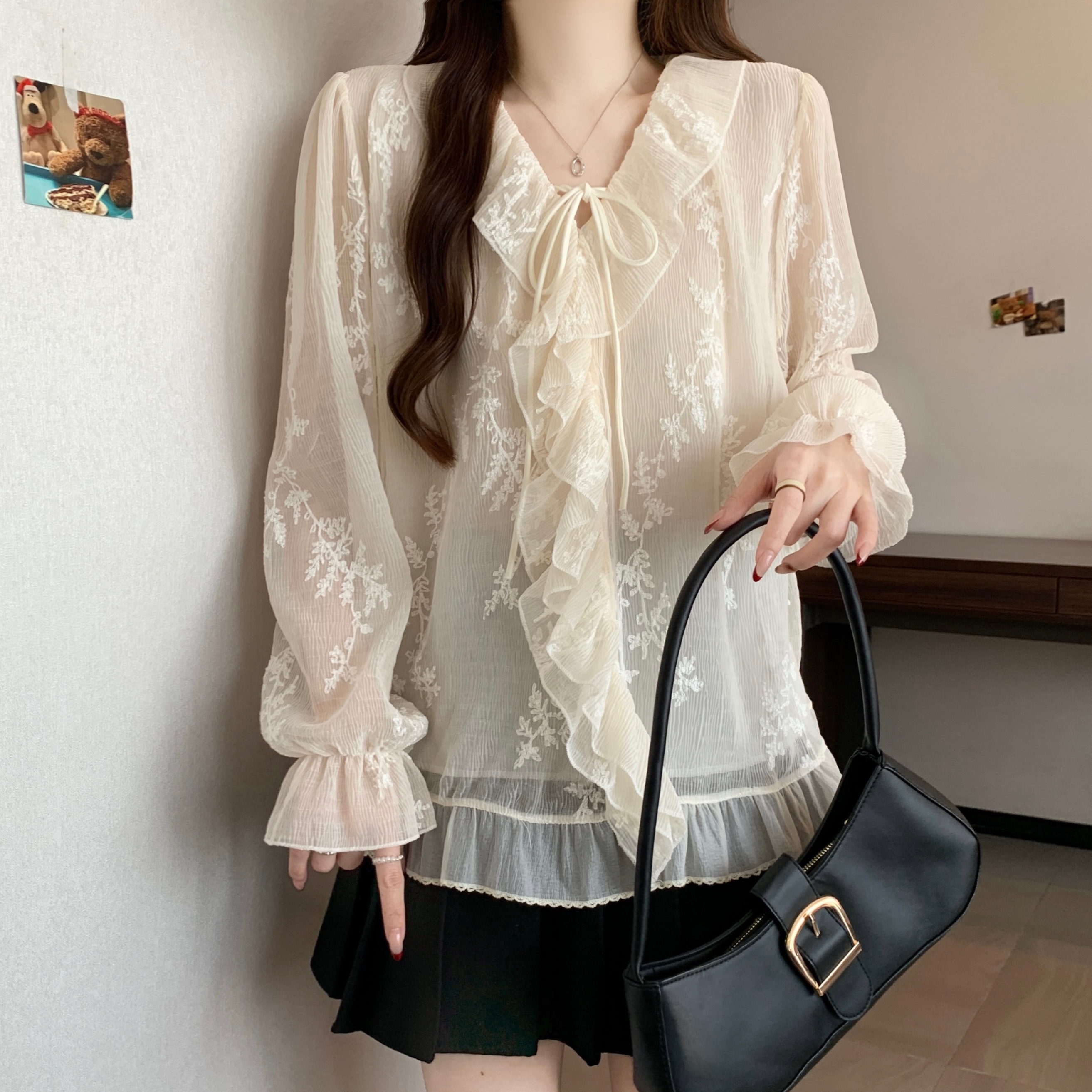 MY16001# 大码法式荷叶边喇叭长袖衬衫v领小衫新款别致上衣女裝貨源服裝批發