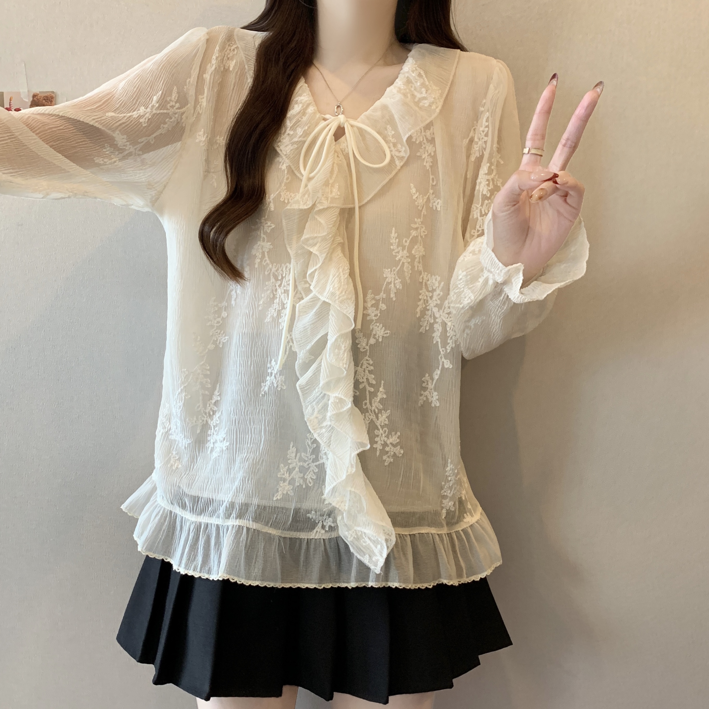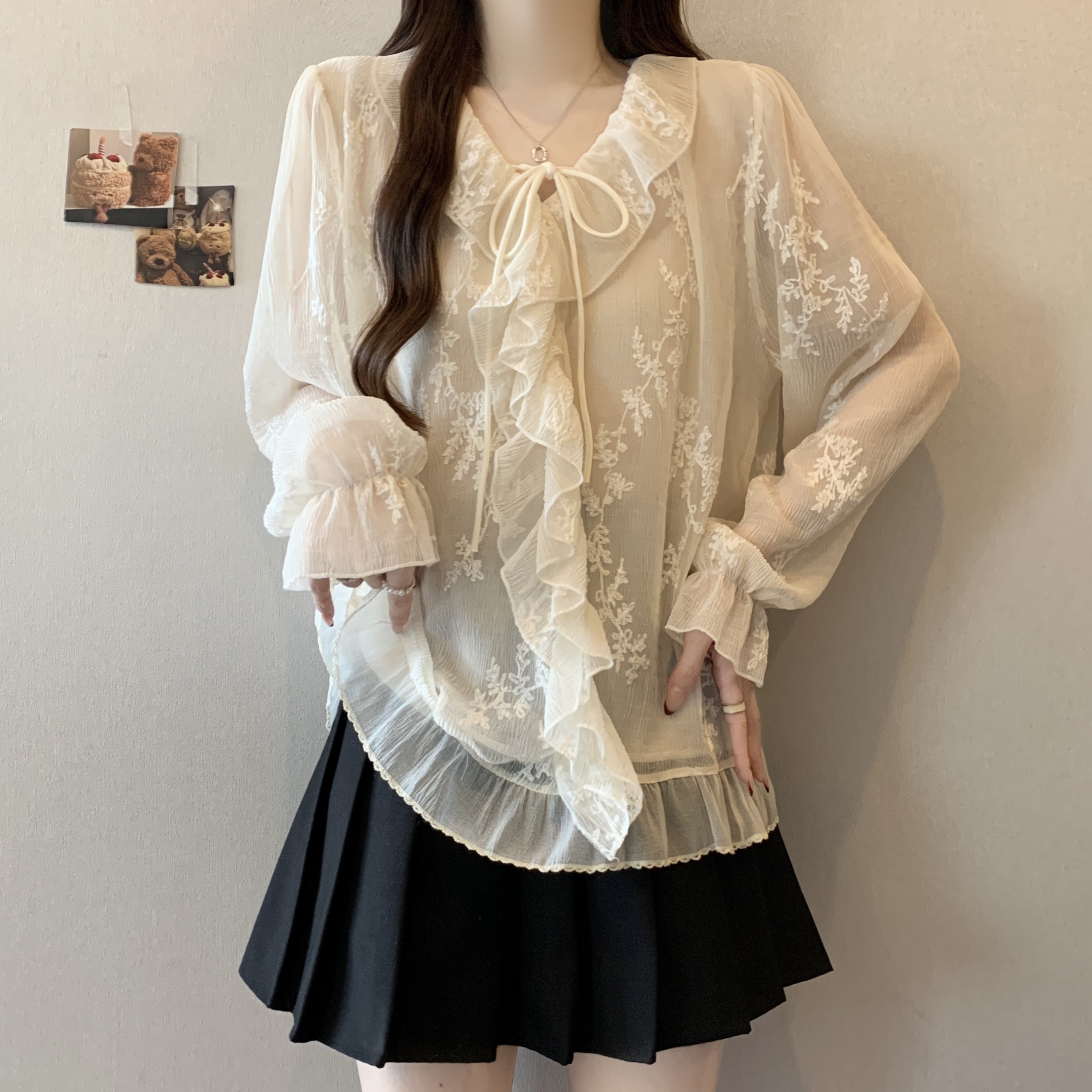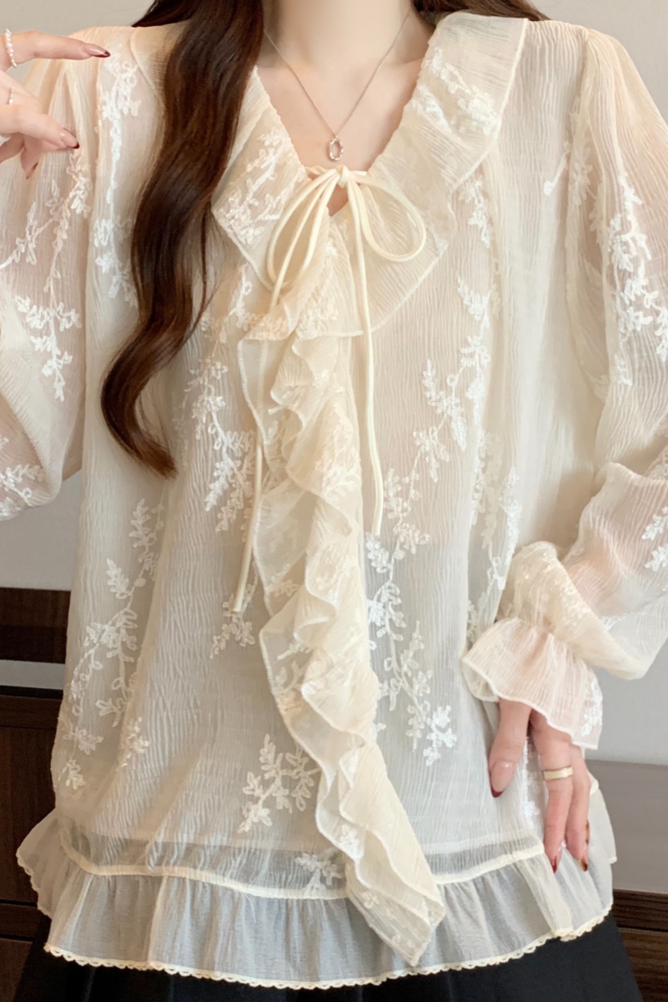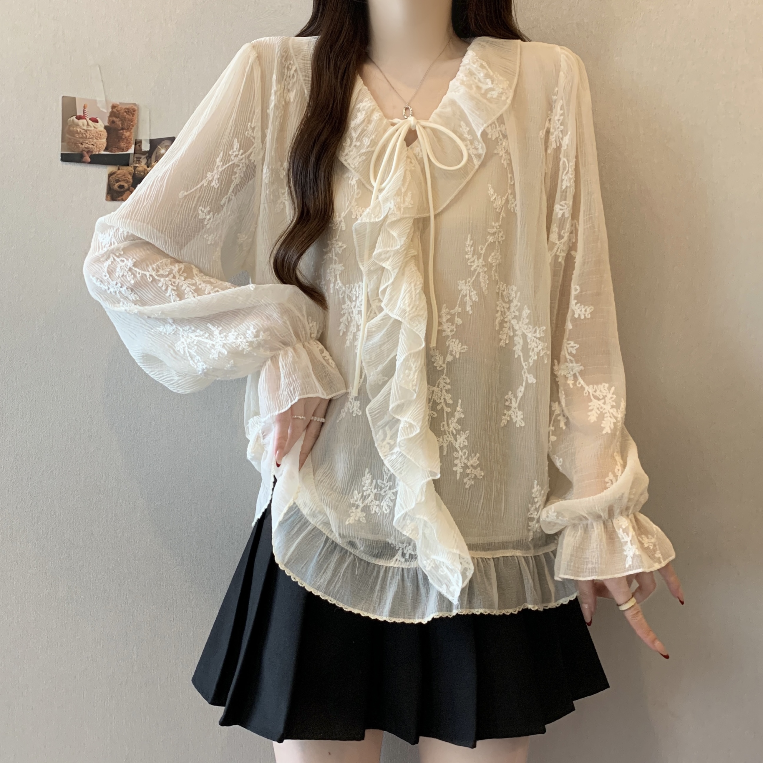 MY16001# 大码法式荷叶边喇叭长袖衬衫v领小衫新款别致上衣女裝貨源服裝批發