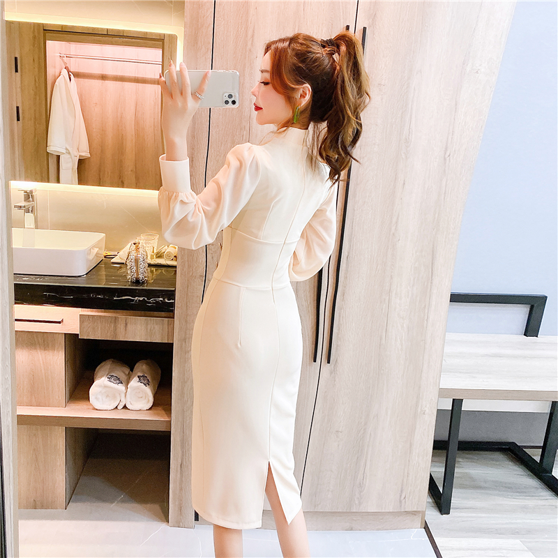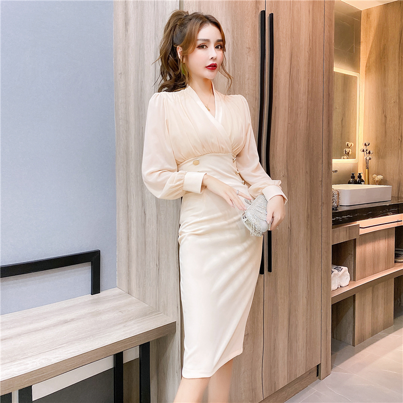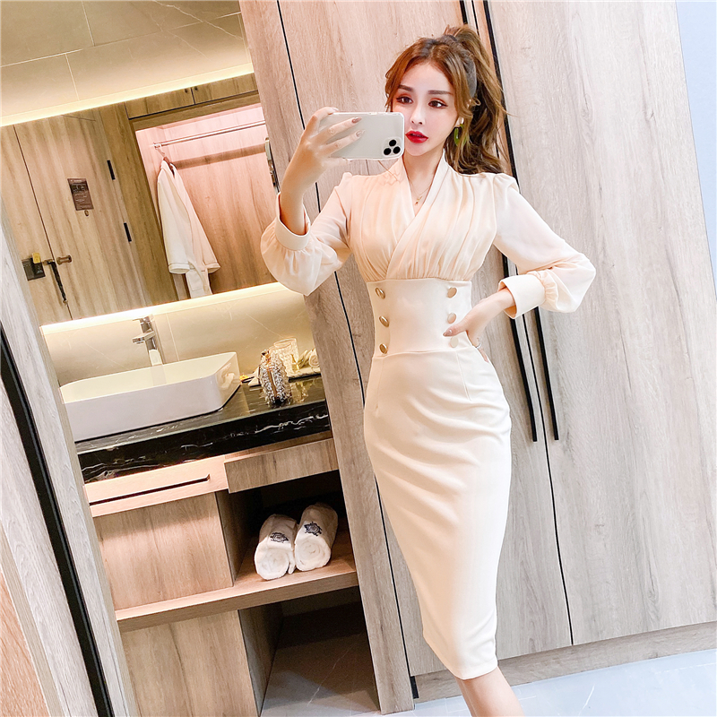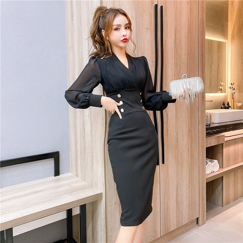 MY16010# 时尚气质网红长袖雪纺拼接单排扣包臀连衣裙女裝貨源服裝批發