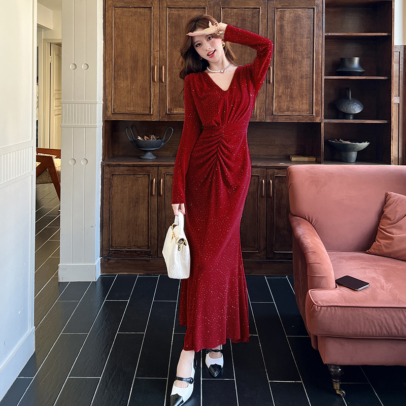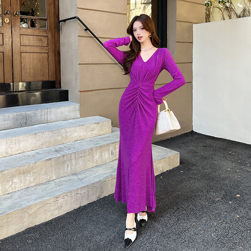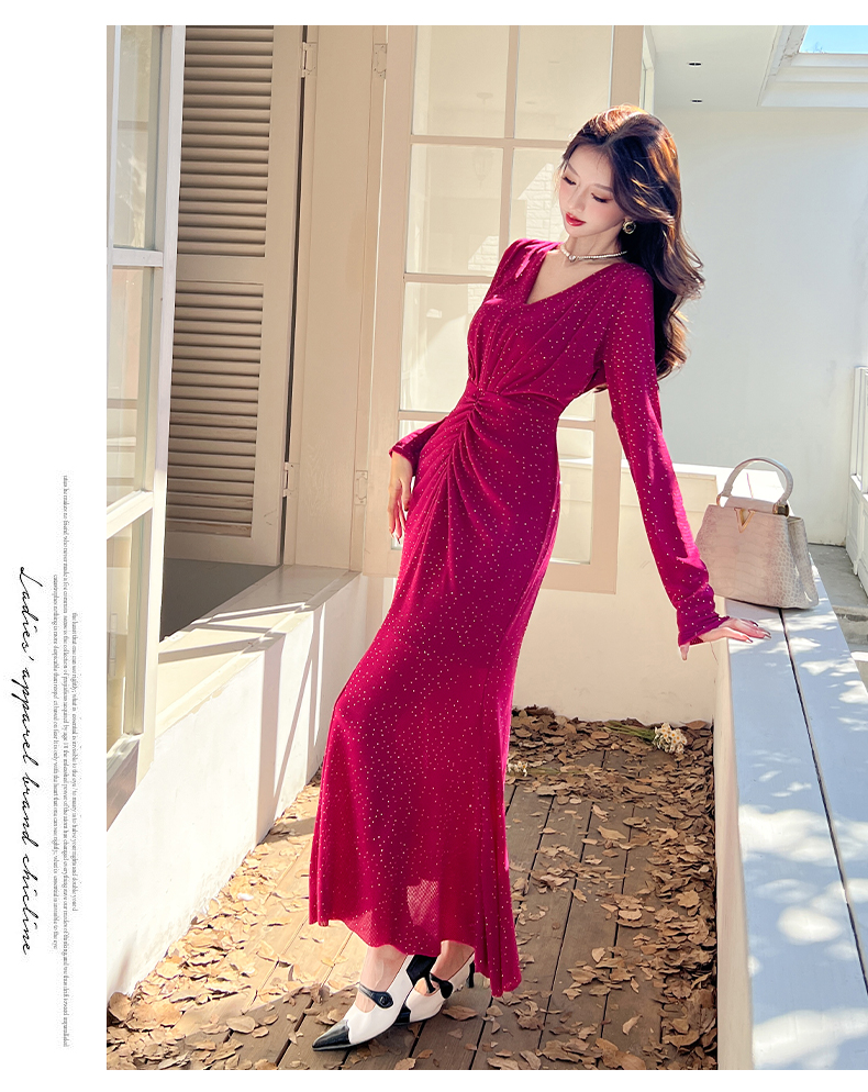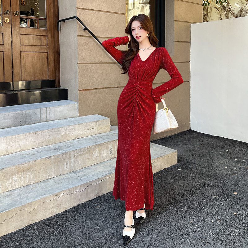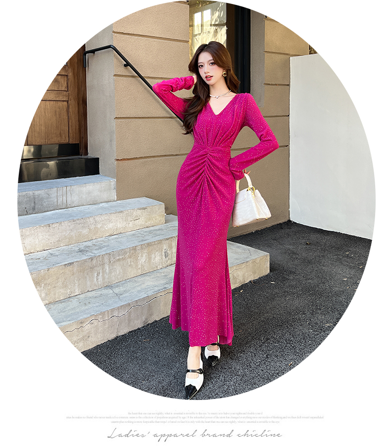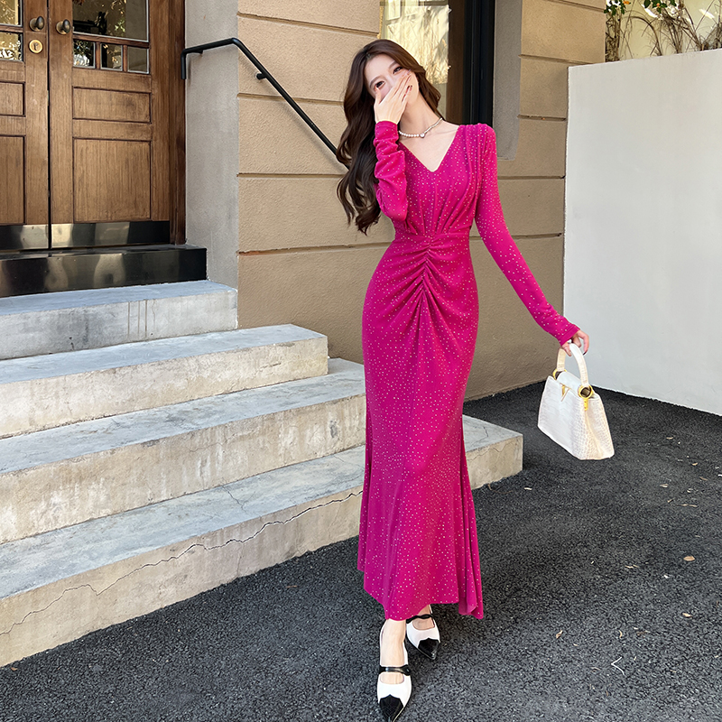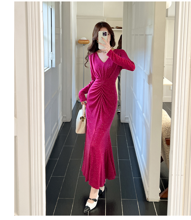 MY16014# 长袖v领长裙包臀连衣裙女裝貨源服裝批發