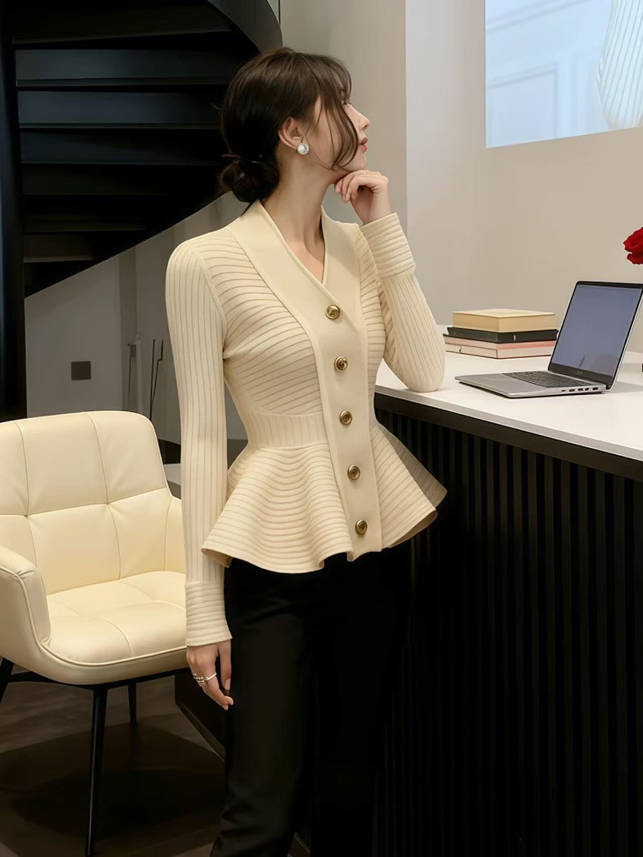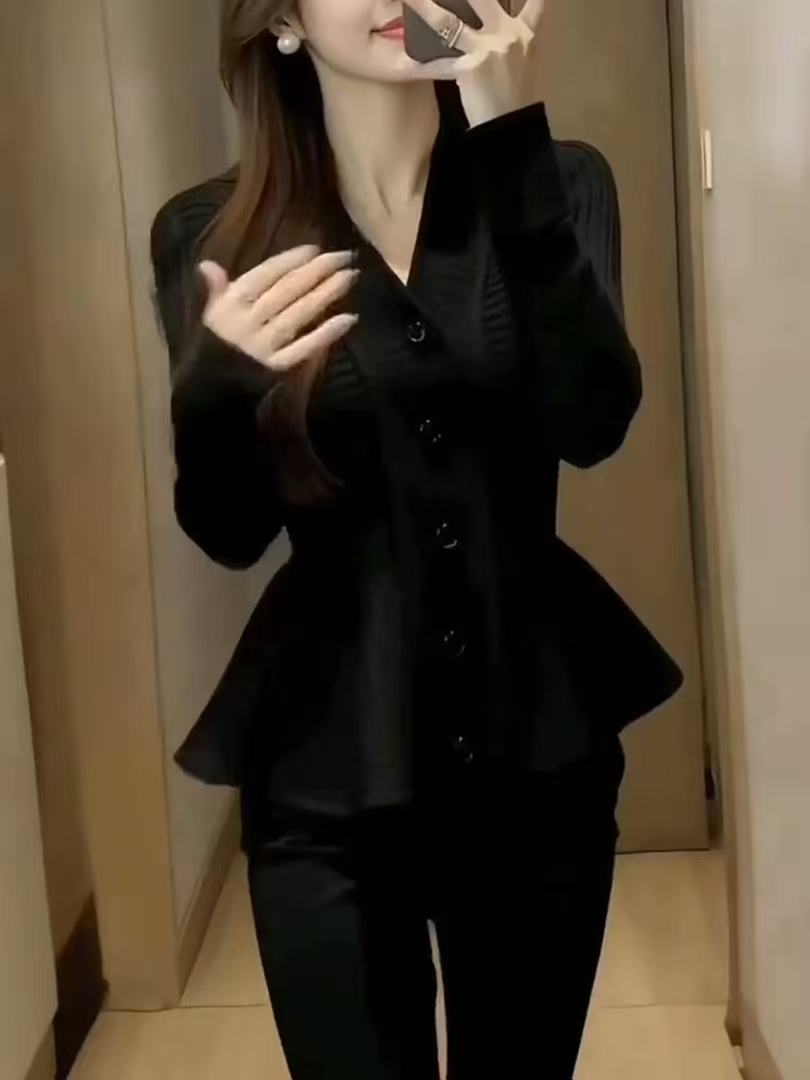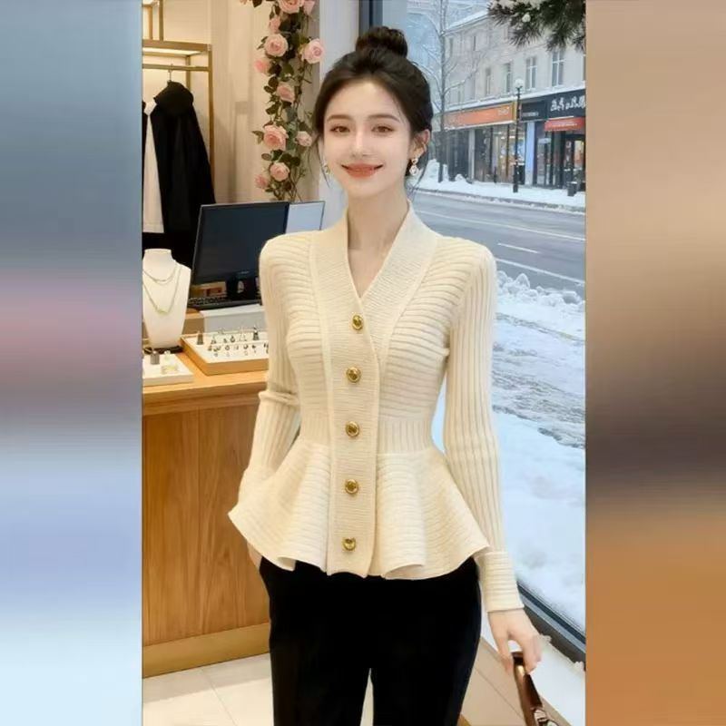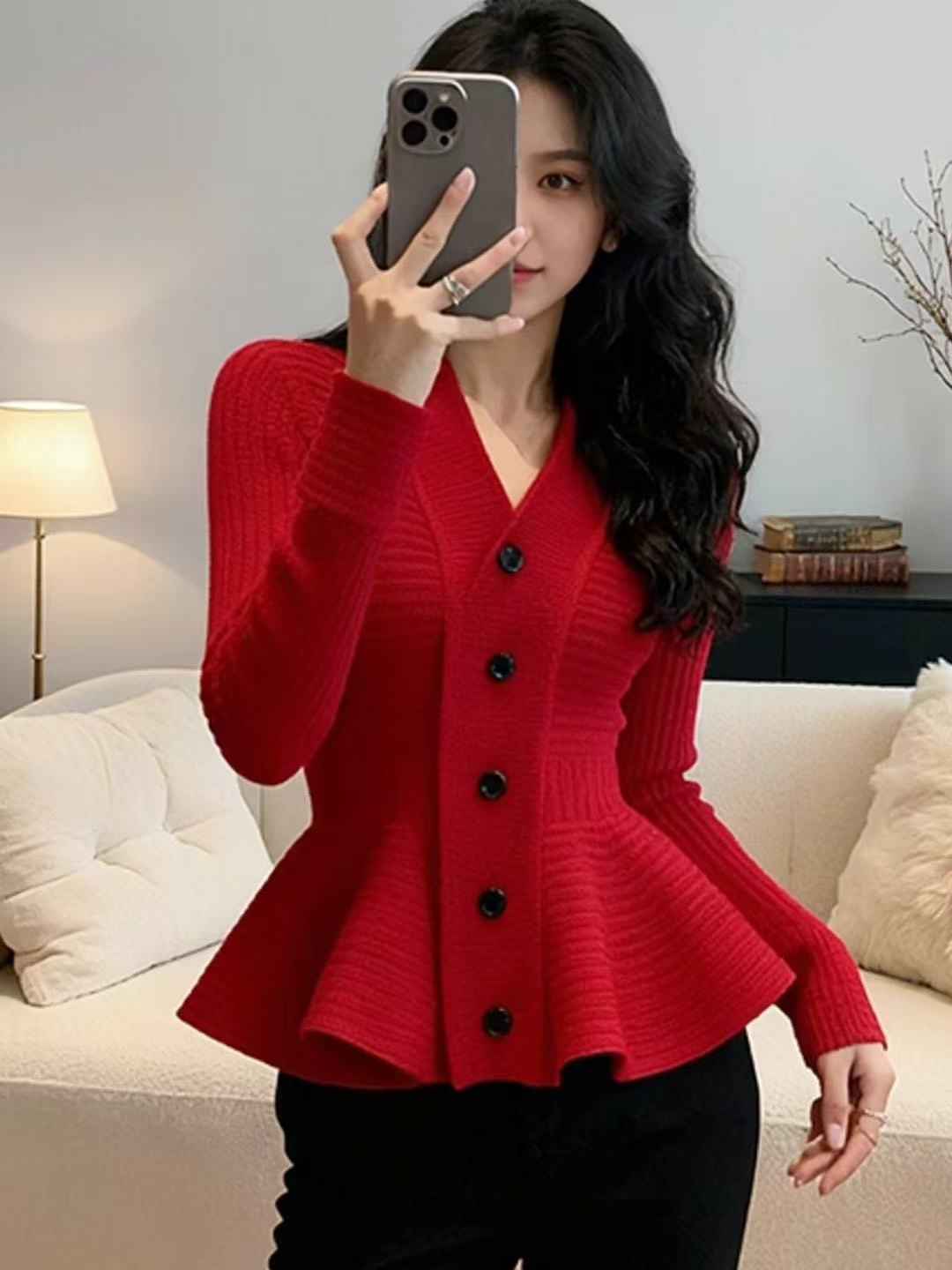 MY16017# 红色针织衫气质名媛巨好看时髦洋气收腰荷叶边打底上衣女女裝貨源服裝批發