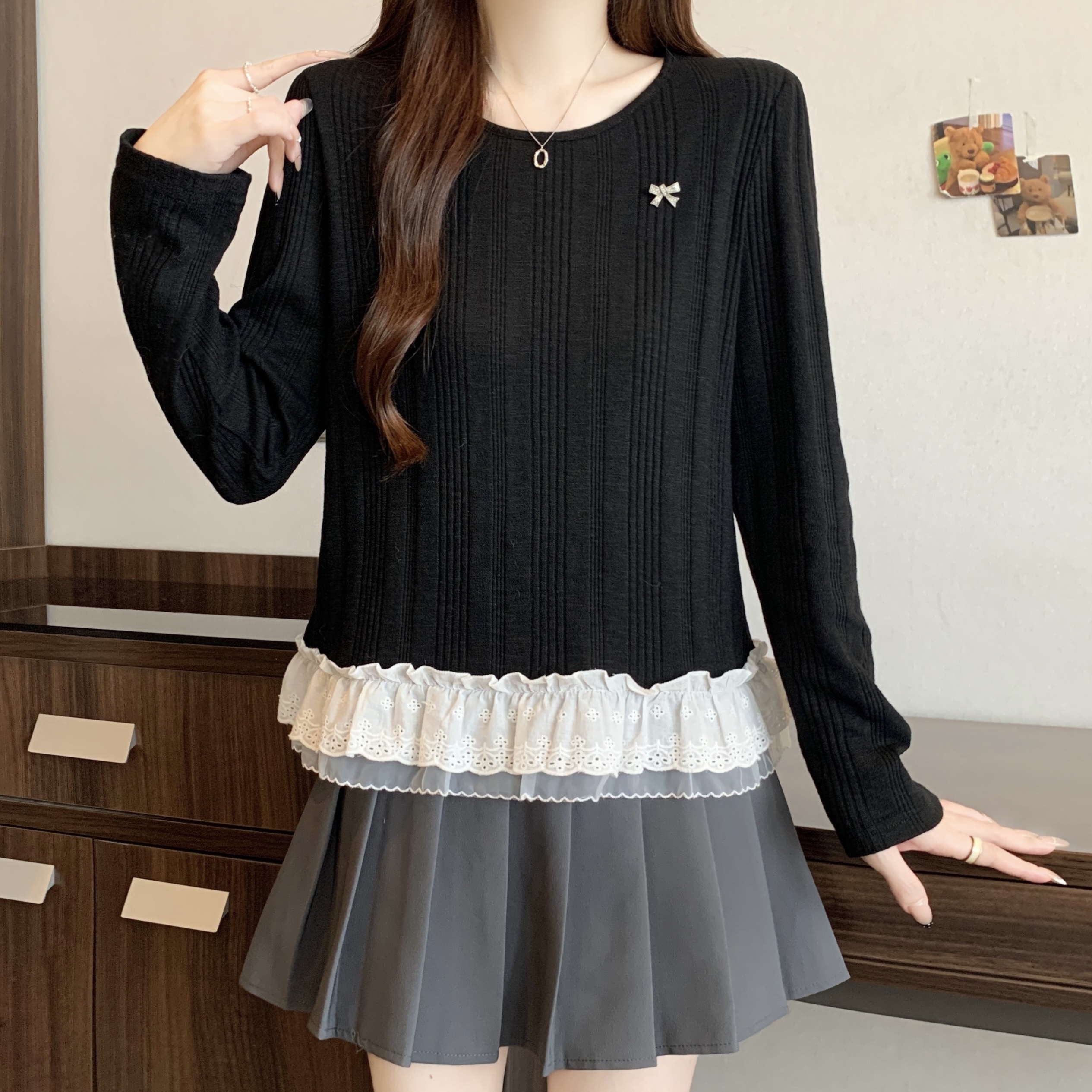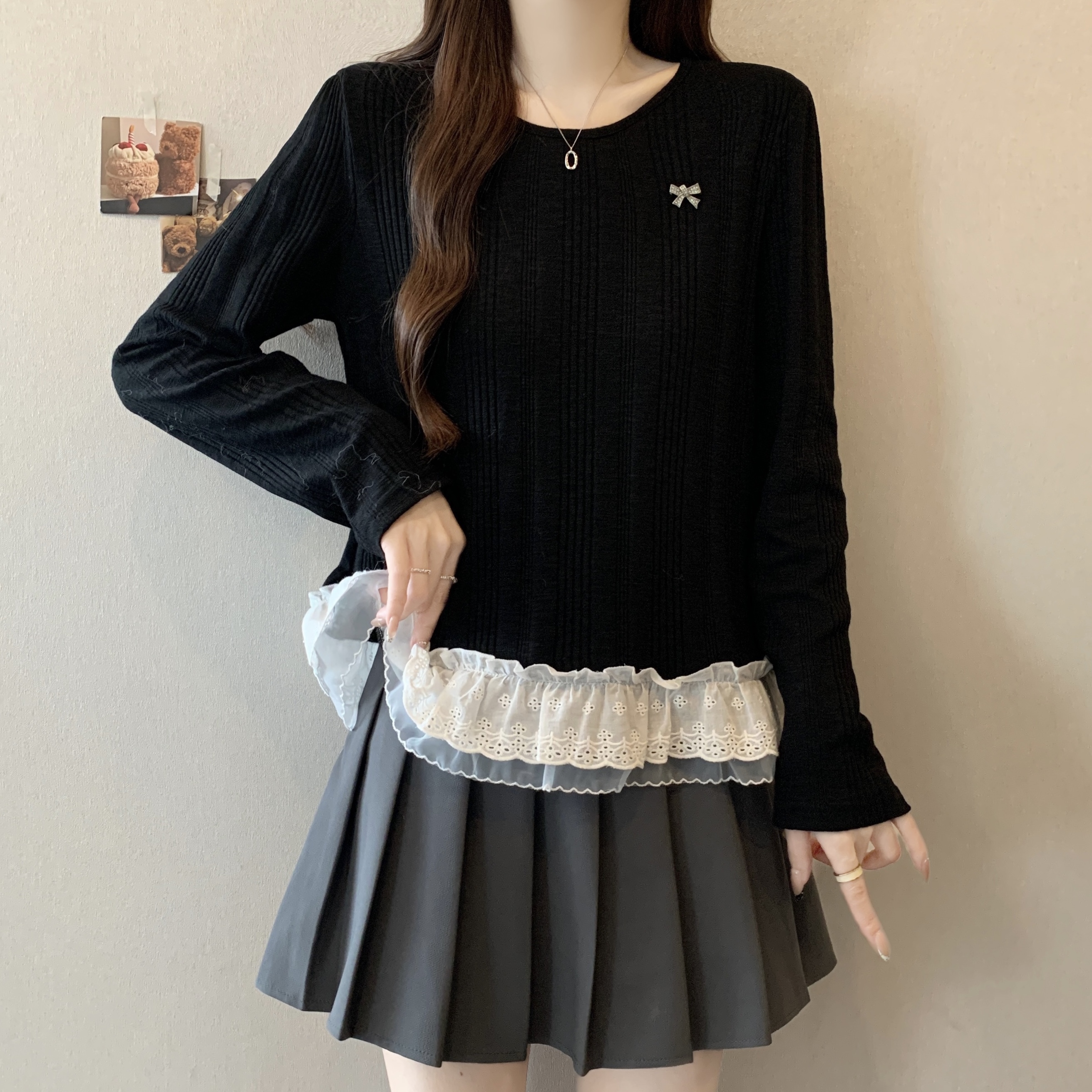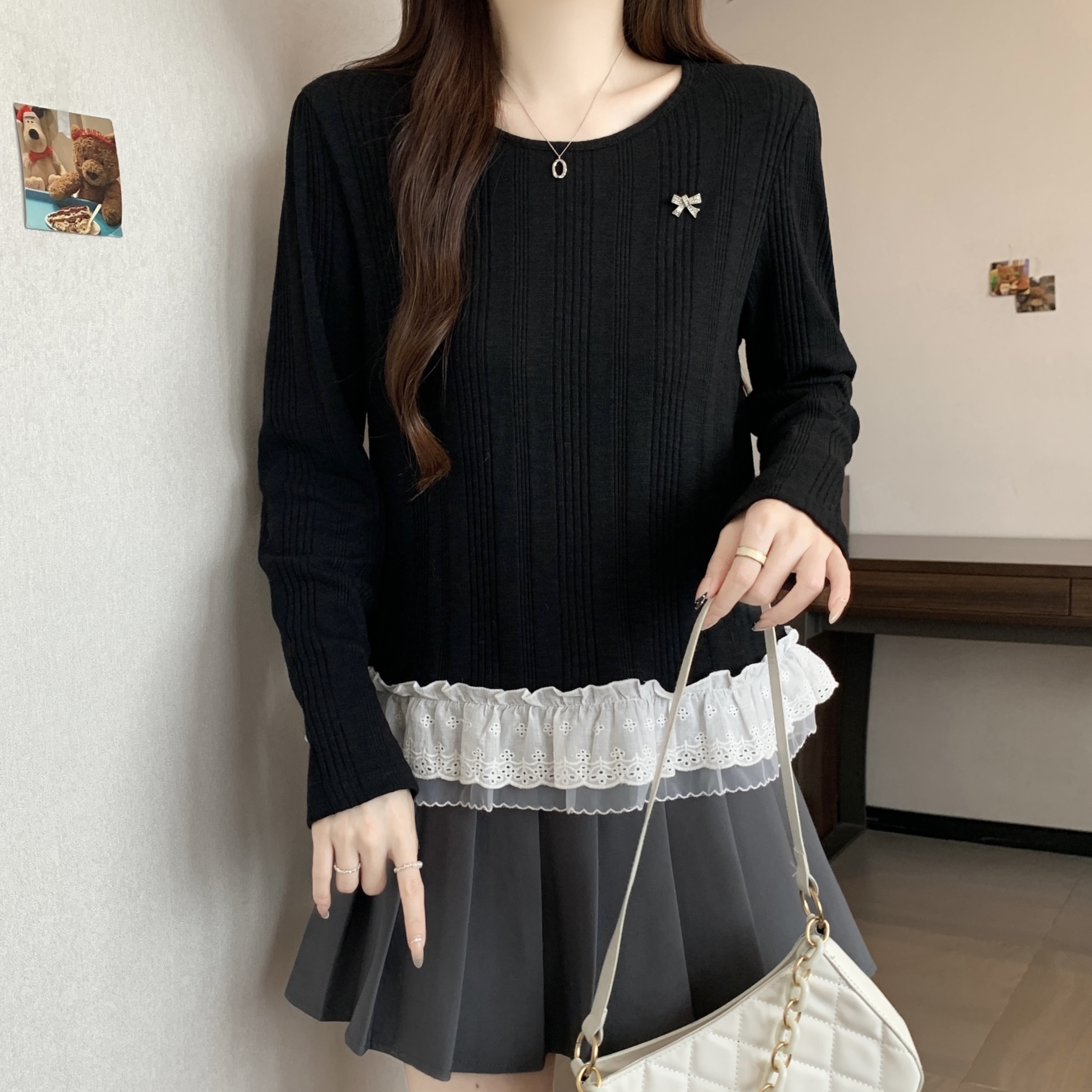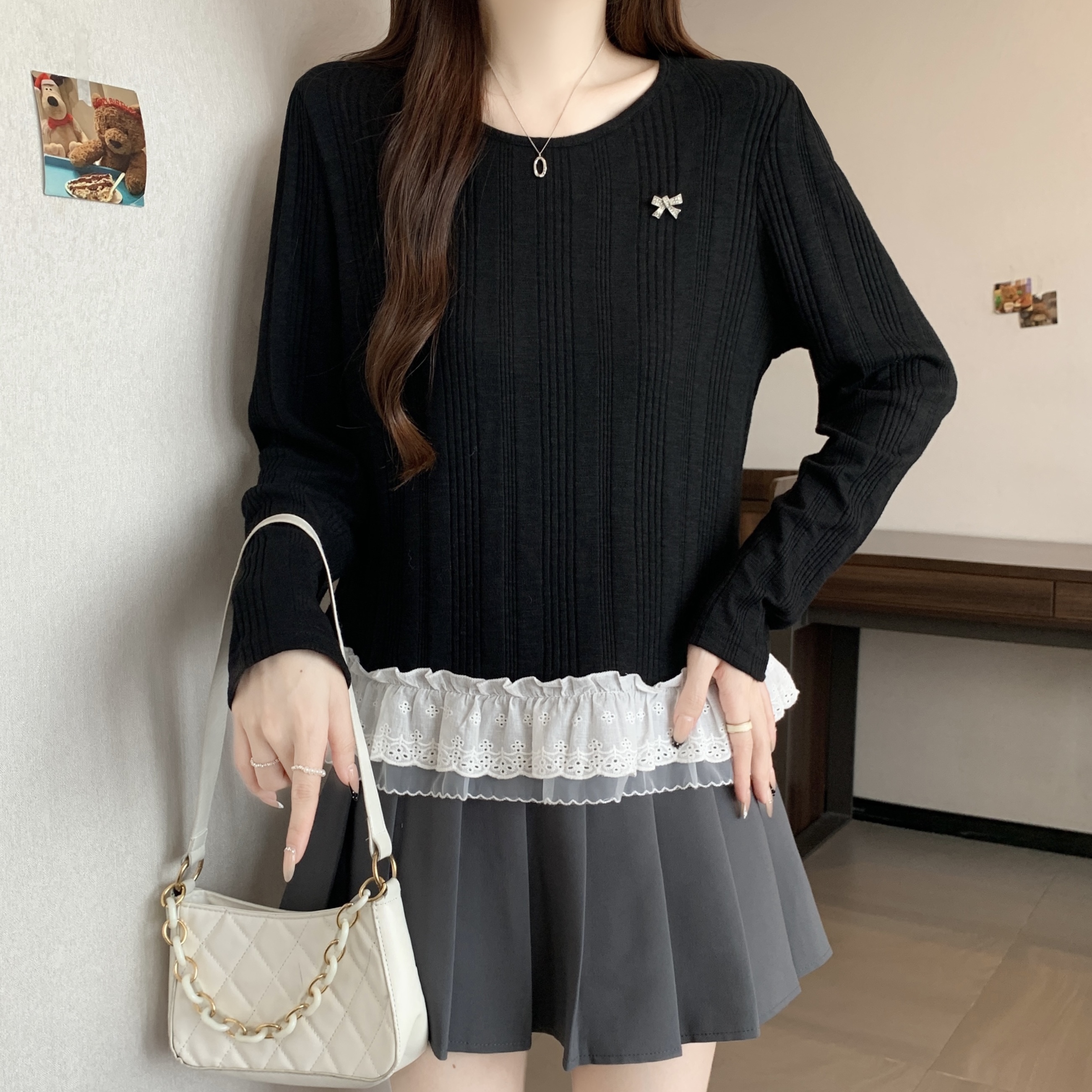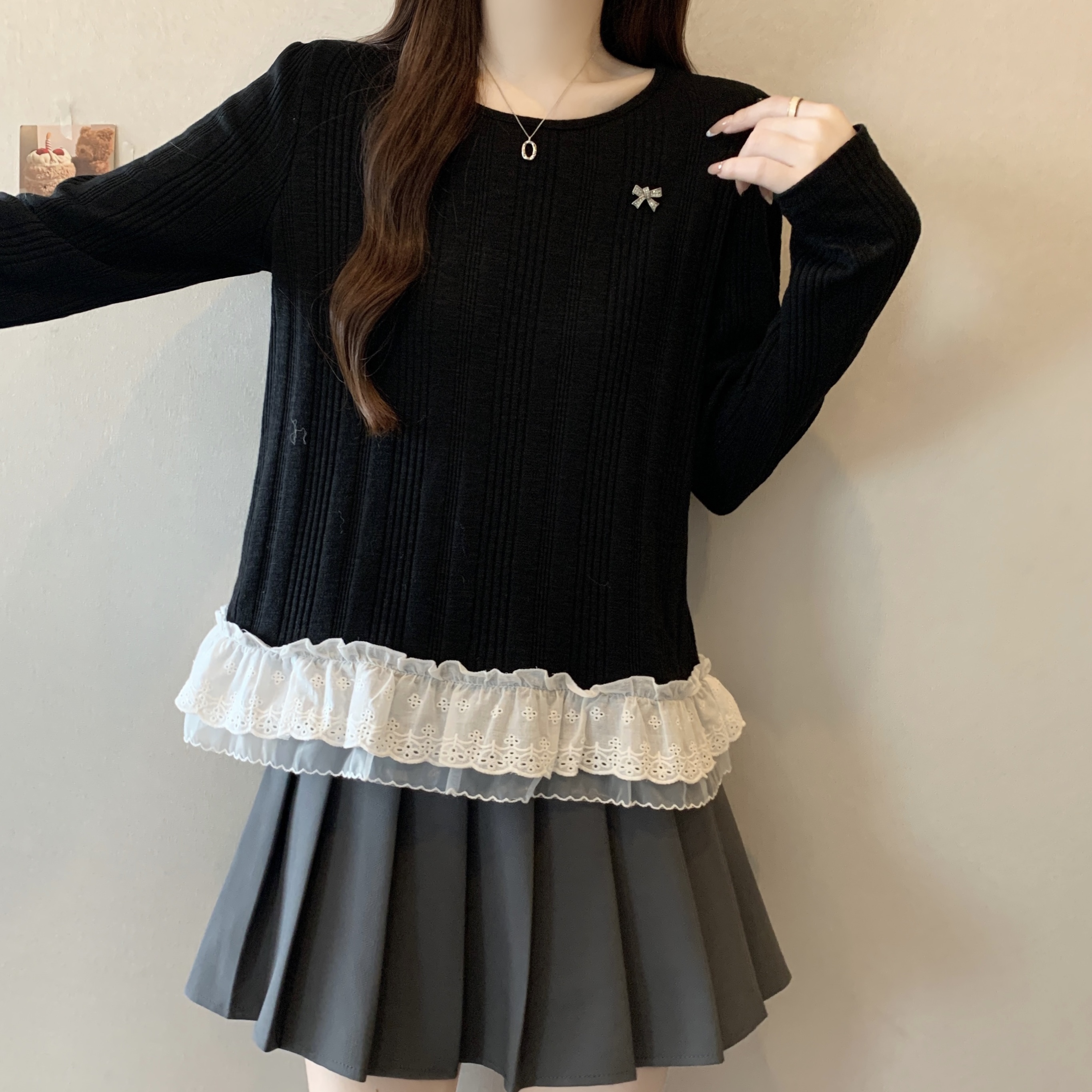 MY16021# 大码女装新款圆领长袖针织衫蕾丝下摆花边宽松显瘦上衣女裝貨源服裝批發