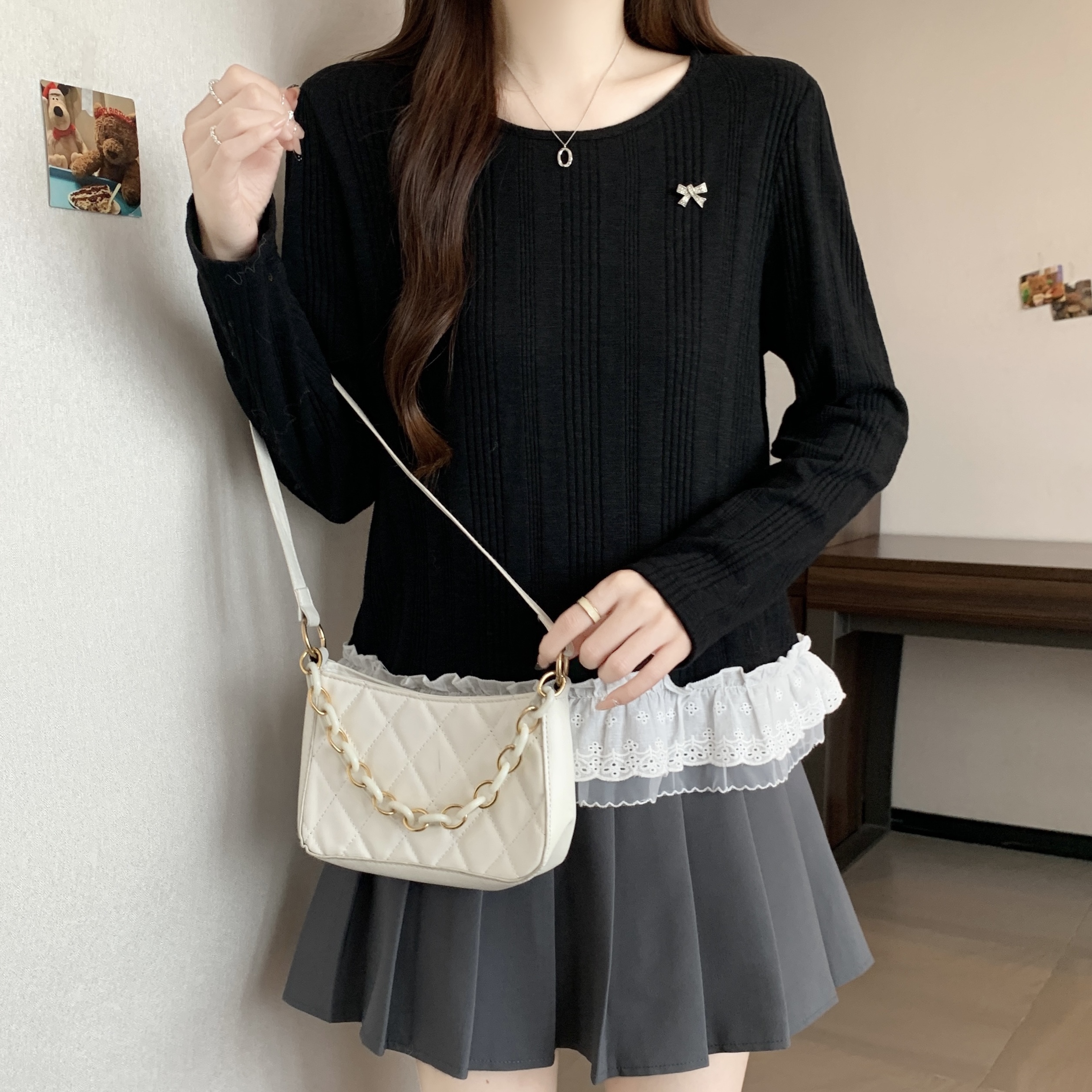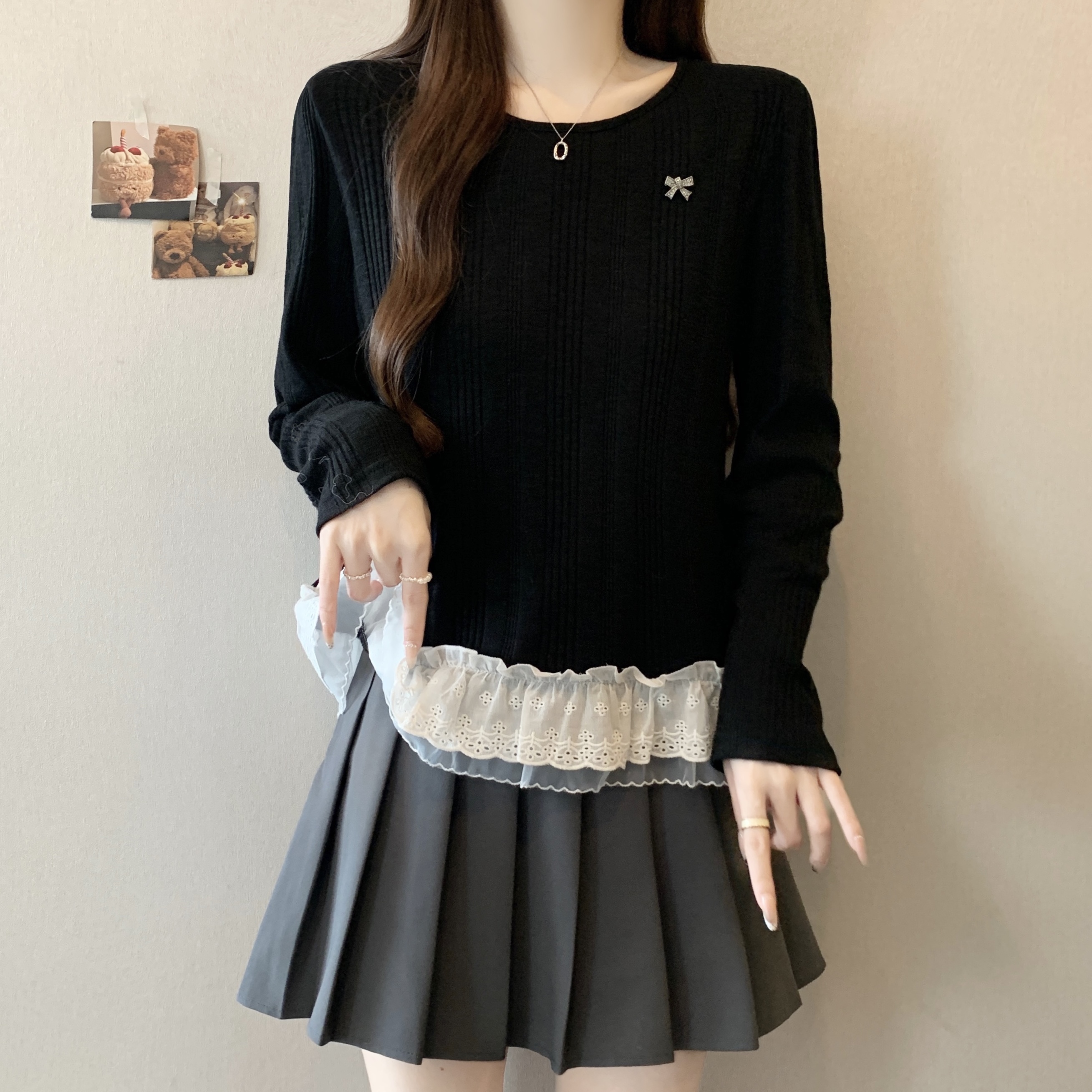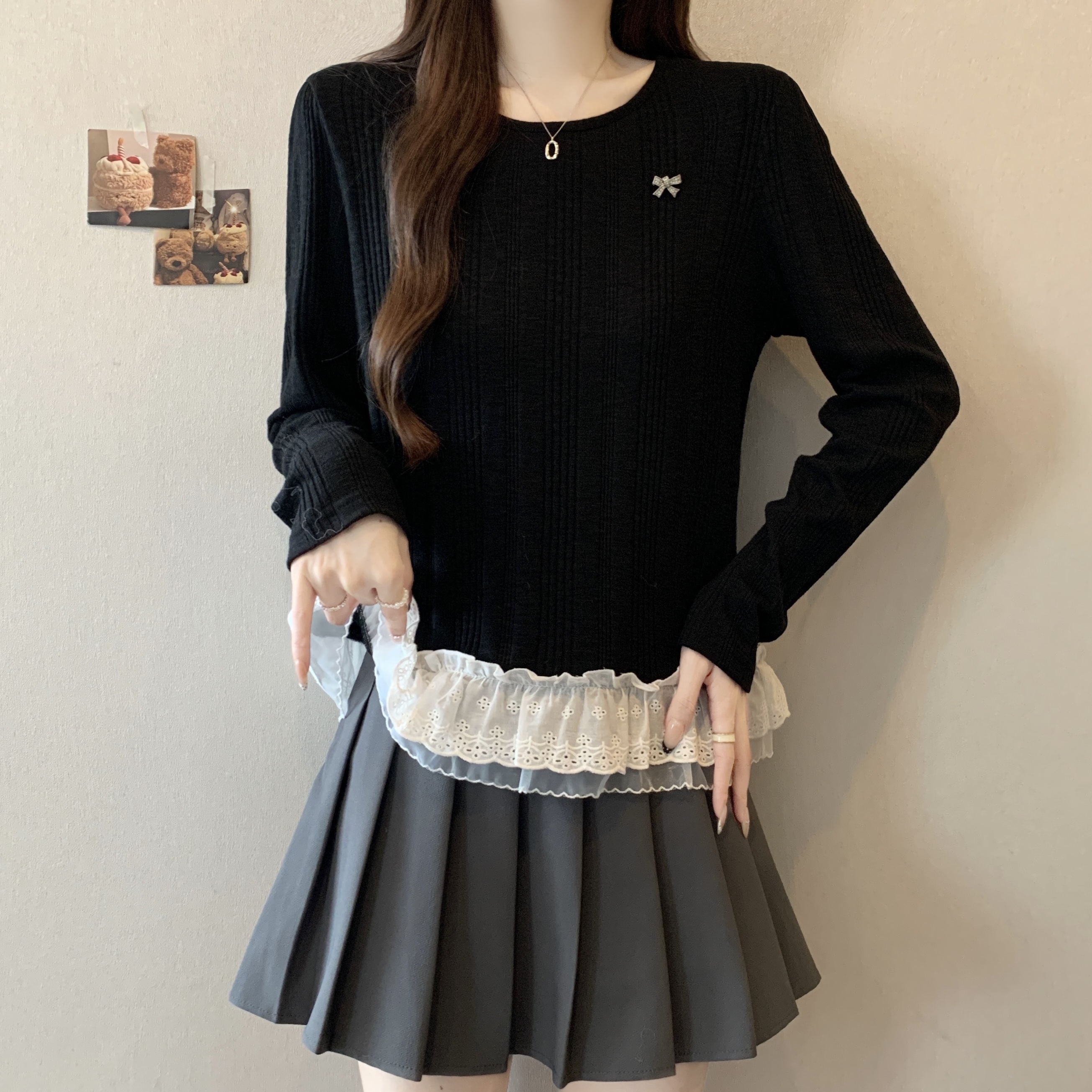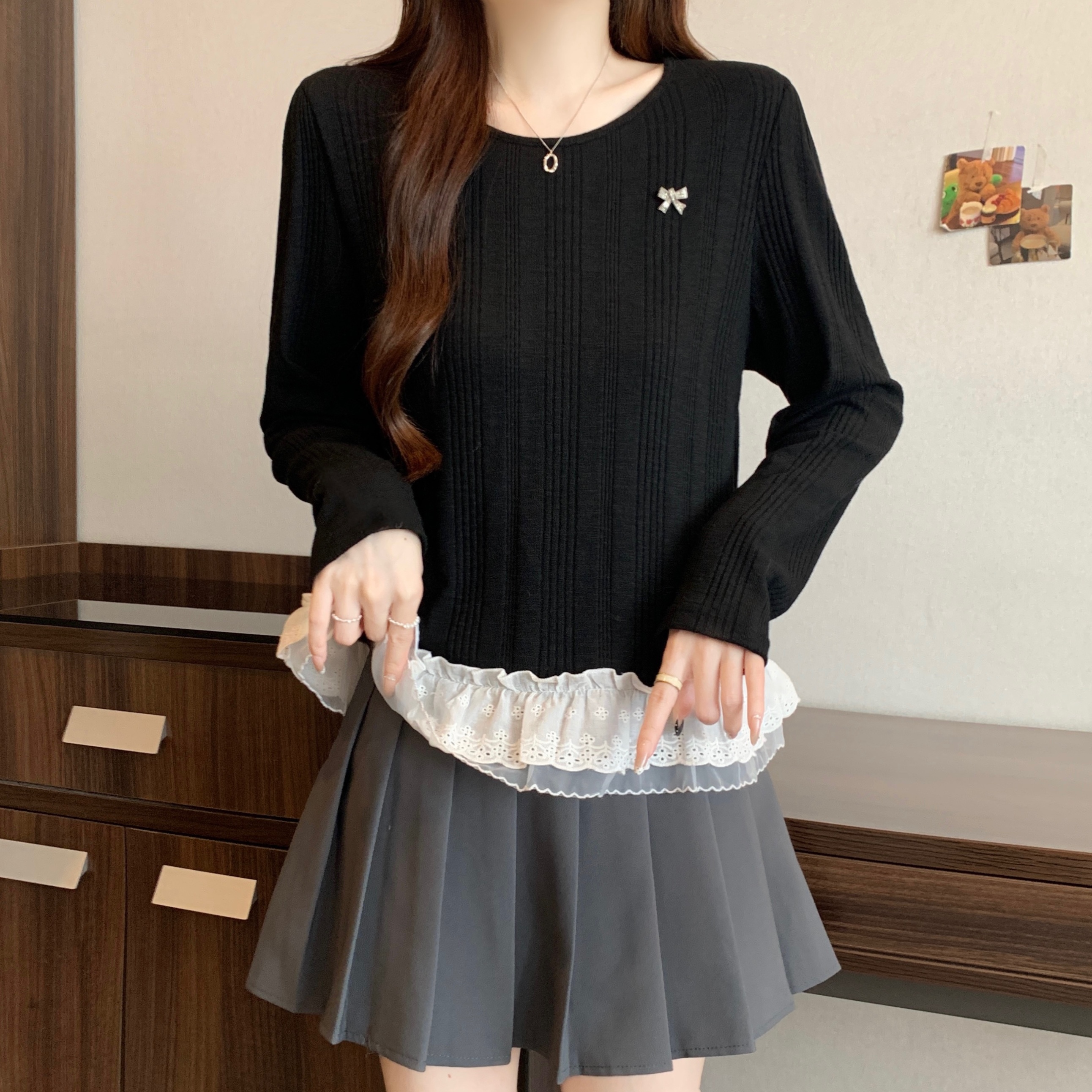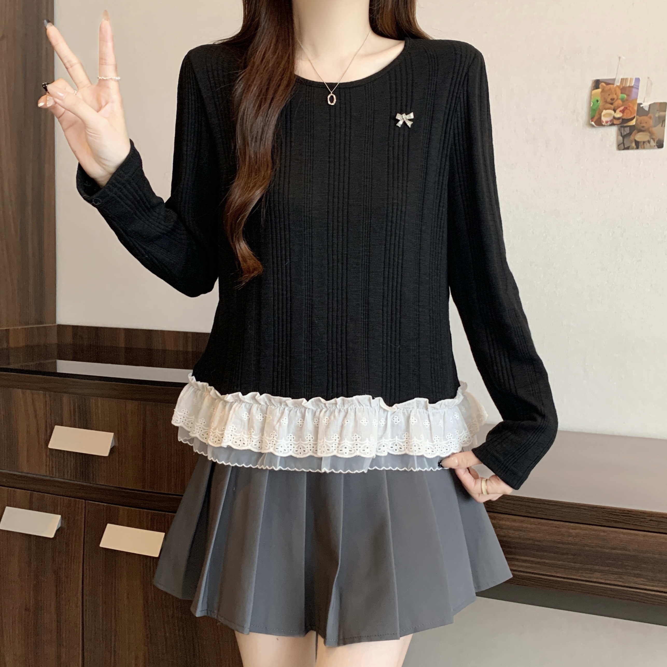 MY16021# 大码女装新款圆领长袖针织衫蕾丝下摆花边宽松显瘦上衣女裝貨源服裝批發