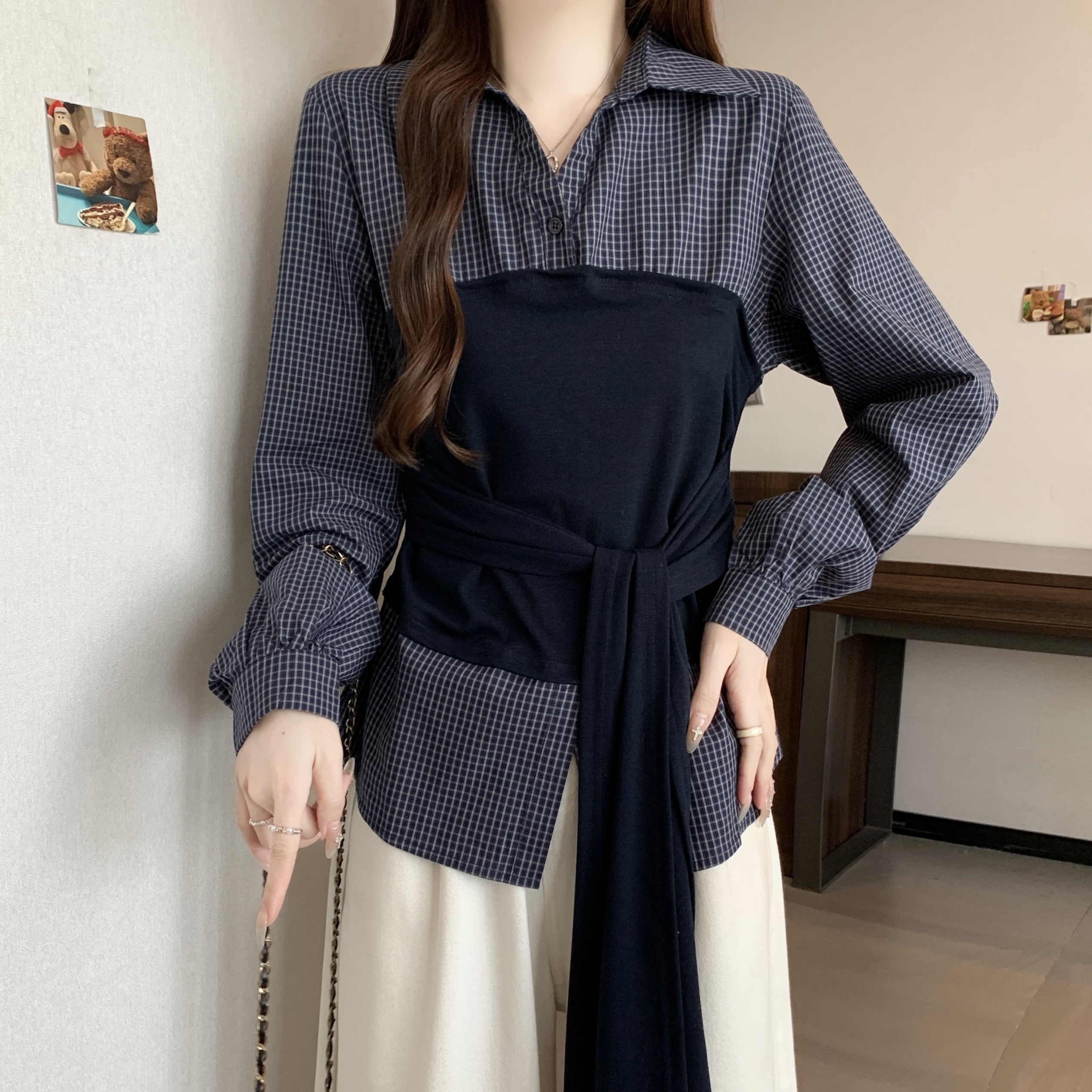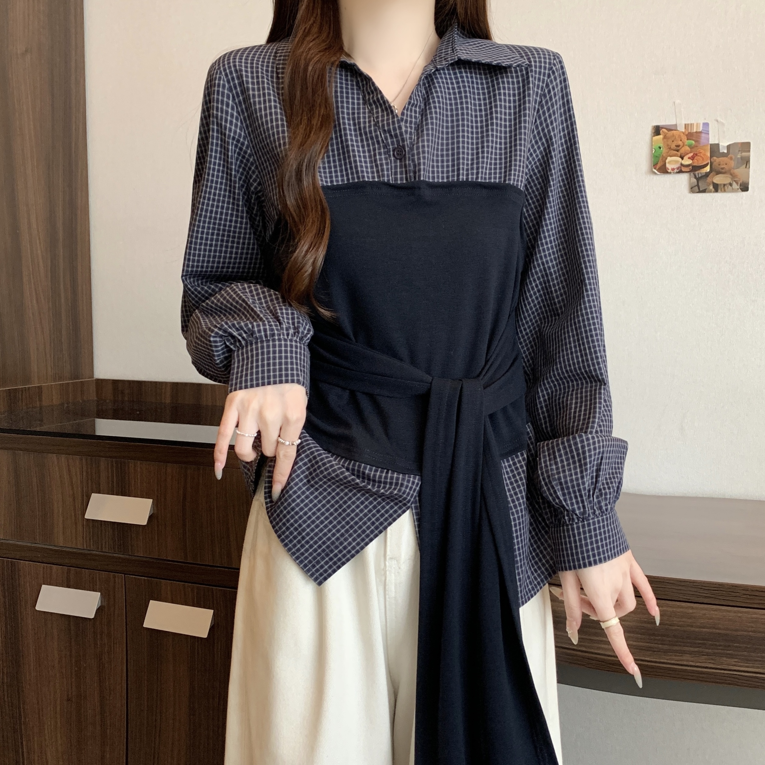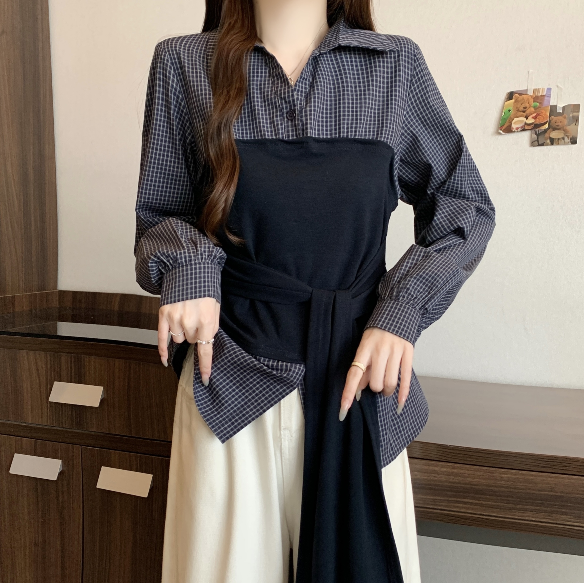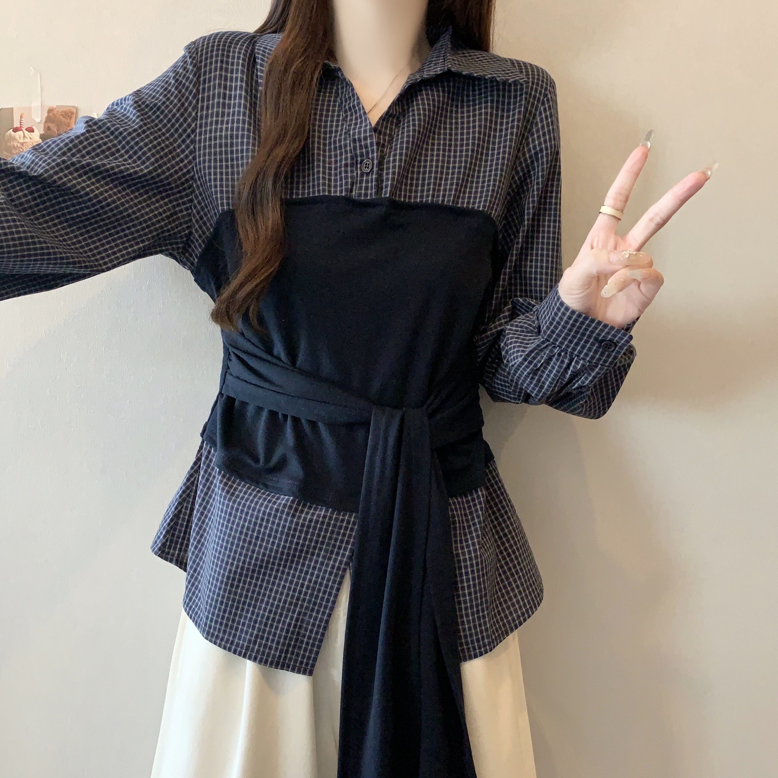 MY16023# 大码胖MM新款假两件收腰长袖衬衫女设计感绑带格子上衣女裝貨源服裝批發