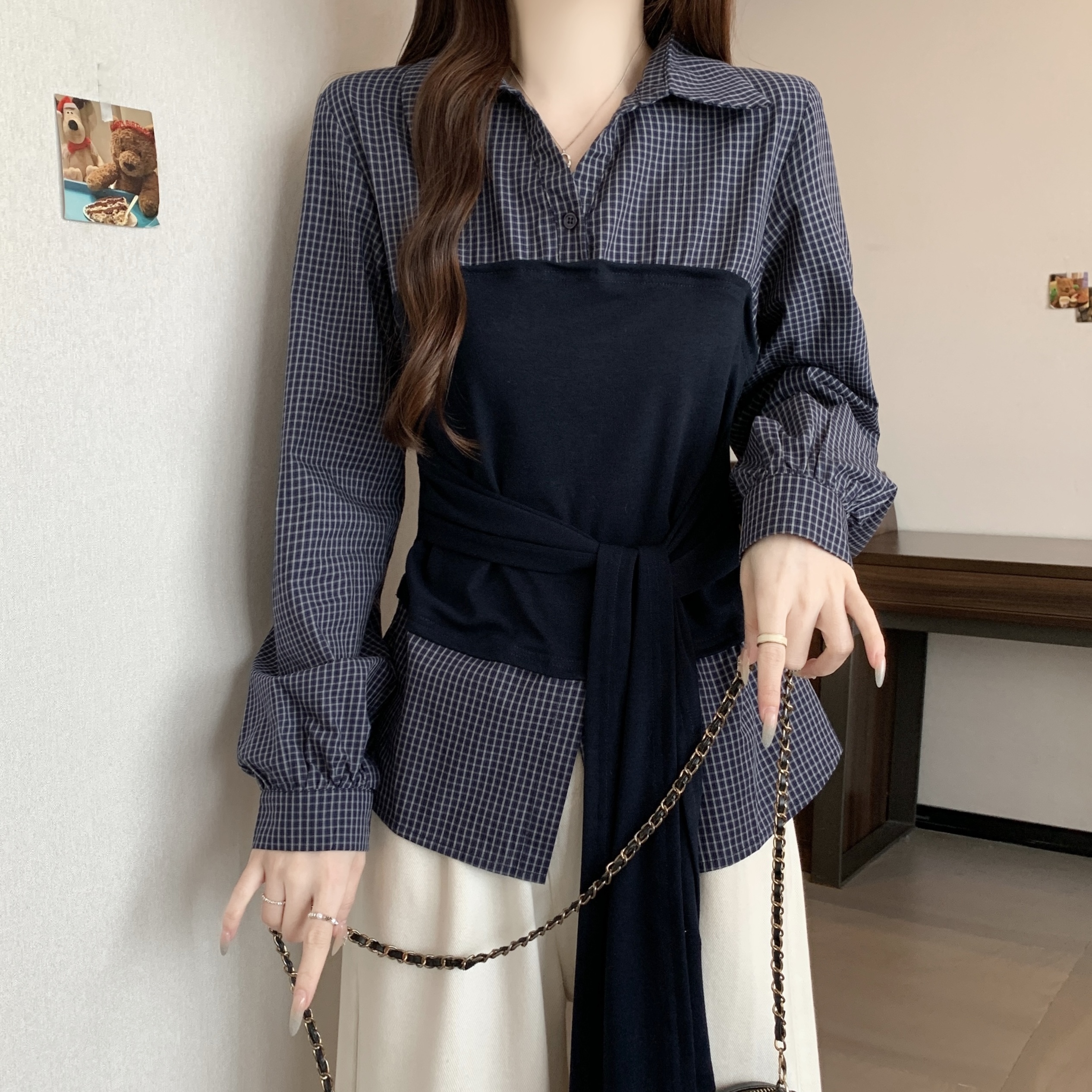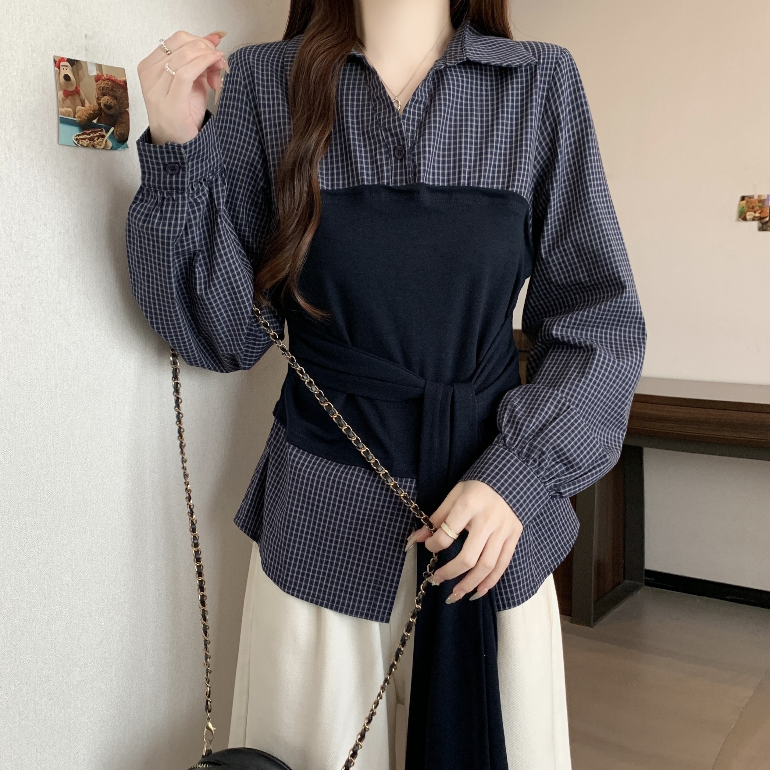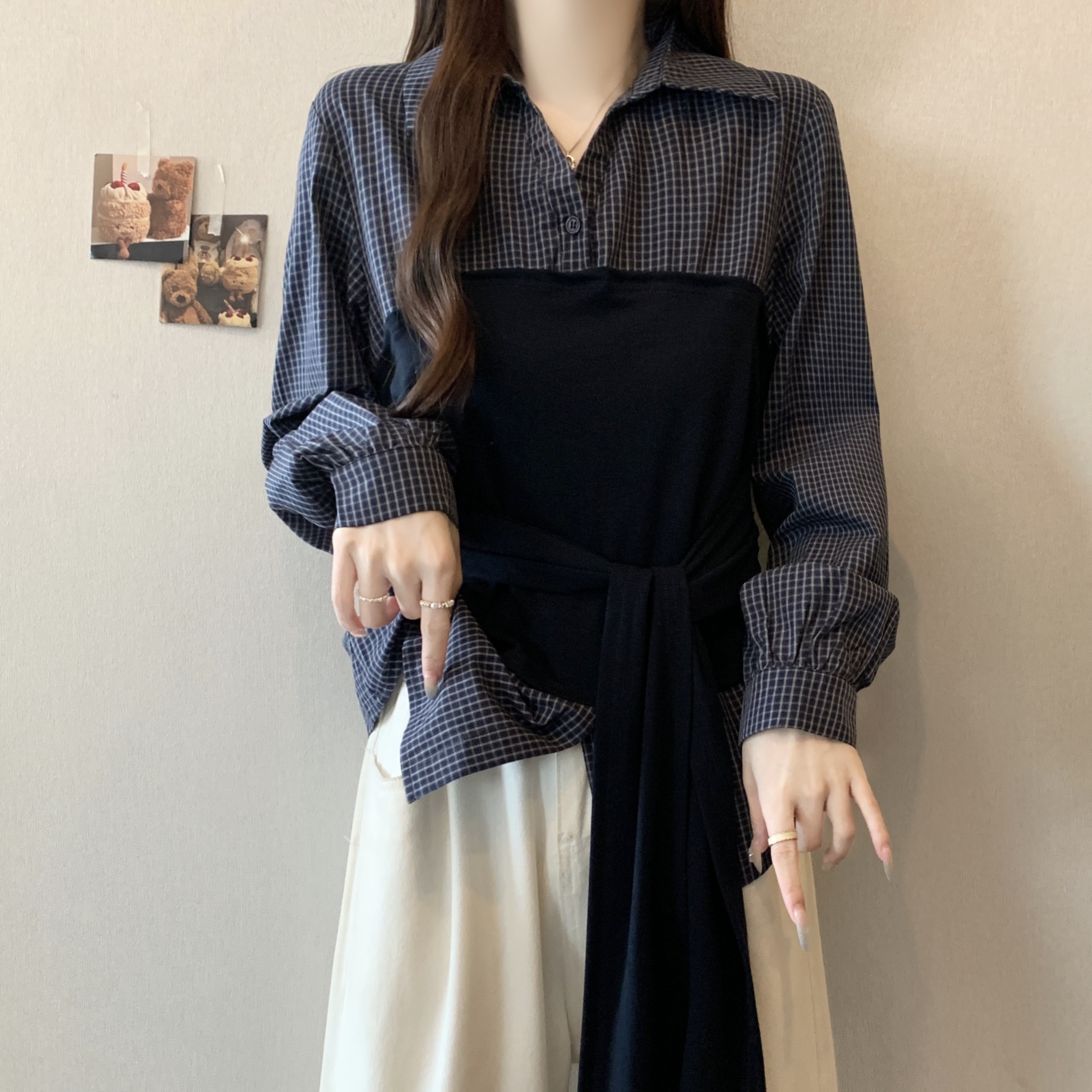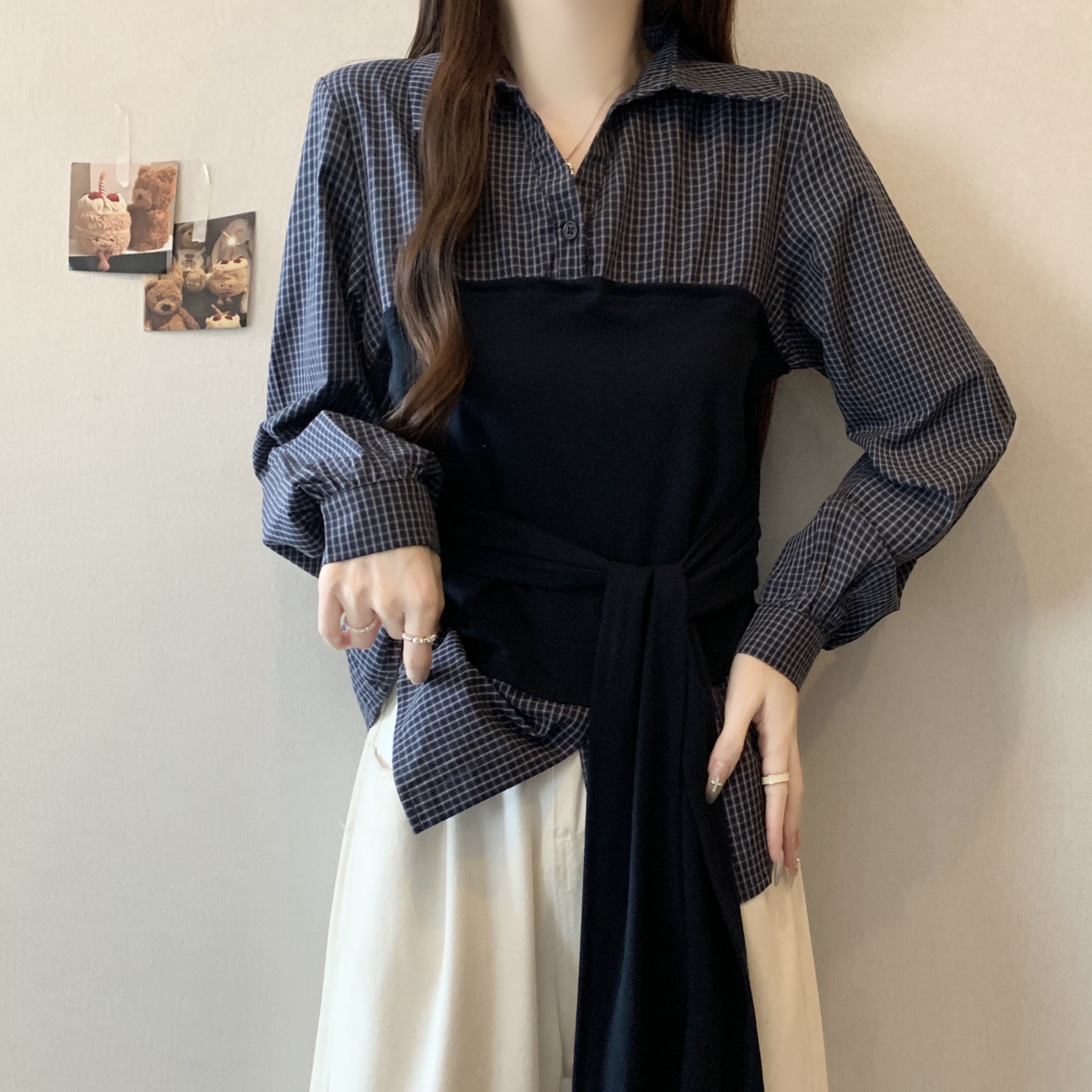 MY16023# 大码胖MM新款假两件收腰长袖衬衫女设计感绑带格子上衣女裝貨源服裝批發
