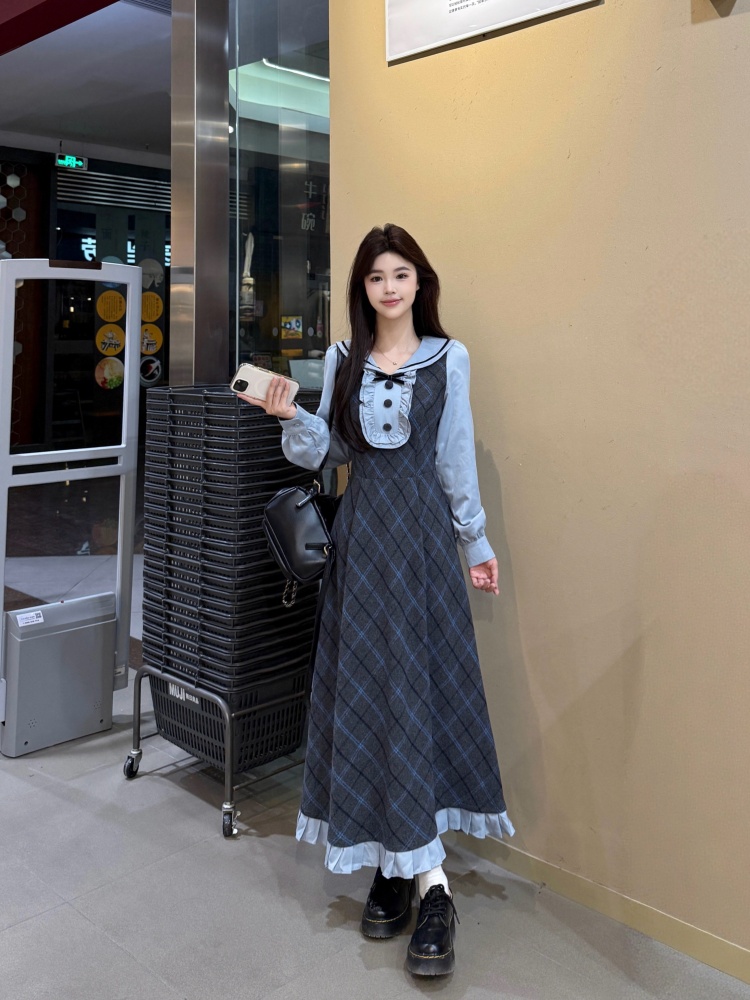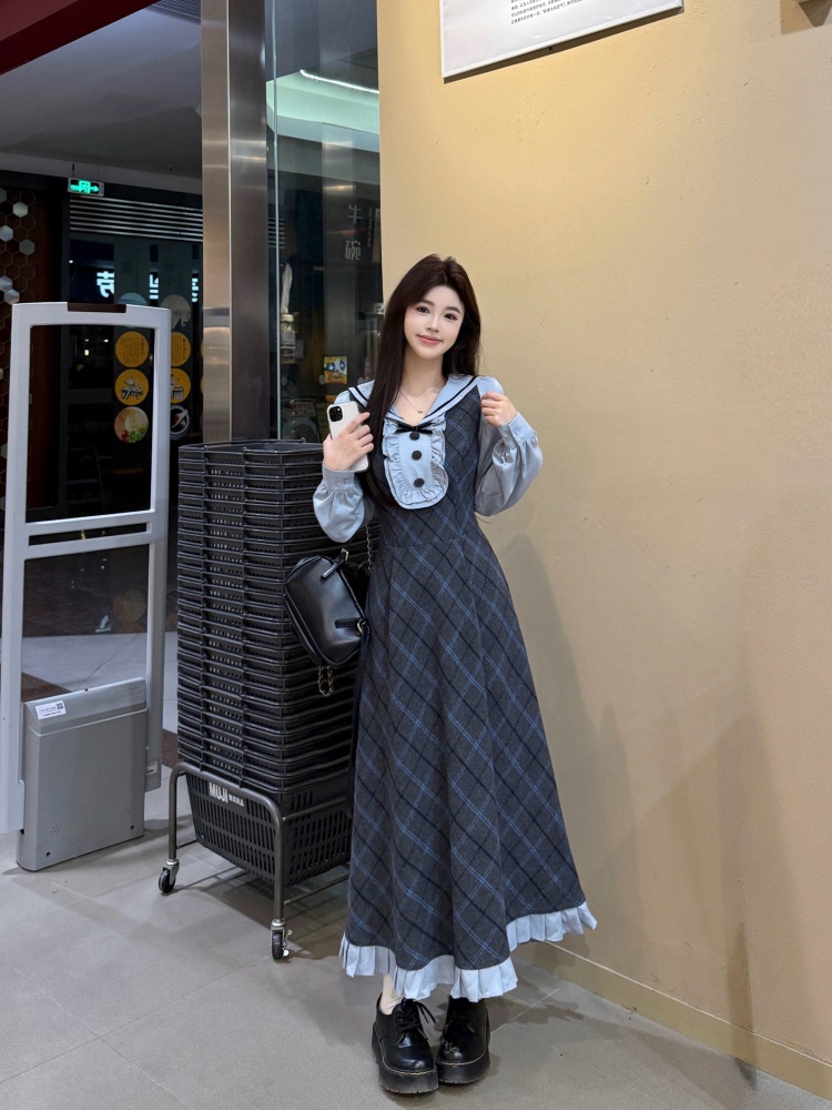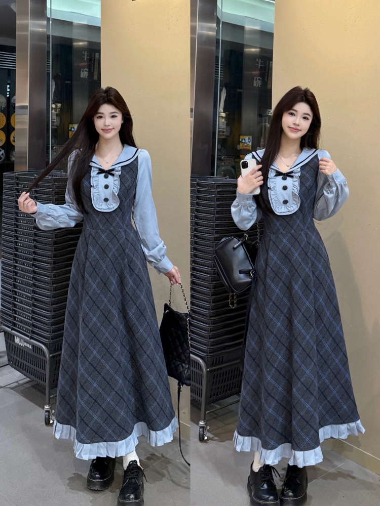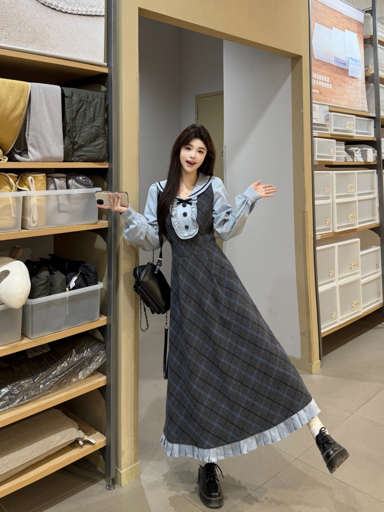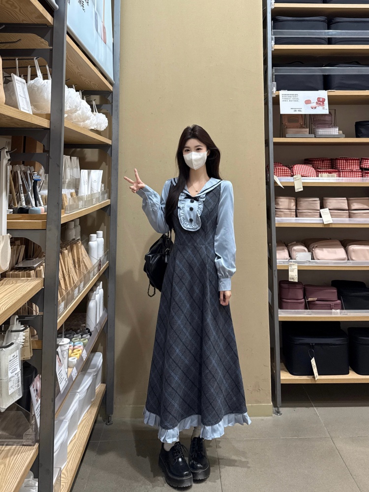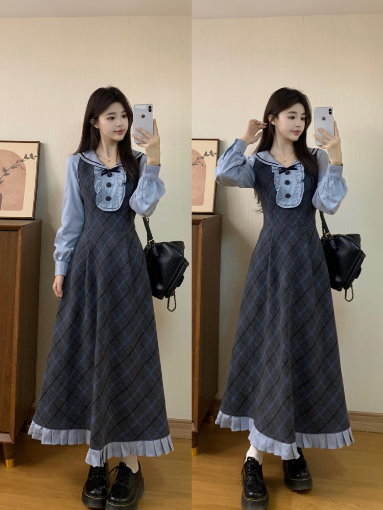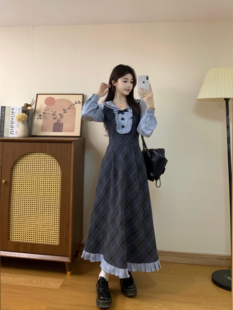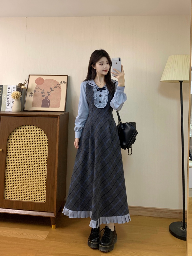 MY16029# 法式设计感假两件撞色连衣裙新款学院风减龄长款裙子女裝貨源服裝批發