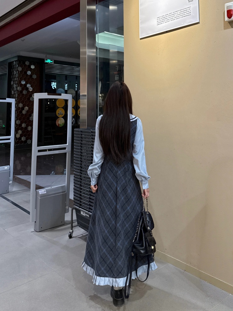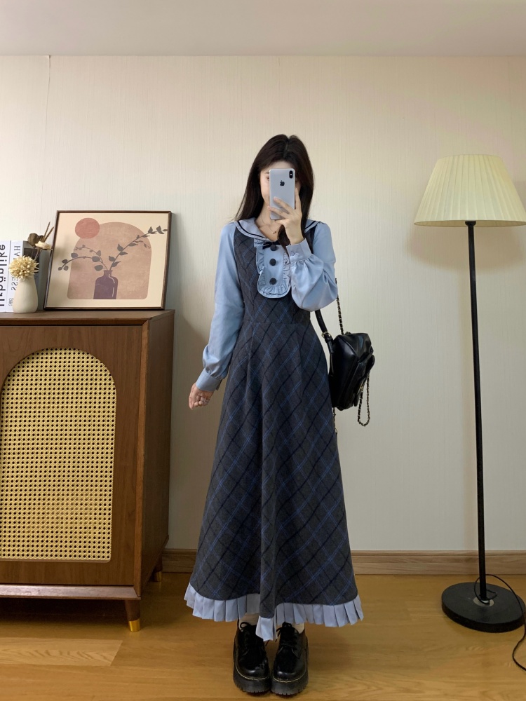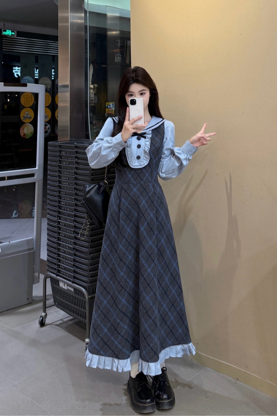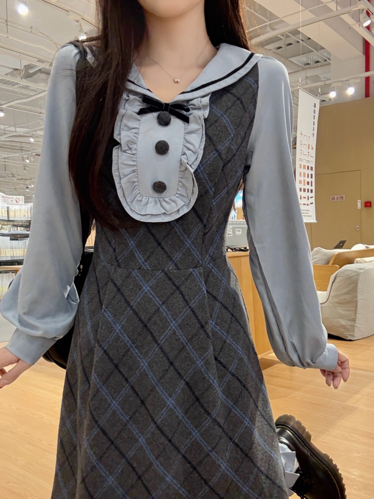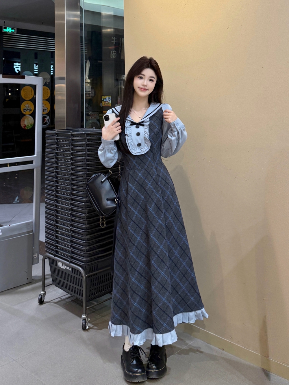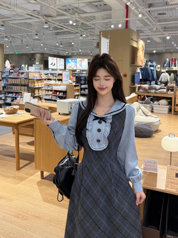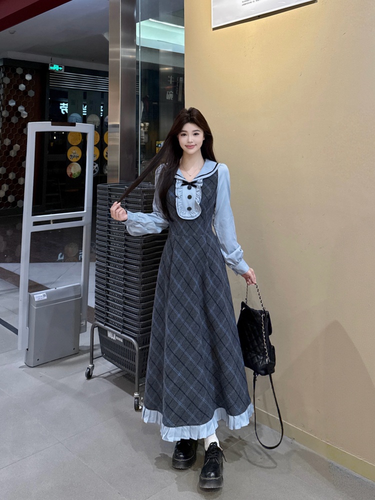 MY16029# 法式设计感假两件撞色连衣裙新款学院风减龄长款裙子女裝貨源服裝批發