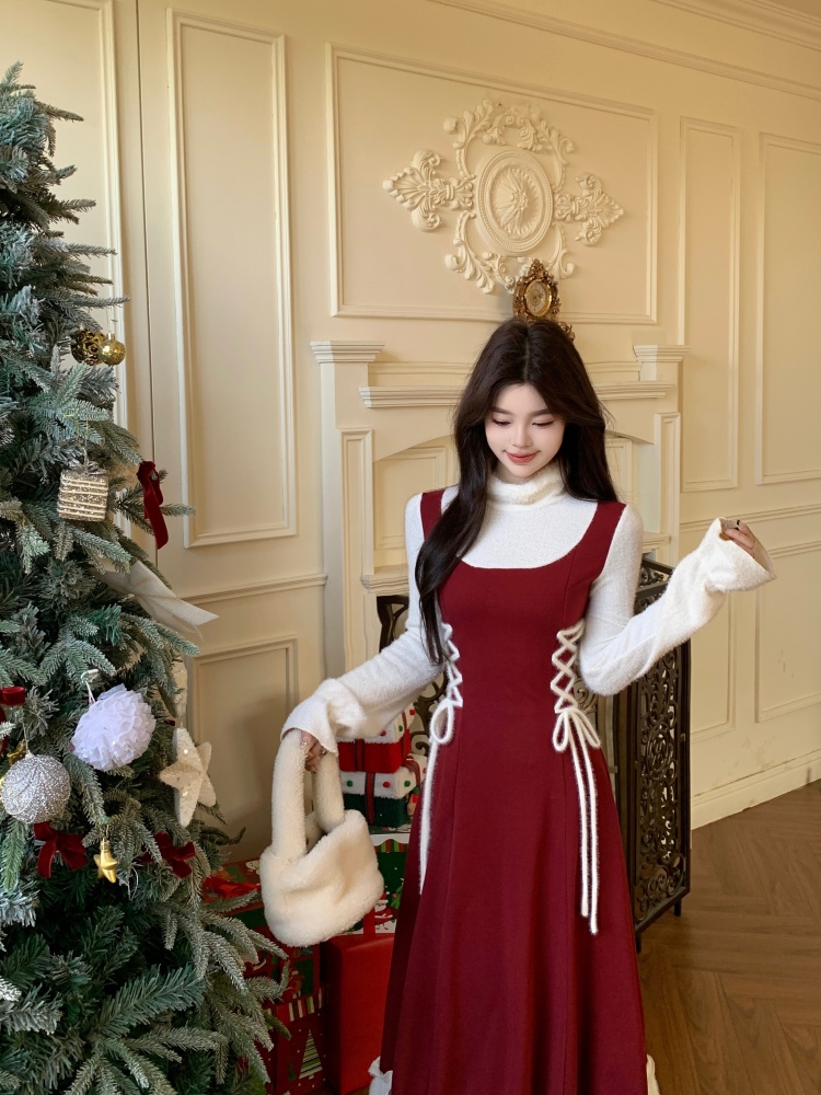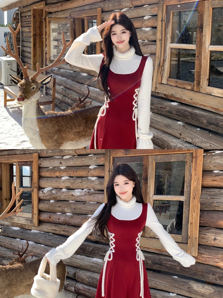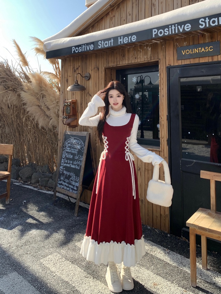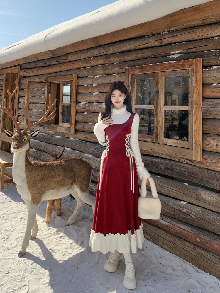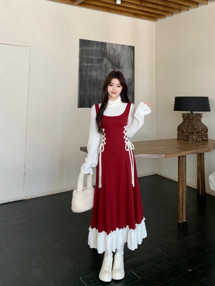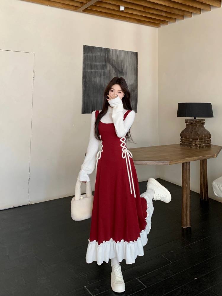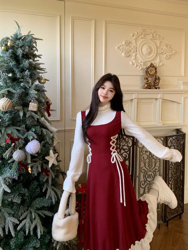 MY16030# 学院风红白撞色新款长袖连衣裙磨毛针织弹力收腰显瘦裙子女裝貨源服裝批發